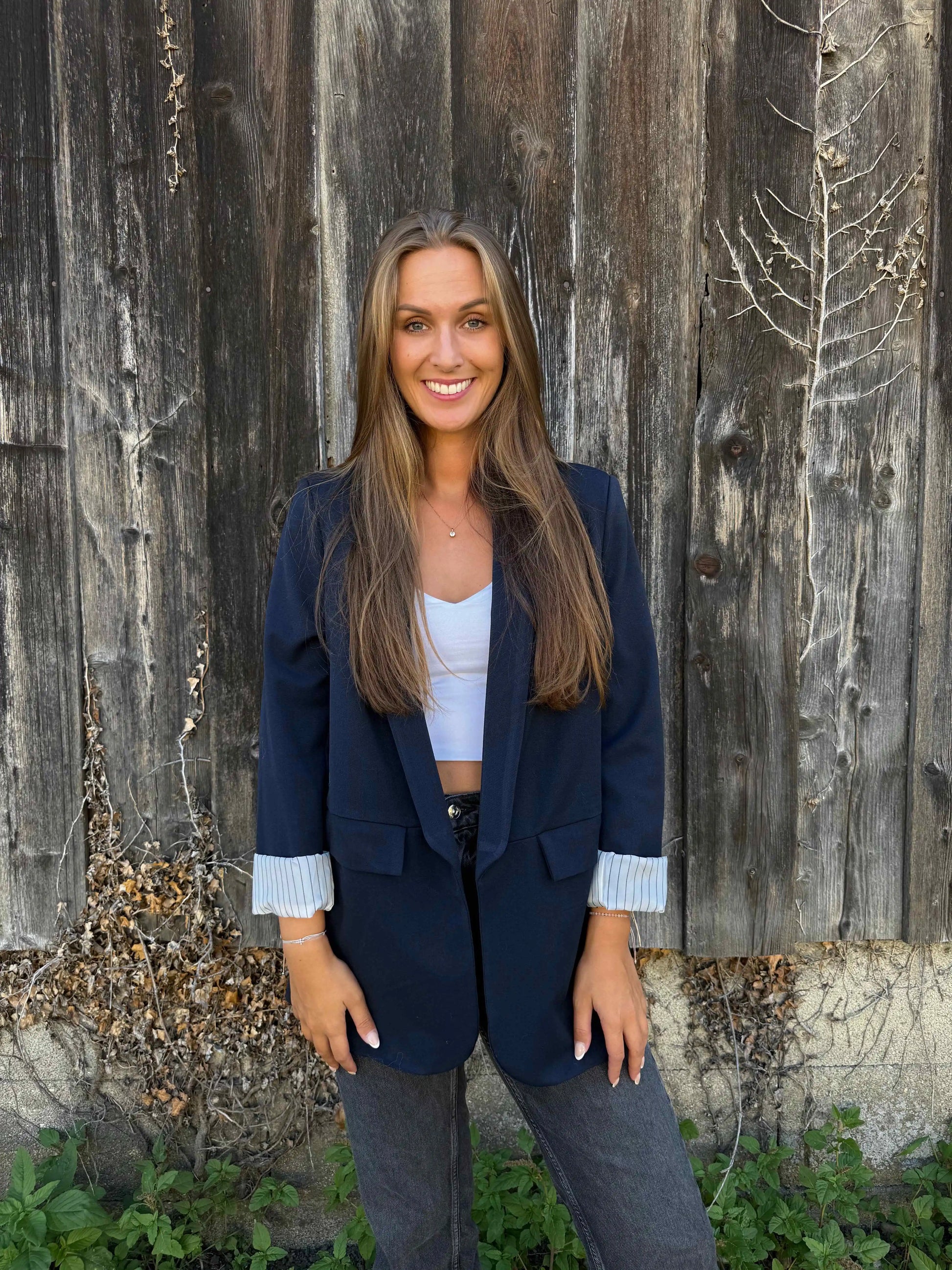 Klassisch trifft modern – dieser Blazer mit aufgerollten Ärmelbündchen in Streifenoptik verleiht jedem Outfit eine schicke, aber lässige Note. Perfekt für Büro, Alltag oder stylische City-Looks.