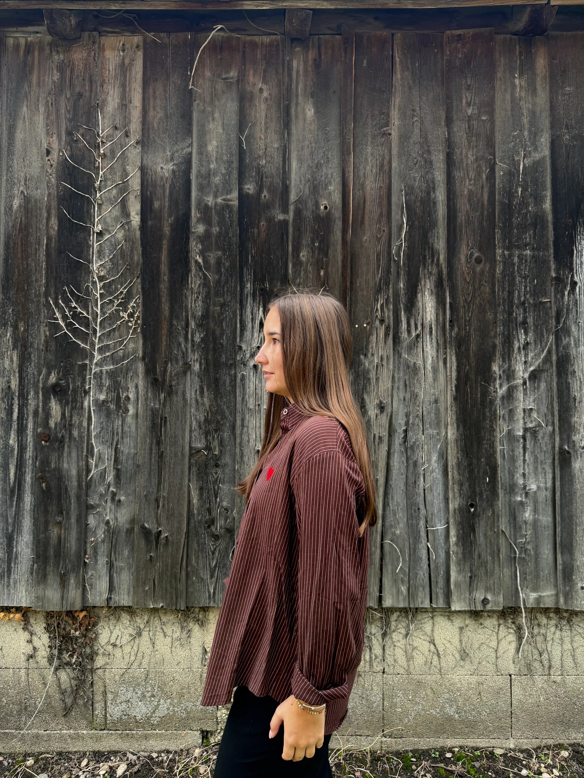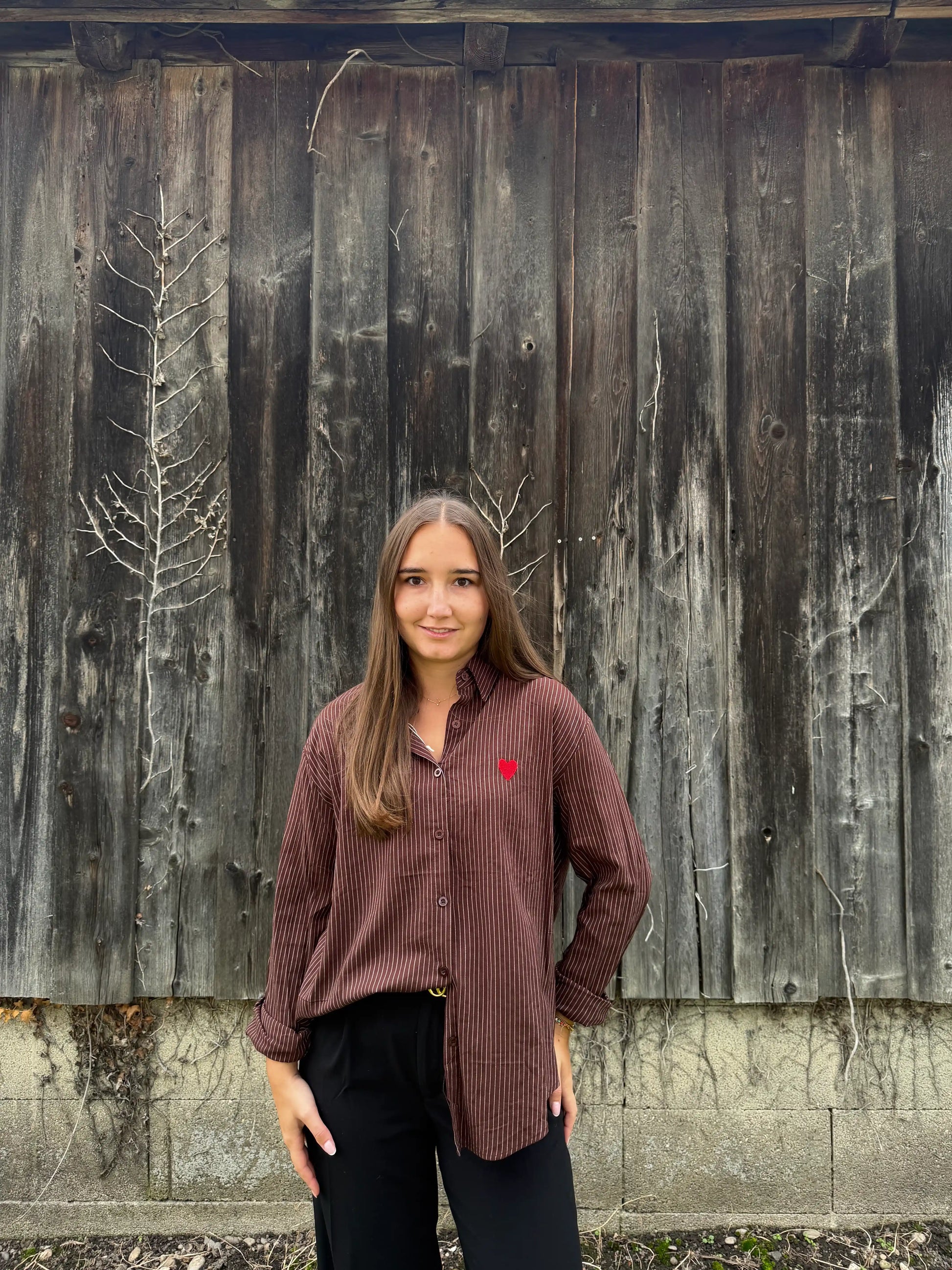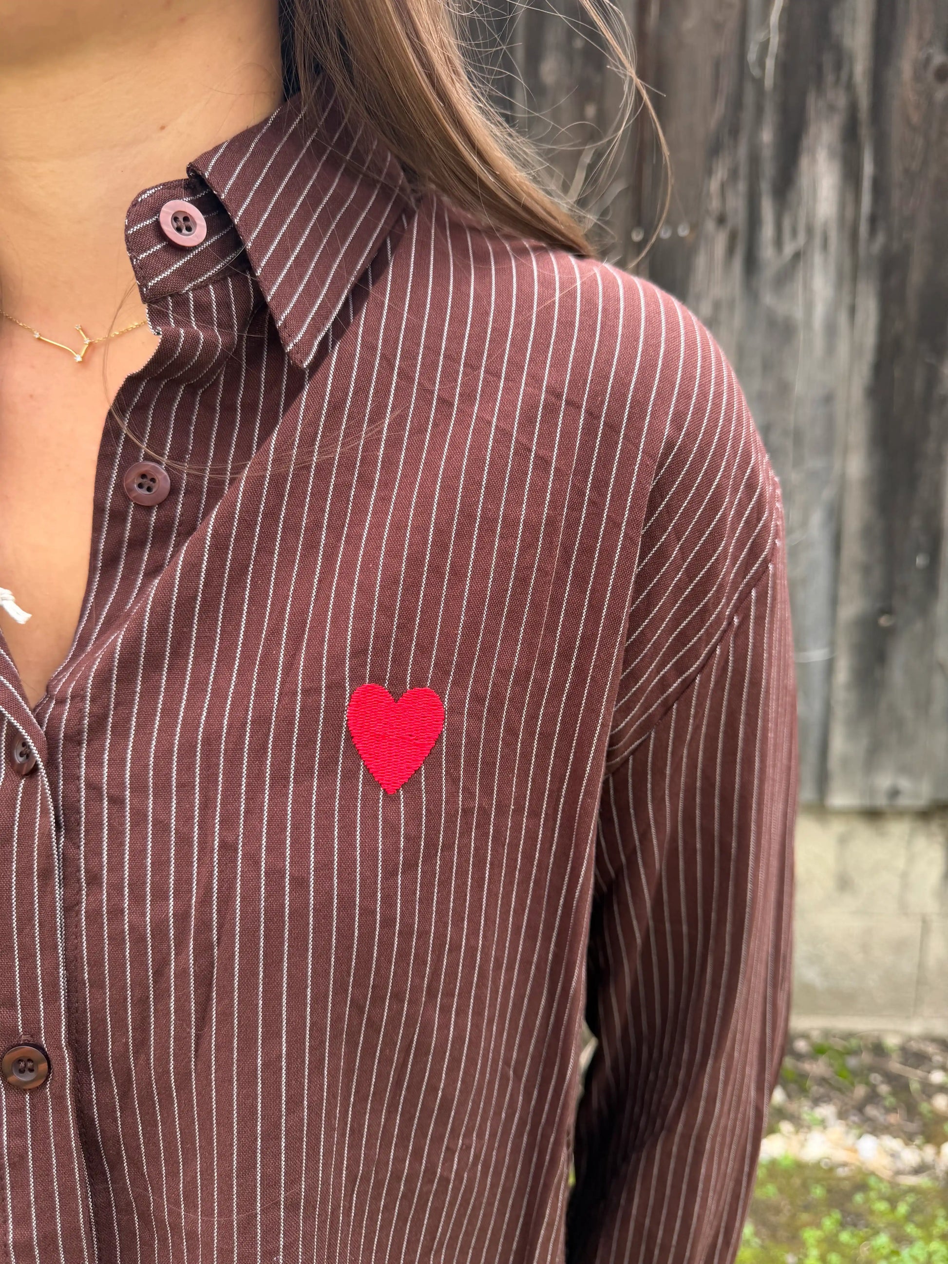 Die Bluse auf dem Bild hat einen lockeren, modernen Schnitt mit klassischem Kragen und Knopfleiste. Das feine, durchgehende Streifenmuster verleiht ihr eine elegante Note, während das kleine, aufgestickte Herzmotiv auf der linken Brust einen charmanten, verspielten Akzent setzt. Die Ärmel sind leicht hochgekrempelt, was dem Look eine lässige Note gibt. Der Stoff wirkt weich und fließend – perfekt für einen stilvollen, aber entspannten Alltags- oder Büro-Look.