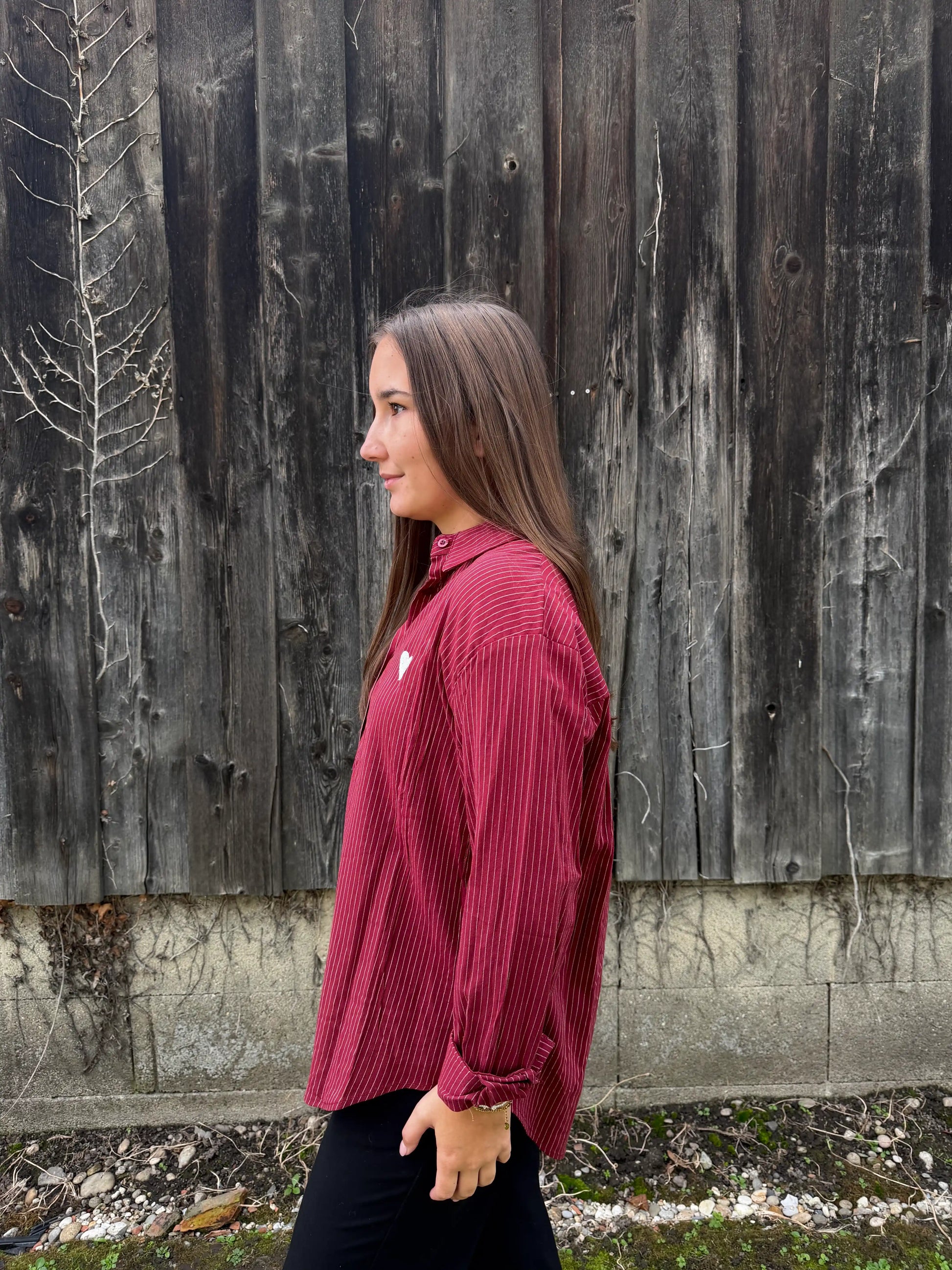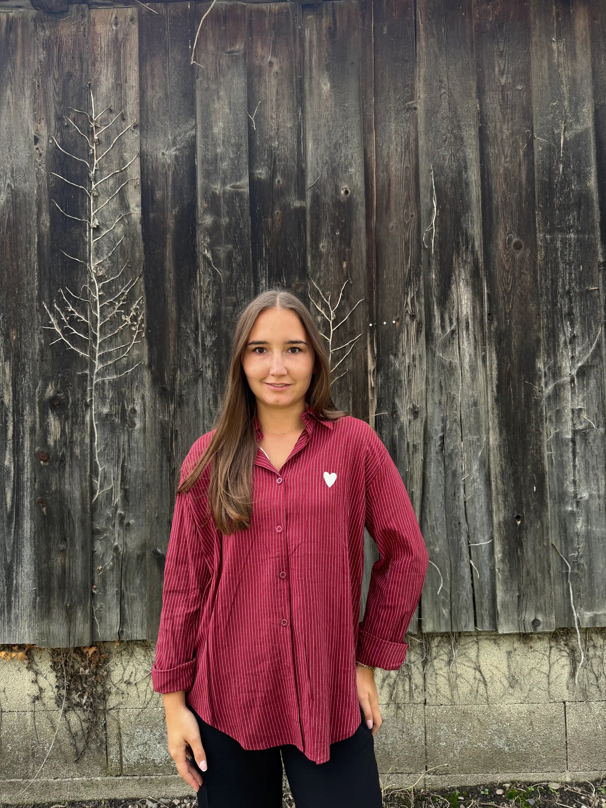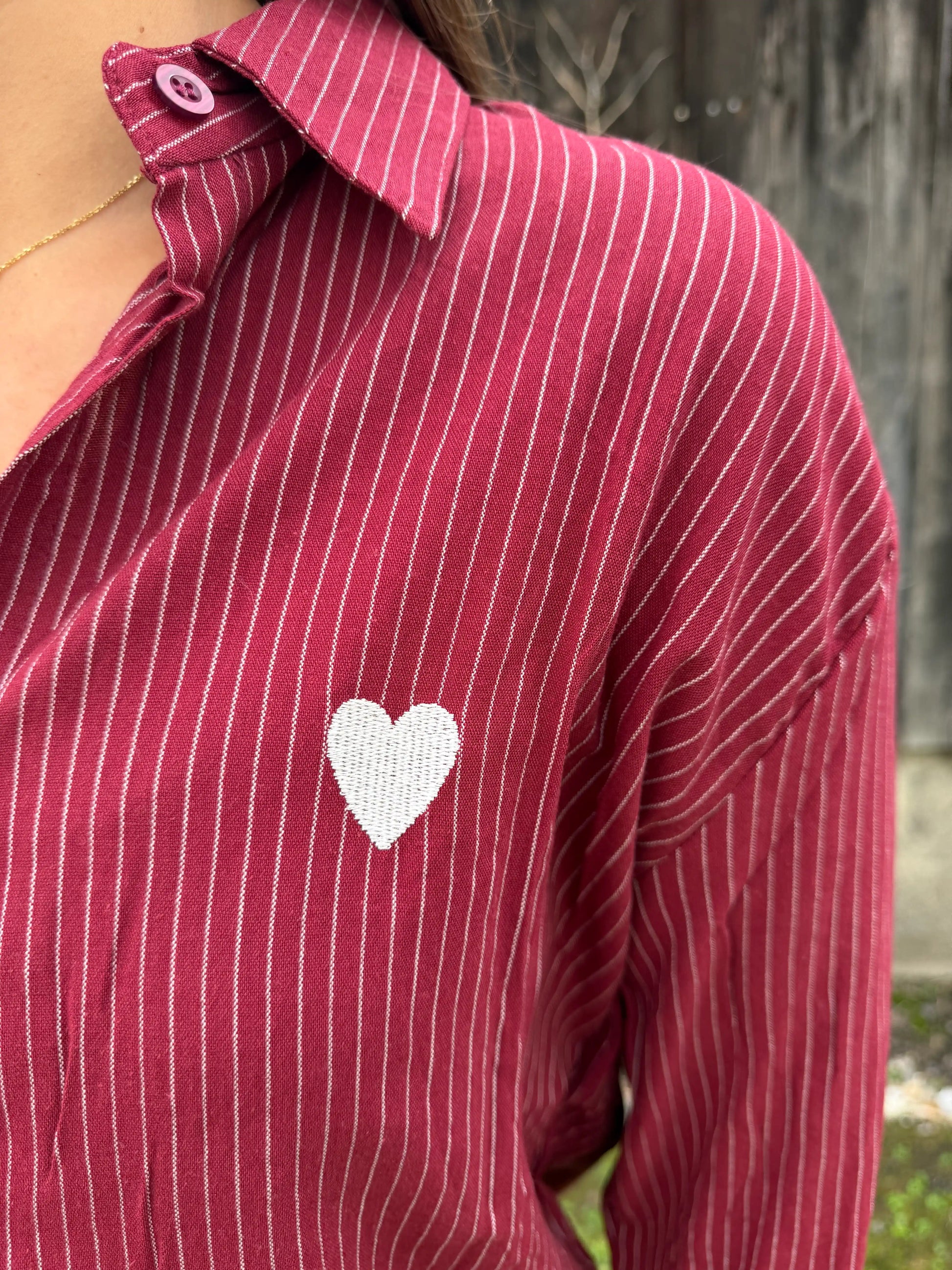 Die Bluse auf dem Bild hat einen lockeren, modernen Schnitt mit klassischem Kragen und Knopfleiste. Das feine, durchgehende Streifenmuster verleiht ihr eine elegante Note, während das kleine, aufgestickte Herzmotiv auf der linken Brust einen charmanten, verspielten Akzent setzt. Die Ärmel sind leicht hochgekrempelt, was dem Look eine lässige Note gibt. Der Stoff wirkt weich und fließend – perfekt für einen stilvollen, aber entspannten Alltags- oder Büro-Look.