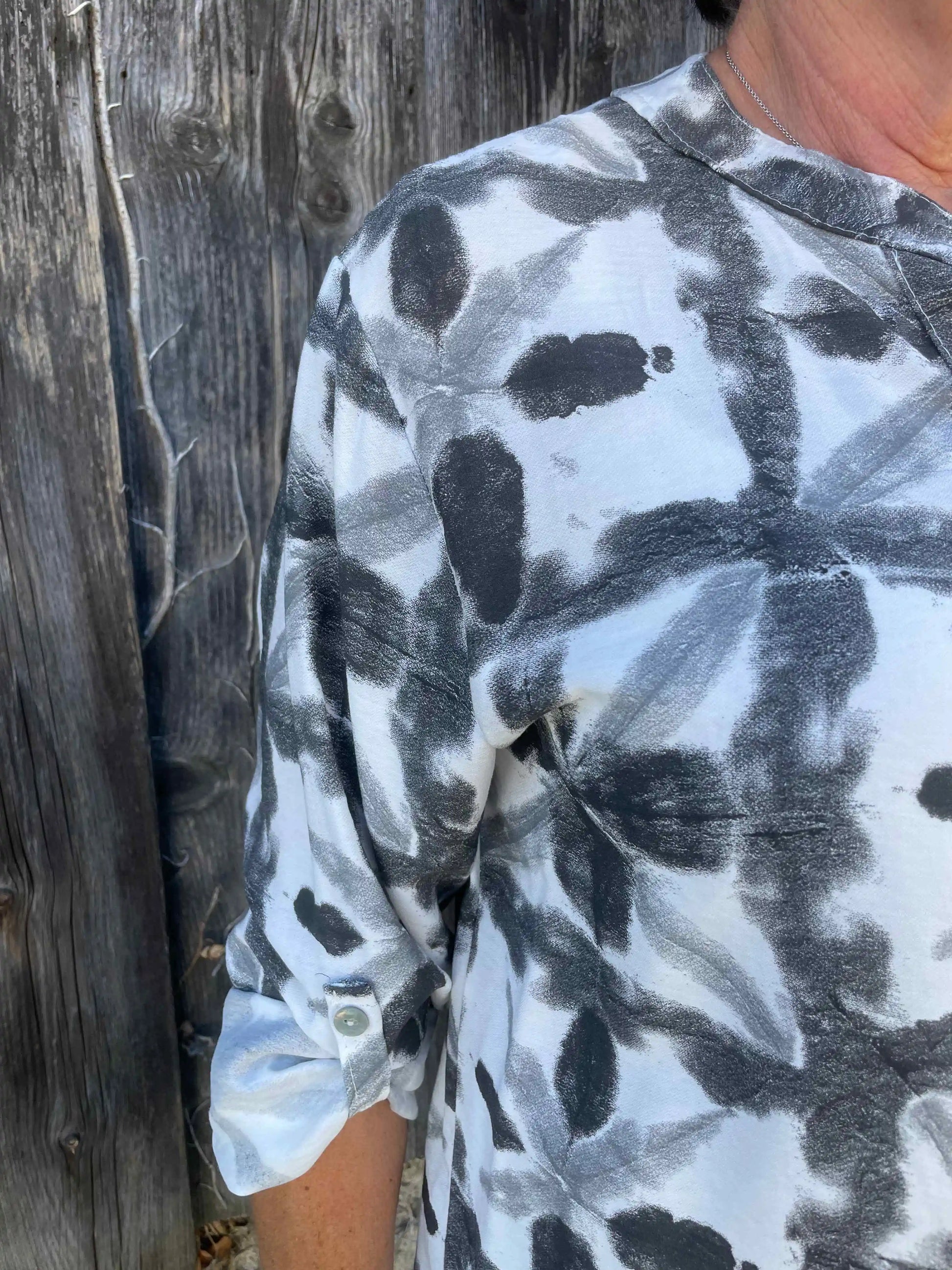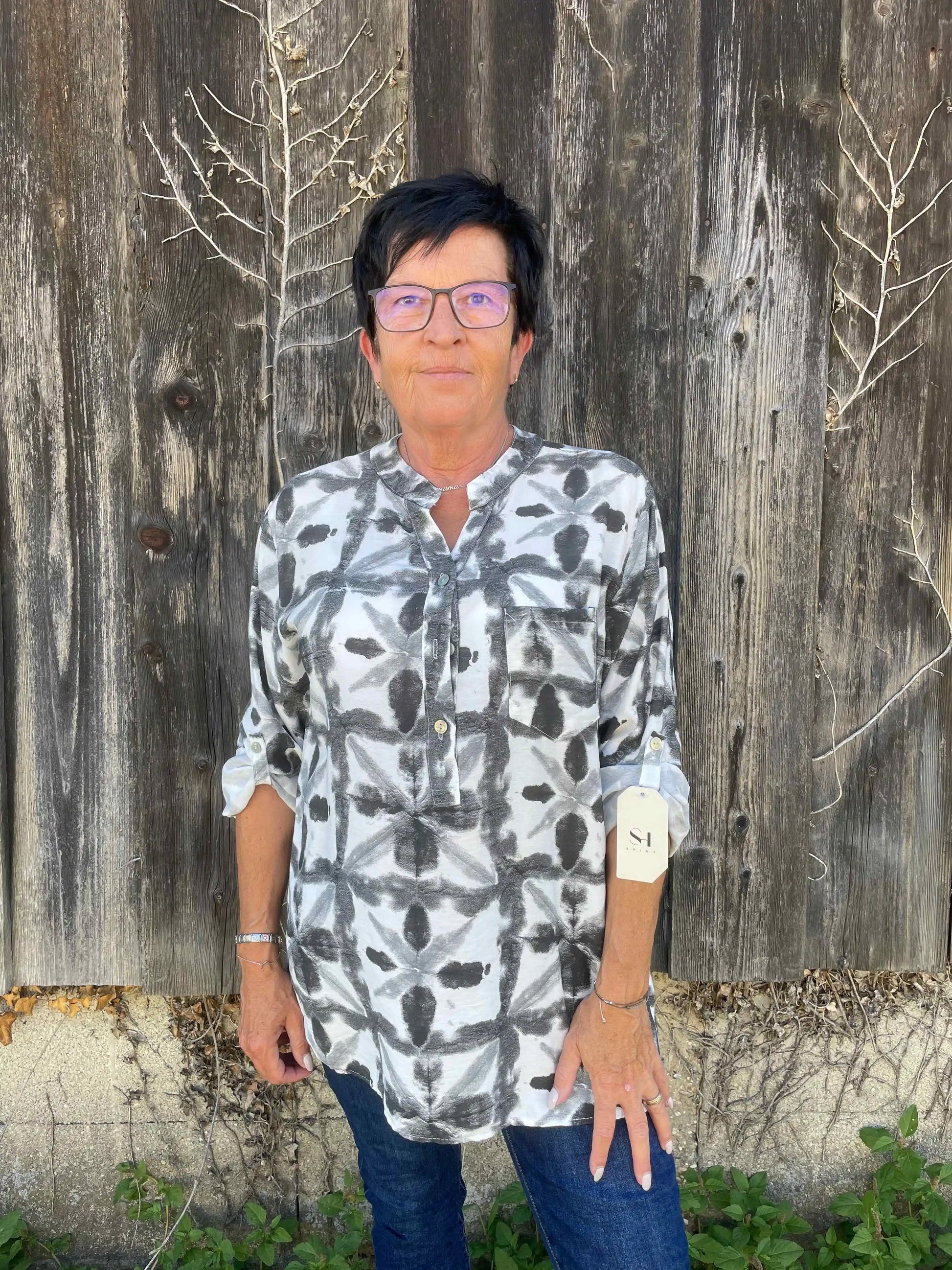 Mit ihrem kunstvollen Allover-Muster zieht diese Tunika die Blicke auf sich. Der lockere Schnitt und die leichte Qualität sorgen für ein angenehmes Tragegefühl, während der kleine Stehkragen mit kurzer Knopfleiste einen modernen Akzent setzt. Die Ärmel lassen sich dank Riegel bequem hochkrempeln – ideal für flexible Alltagslooks.