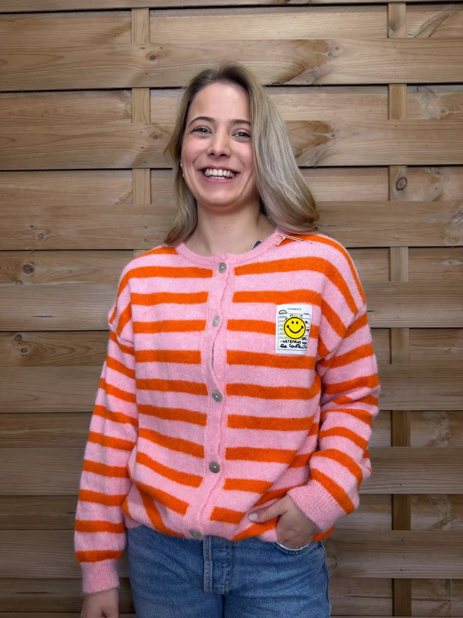 Lässiger Strickliebling mit Gute-Laune-Vibe – diese weiche Streifen-Strickjacke mit Knopfleiste und süßem Patch-Detail bringt einen verspielten Akzent in deinen Look und sorgt gleichzeitig für gemütlichen Tragekomfort im Alltag.