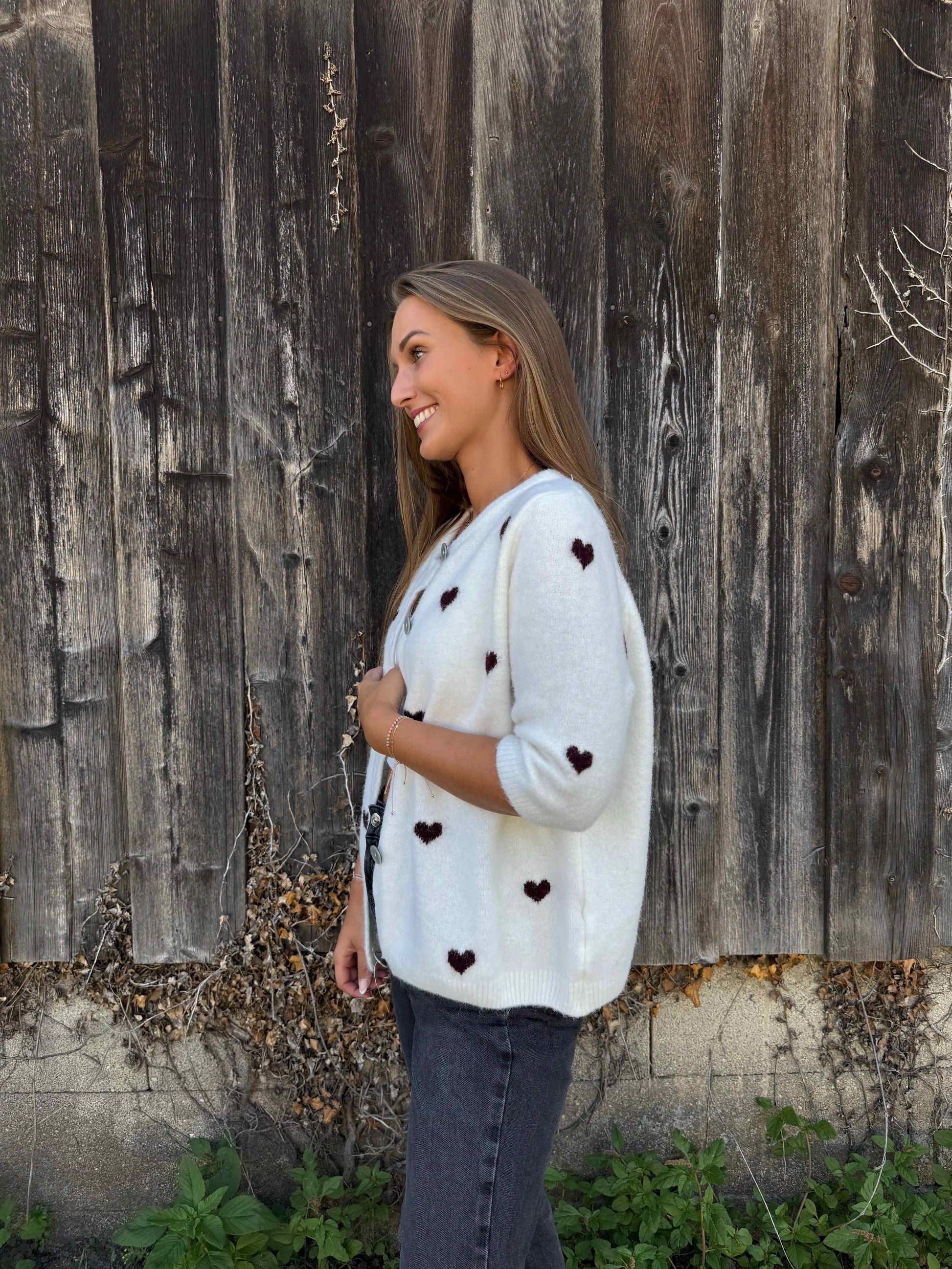 Verspielte Eleganz für gemütliche Tage – diese kuschelige Strickjacke mit kleinen Herzchen ist ein echtes Wohlfühlteil und bringt sofort gute Laune in deinen Look.