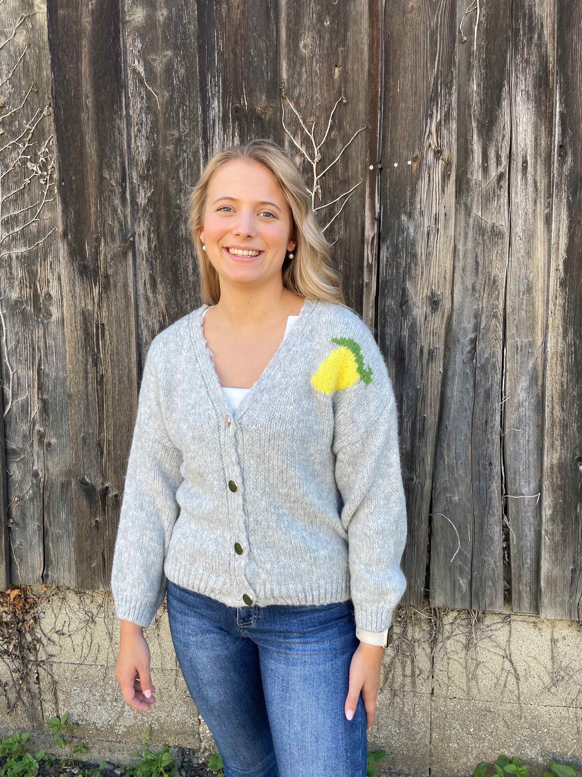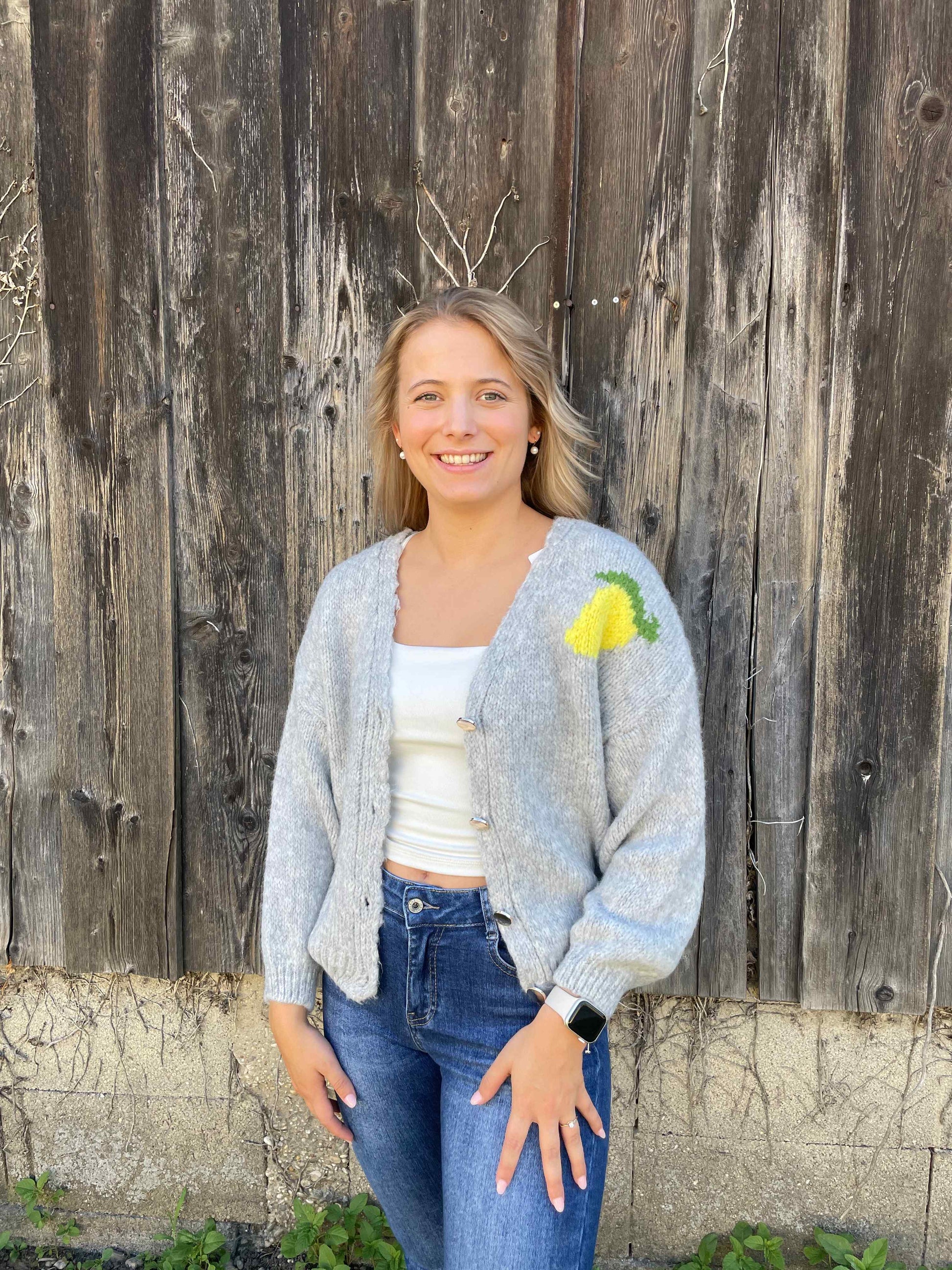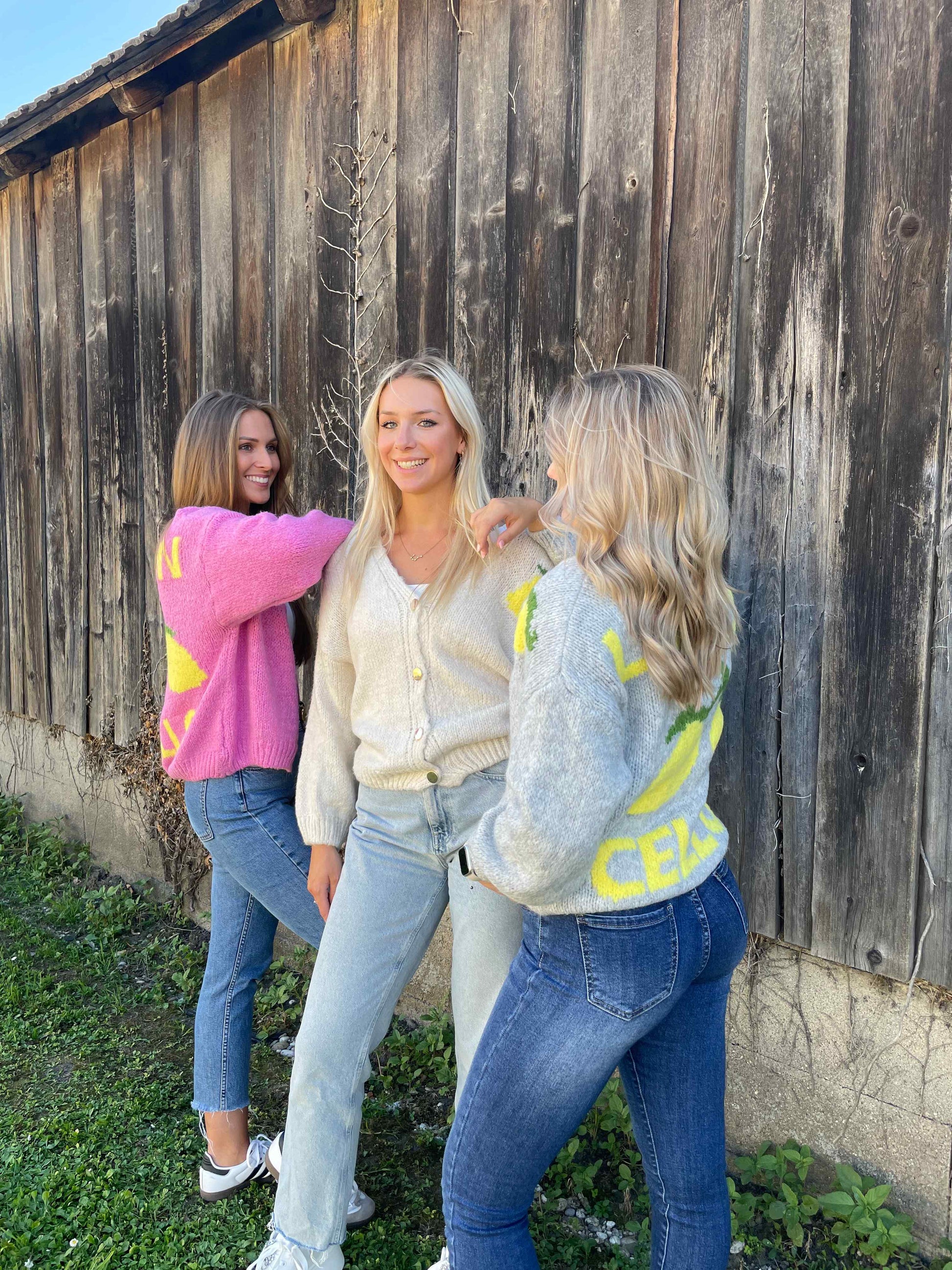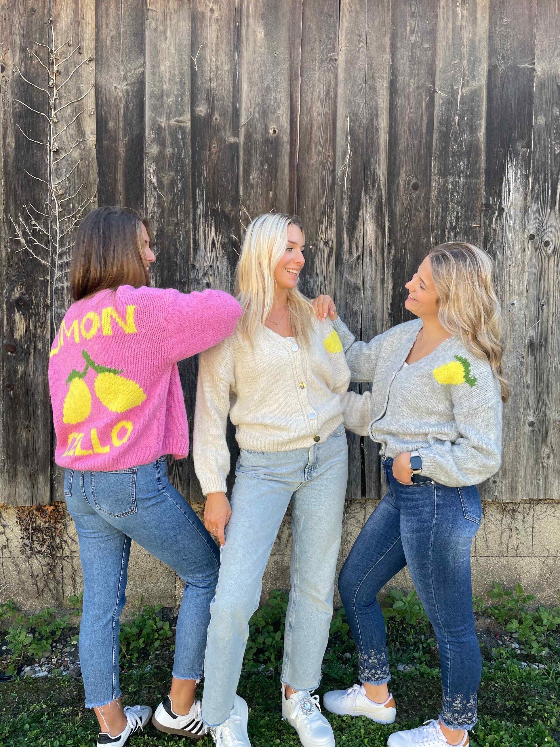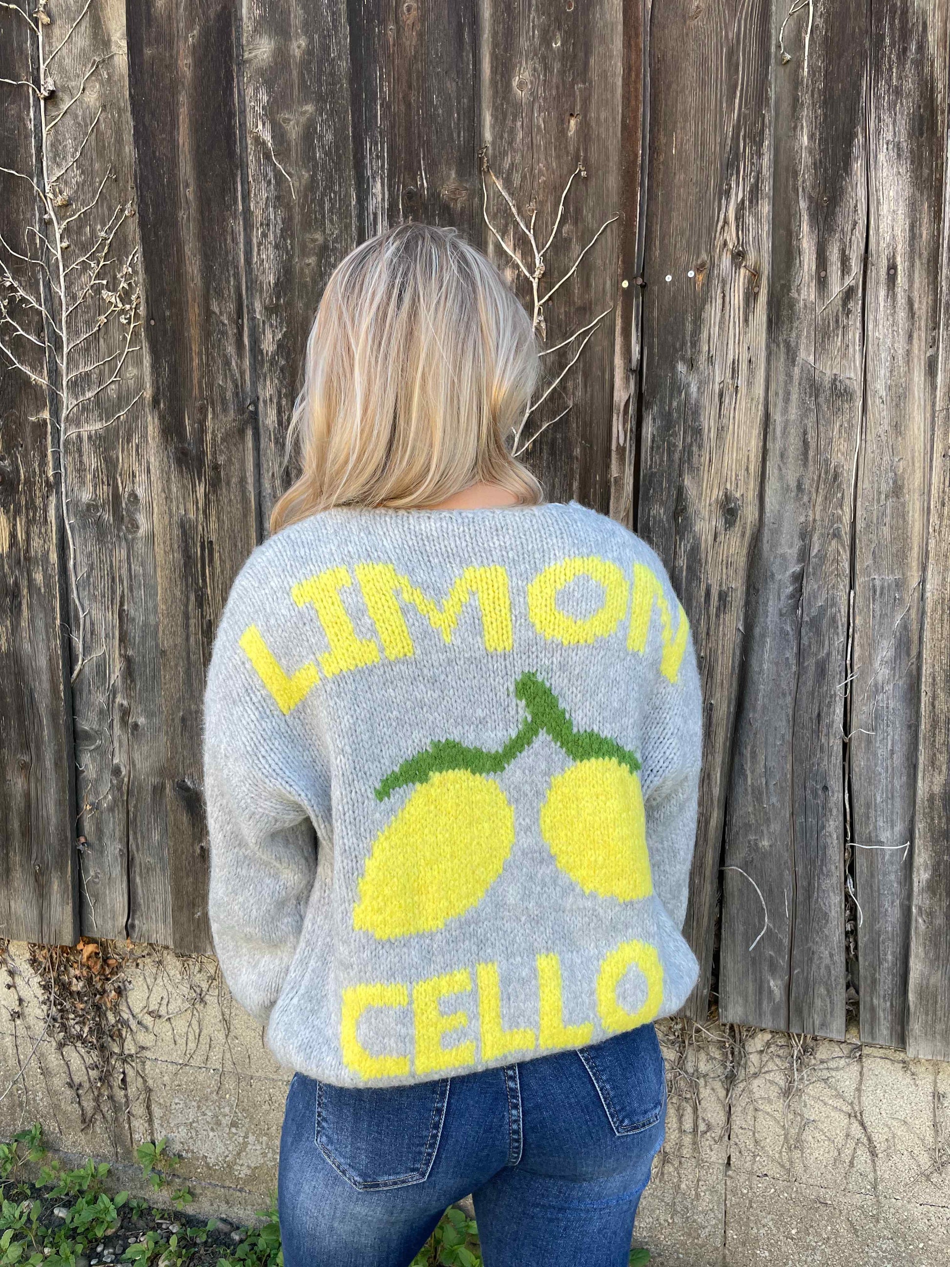 Ein kuscheliger Strick-Cardigan mit sommerlichem Statement: Die große Zitronen-Grafik und der „Limoncello“-Schriftzug auf dem Rücken bringen sofort gute Laune. Perfekt für frische Abende oder als Hingucker im Alltag – fruchtig, frech und gemütlich.
