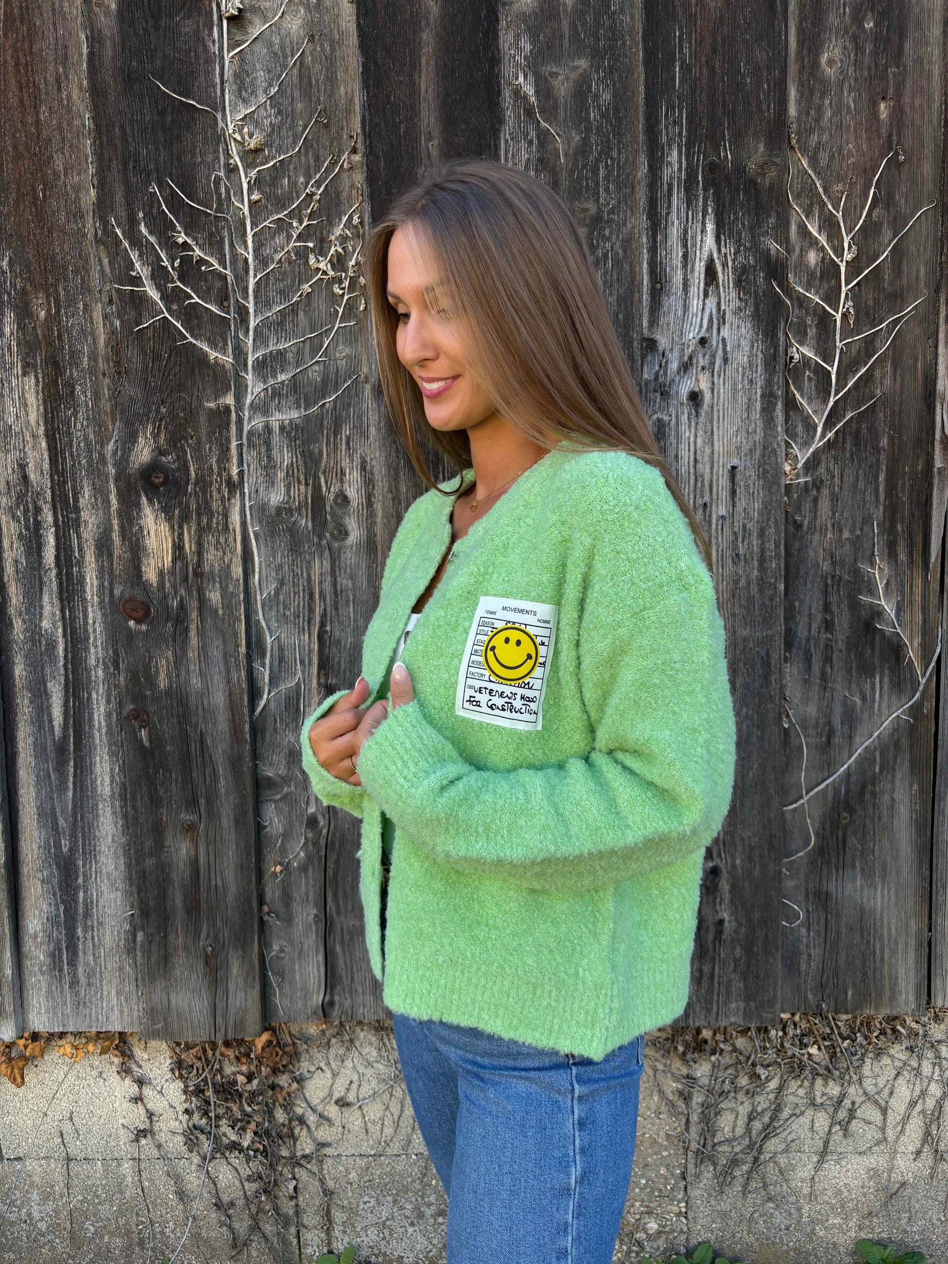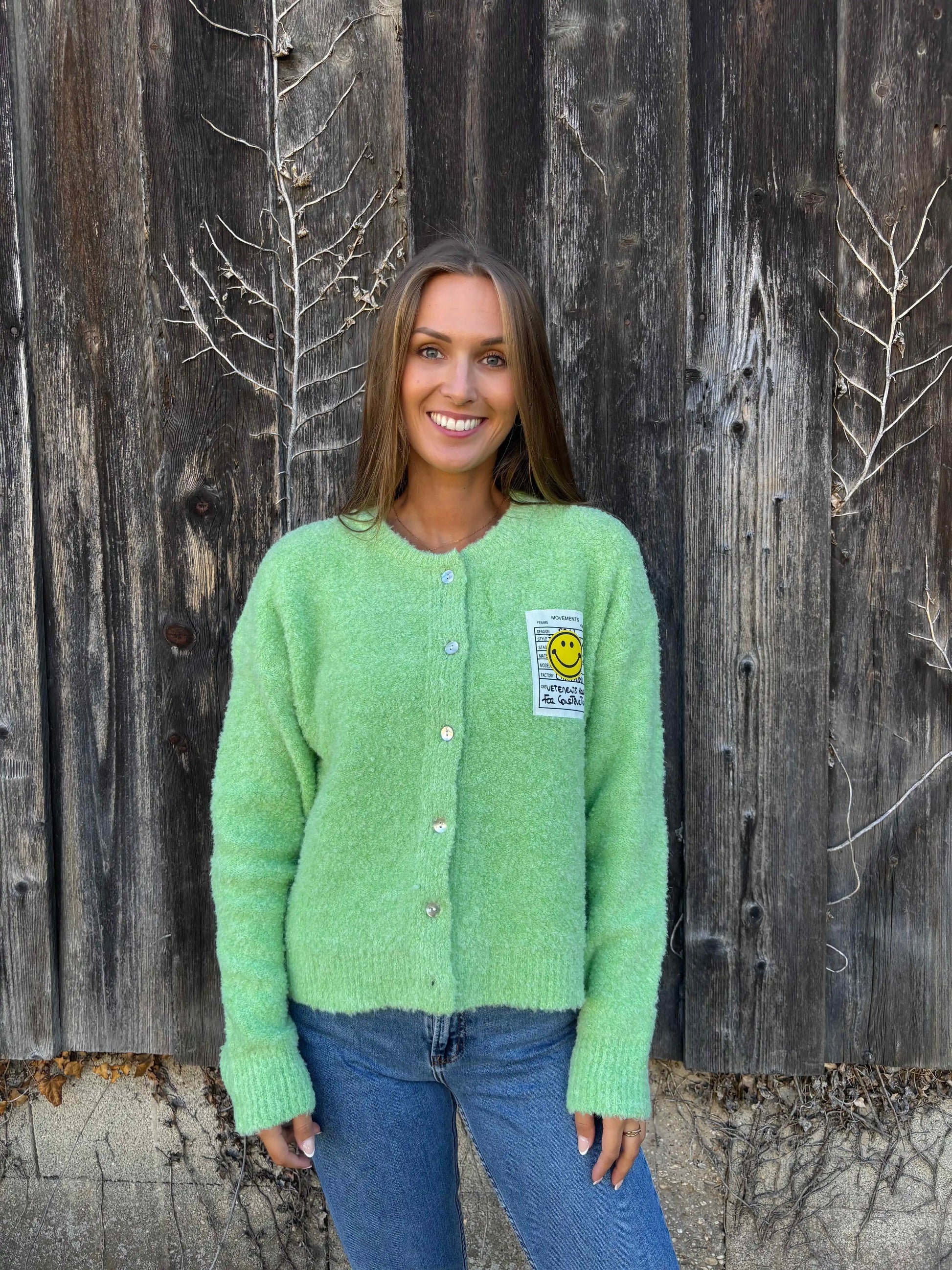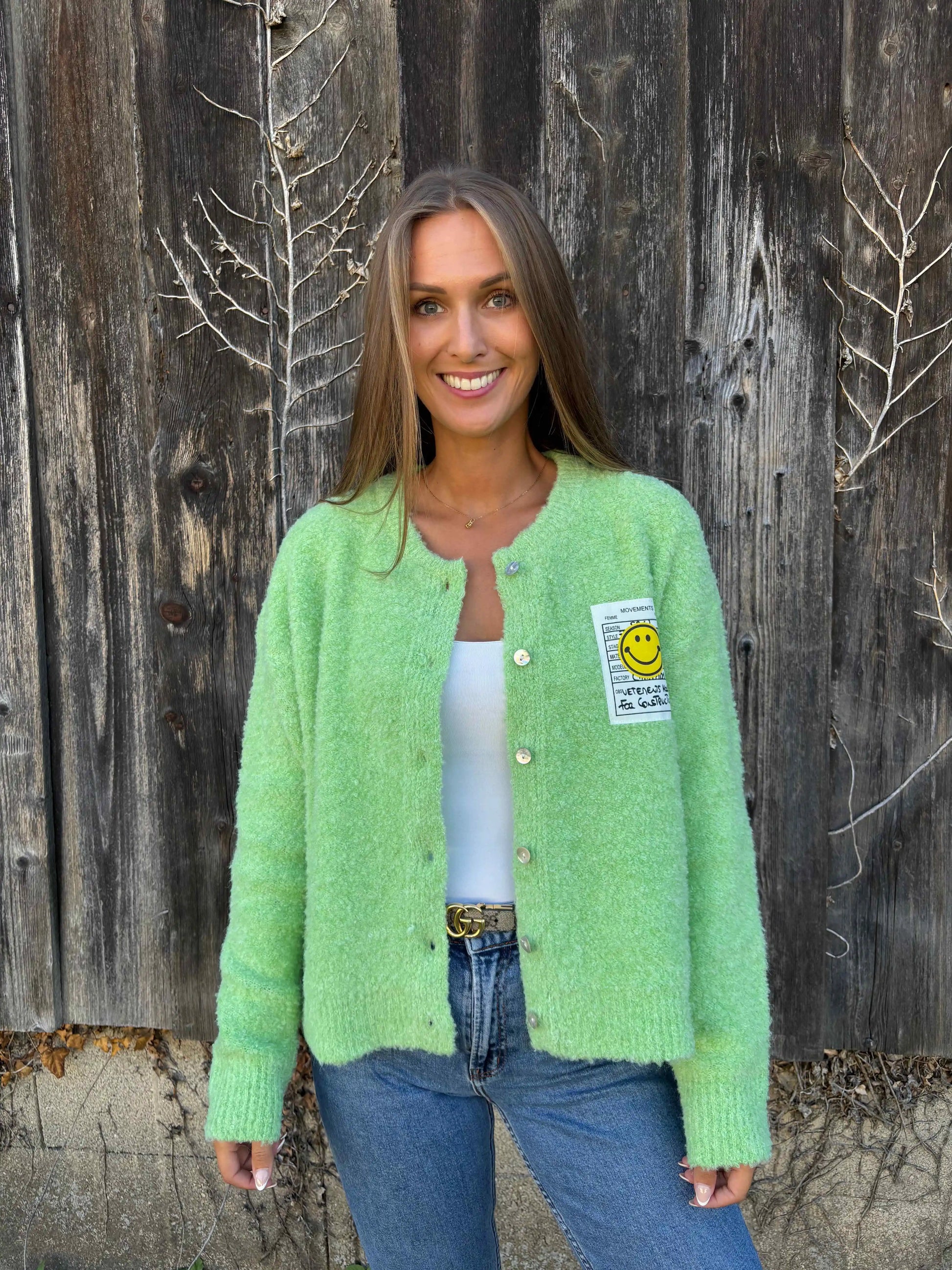 Dieser weiche Cardigan sorgt mit seiner flauschigen Textur für extra Gemütlichkeit. Durch die klassische Knopfleiste lässt er sich vielseitig stylen – offen oder geschlossen. Das auffällige Patch mit Smiley-Motiv verleiht dem Look eine lässig-moderne Note und macht den Cardigan zu einem echten Hingucker.