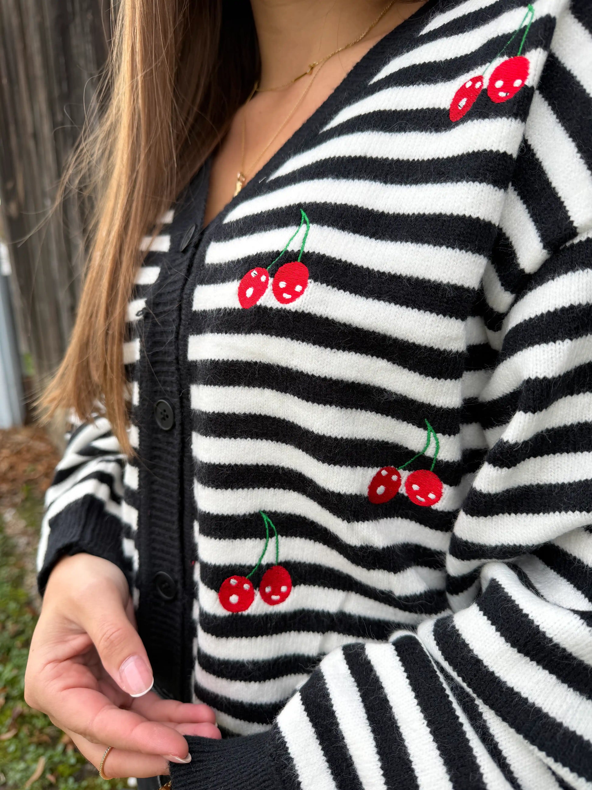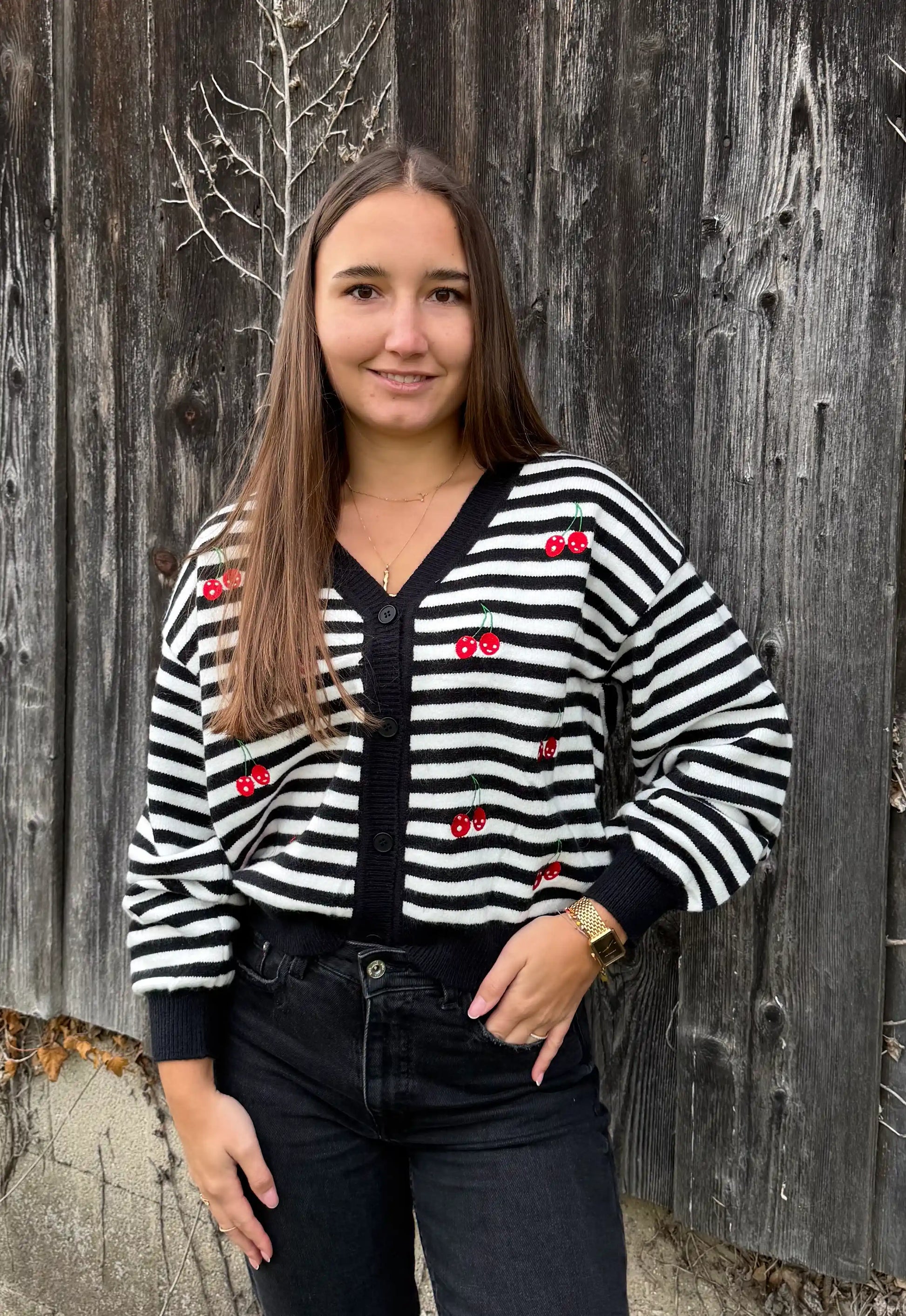 Stylische Strickjacke mit schwarz-weißen Streifen und süßen Kirschstickereien. Der lockere Schnitt und die weiche Strickqualität sorgen für hohen Tragekomfort. Ein verspielter Hingucker, der jedem Outfit einen frischen, modernen Touch verleiht.