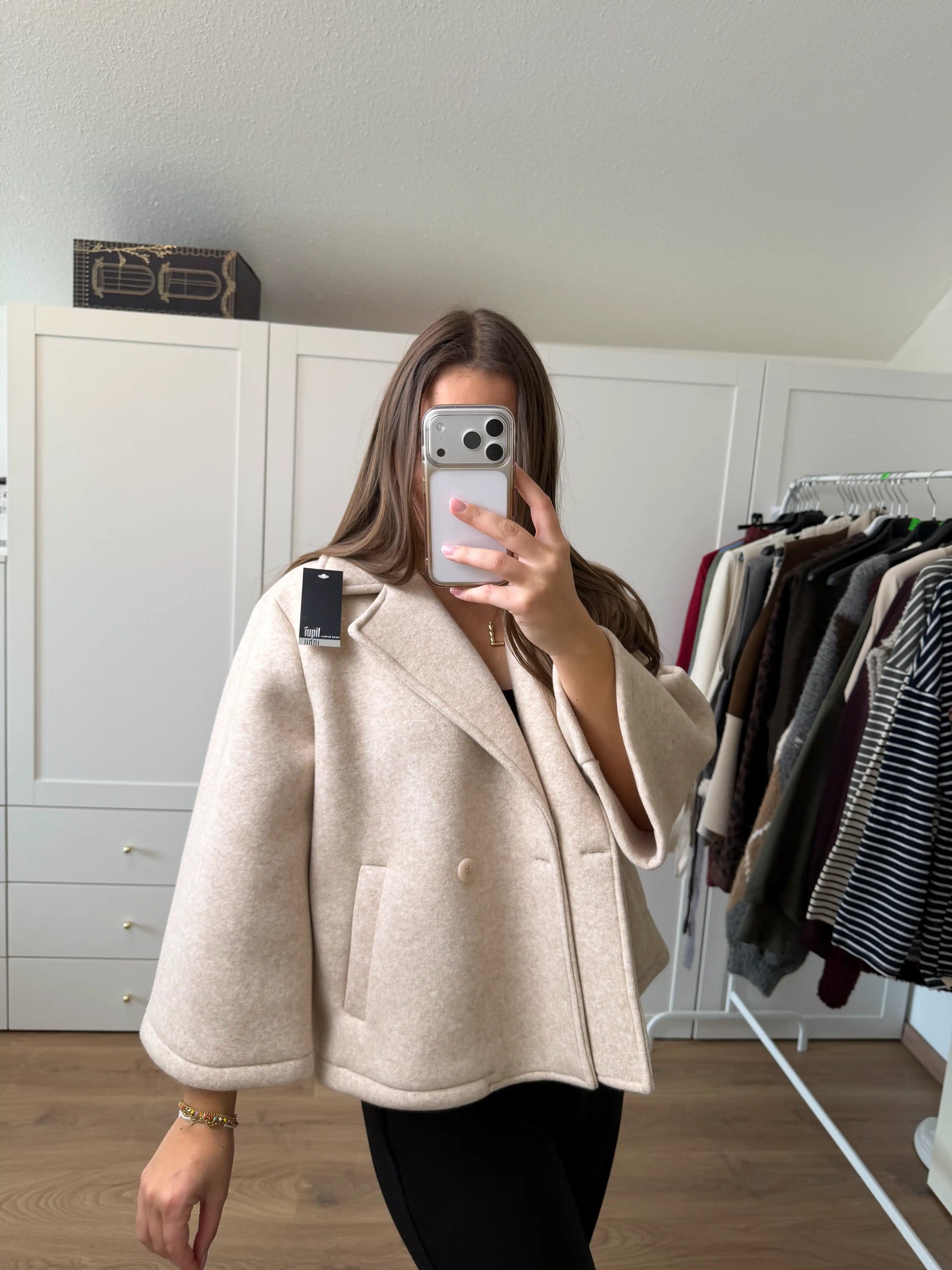 Kurz geschnittene Jacke mit klarer Linienführung und modernem Reverskragen. Die leicht ausgestellten Ärmel verleihen dem Modell eine besondere Silhouette, während der strukturierte Stoff für einen hochwertigen Look sorgt. Vielseitig kombinierbar – ideal als stilvolle Ergänzung für Alltag und besondere Anlässe.