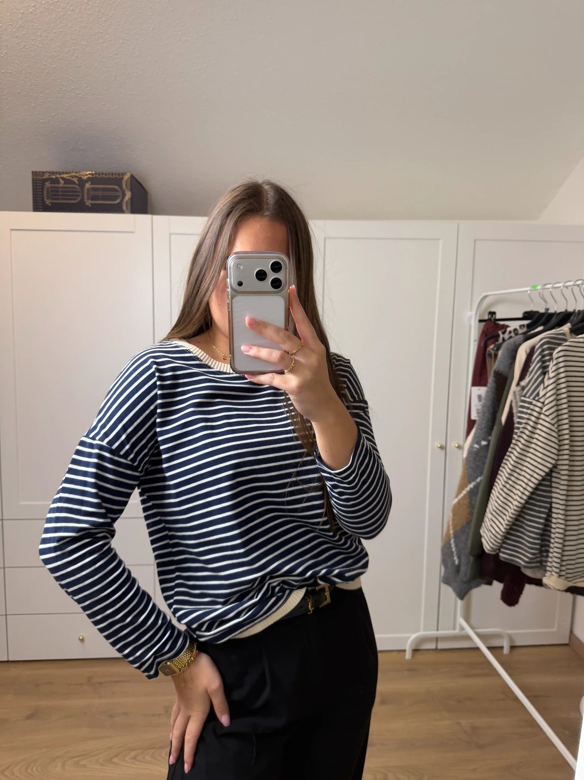 Bequemes Longsleeve mit feinem Streifenmuster. Der leichte Stoff und der lockere Schnitt machen es zum idealen Basic für jeden Tag. Ein dezenter Kontrastbund rundet den Look modern ab.