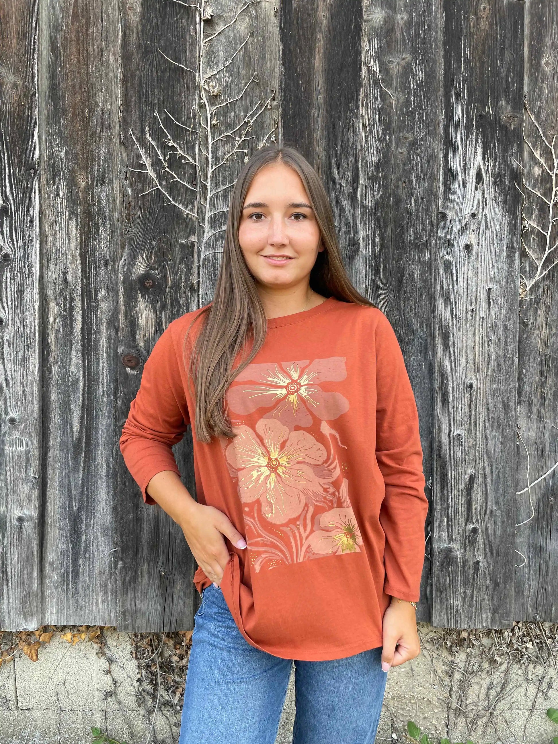 Dieses Oberteil vereint natürlichen Charme mit einem Hauch von künstlerischem Ausdruck. Der florale Print auf der Vorderseite verleiht dem Design eine verspielte, zugleich elegante Note. Der lockere Schnitt sorgt für ein angenehmes Tragegefühl und macht es zum idealen Begleiter für entspannte Tage oder stilvolle Casual-Looks. Die langen Ärmel und das weiche Material bieten Komfort in jeder Jahreszeit.