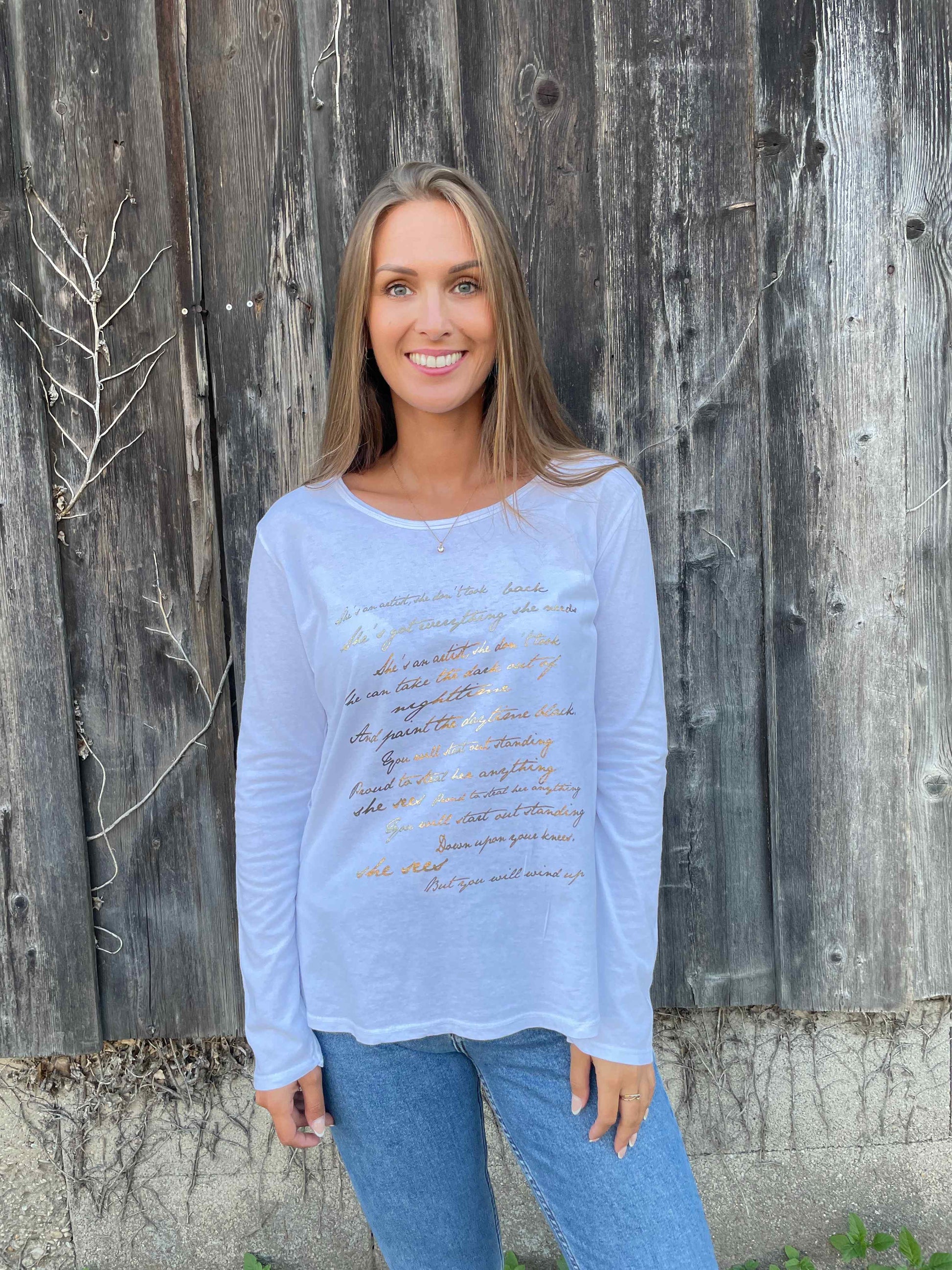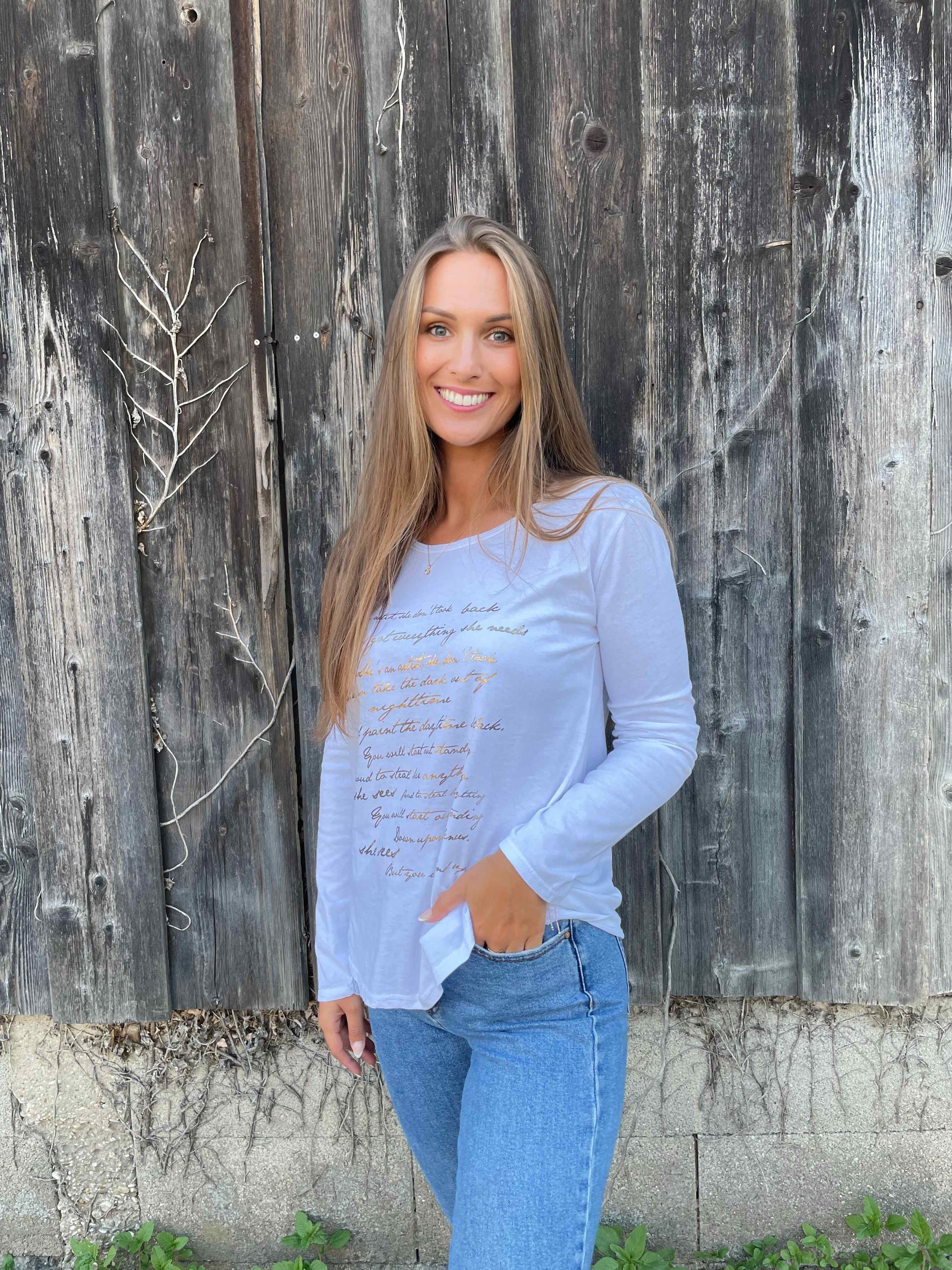 Dieses Langarmshirt ist ein echter Hingucker mit seinem glänzenden, handschriftlich wirkenden Frontprint. Der lässige Schnitt mit Rundhalsausschnitt und langen Ärmeln sorgt für angenehmen Tragekomfort im Alltag. Der auffällige Schriftzug auf der Vorderseite verleiht dem Oberteil eine moderne, leicht verspielte Note – perfekt für stilvolle Casual-Looks.