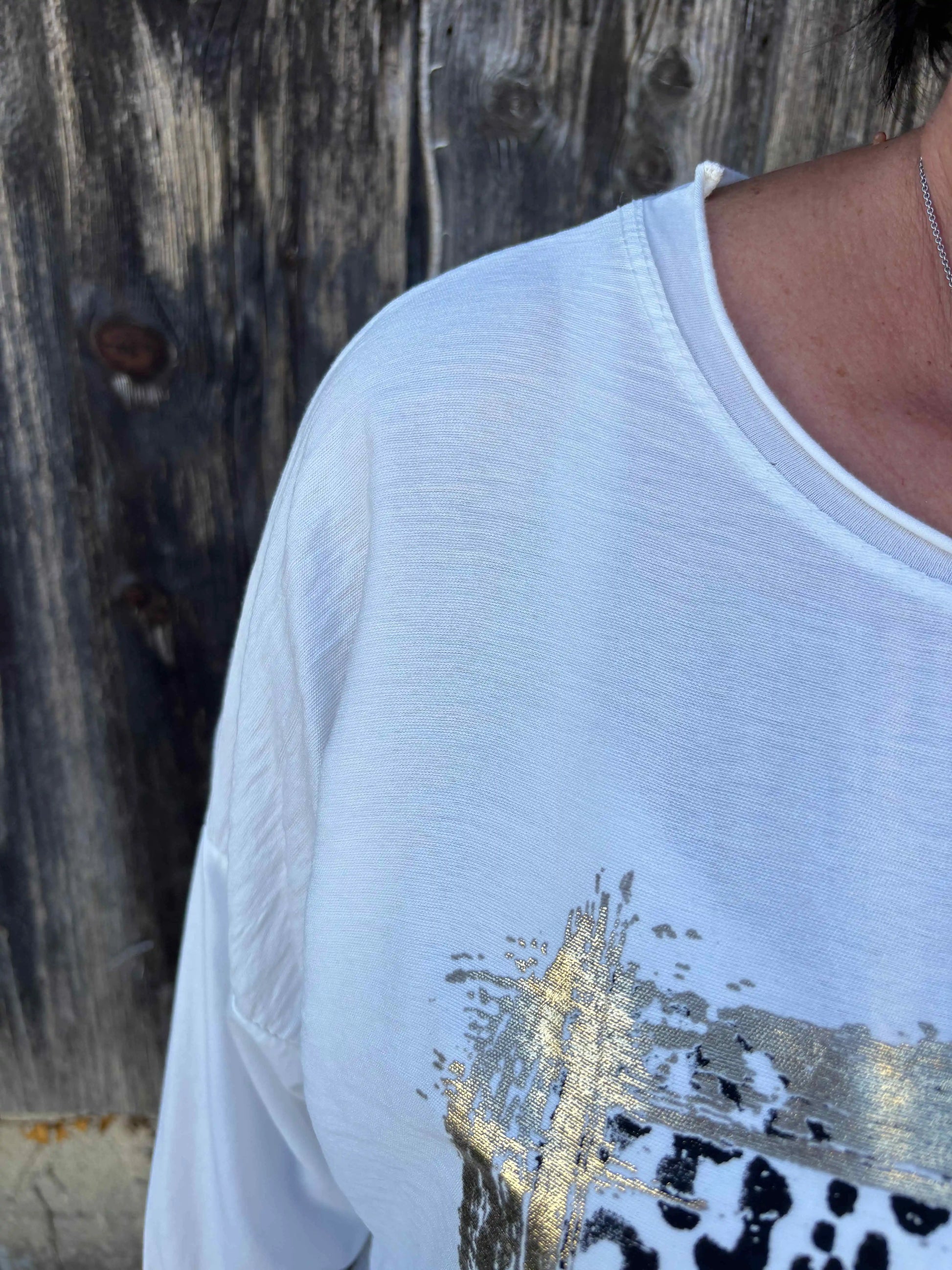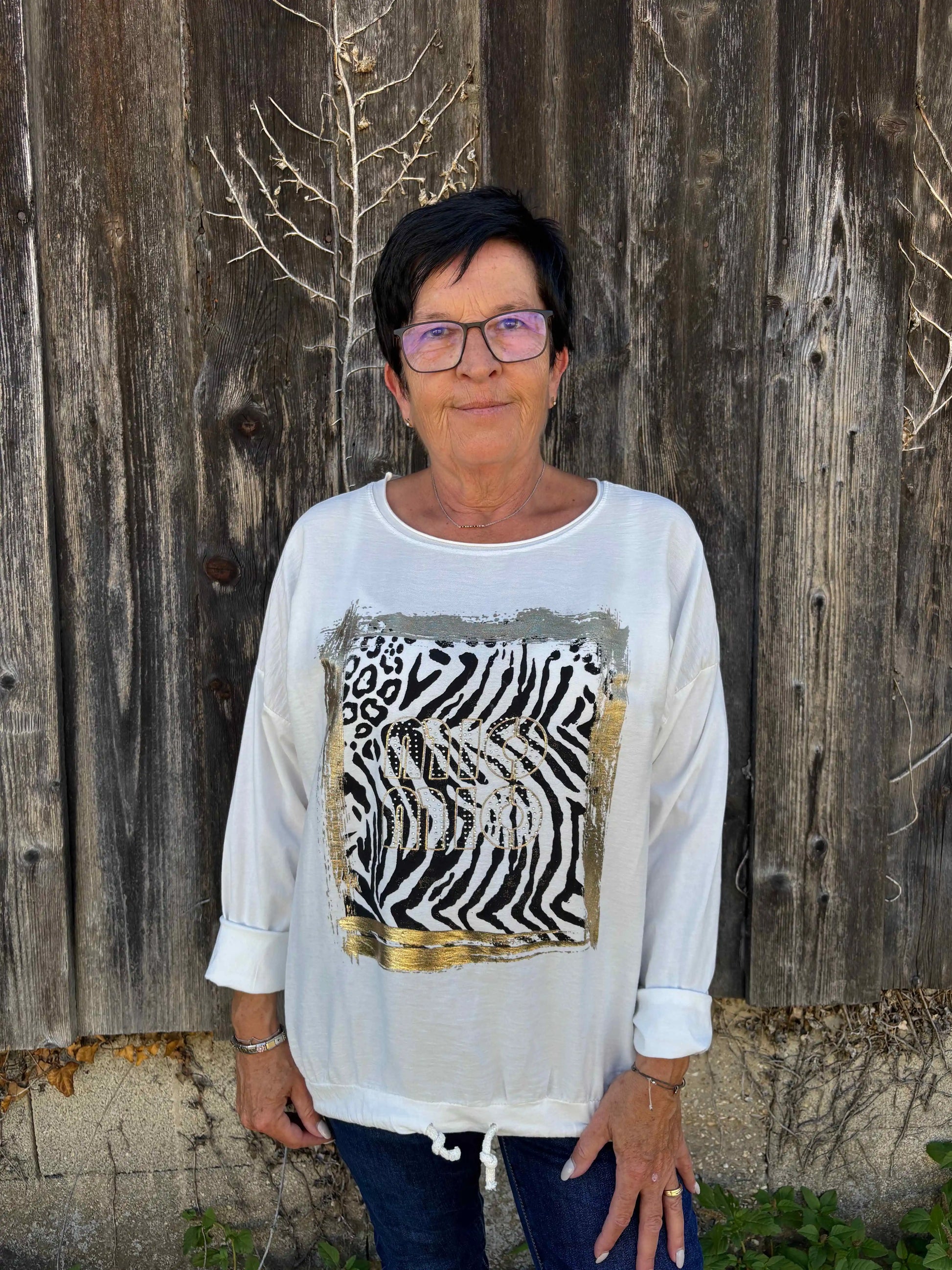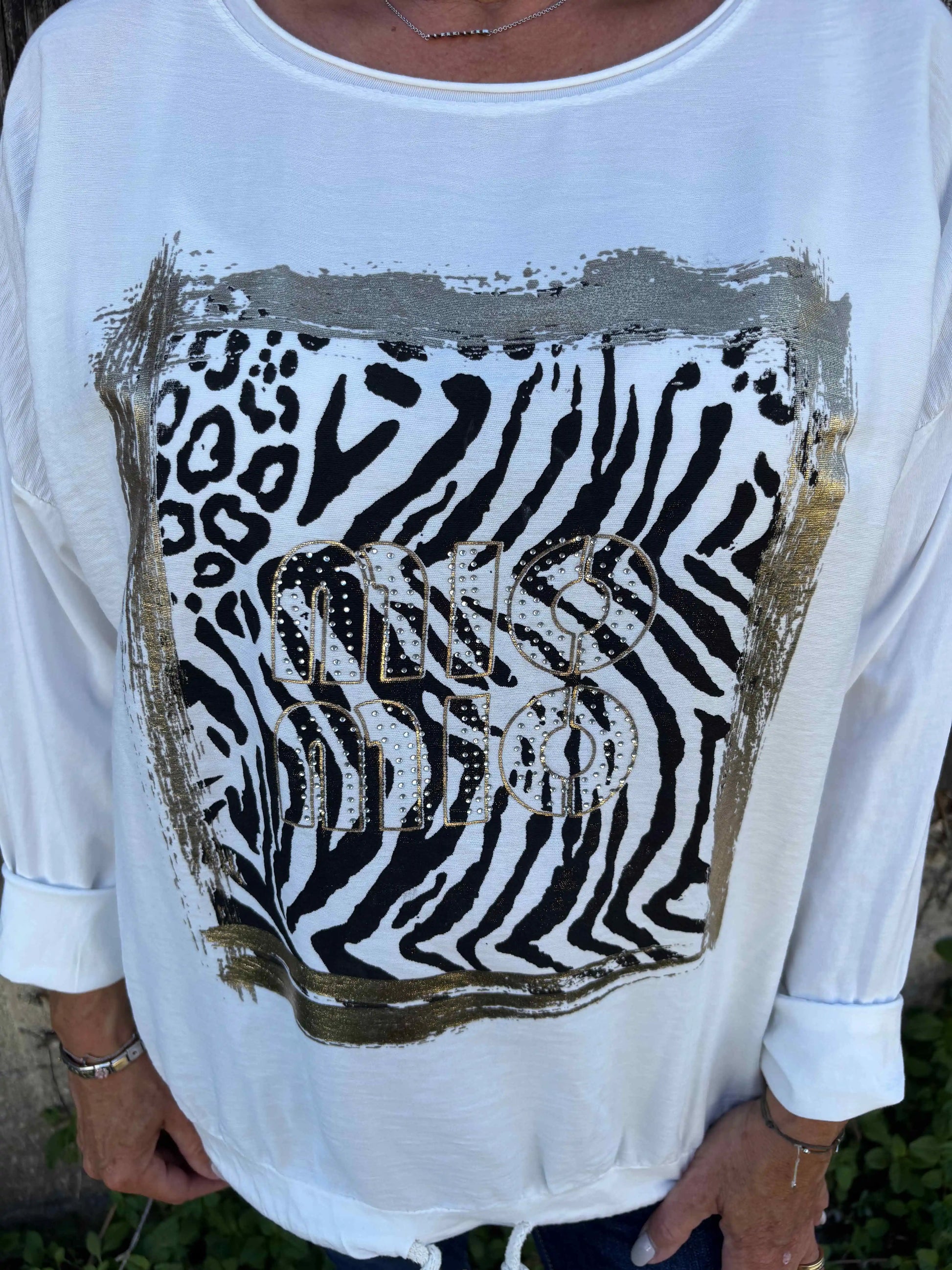 Das Shirt besticht durch seinen auffälligen Animal-Print im angesagten Mix-Design und glitzernden Details. Mit Tunnelzug am Saum für eine lässige Passform und einem bequemen, geraden Schnitt – perfekt für stylische Alltagslooks mit Statement.