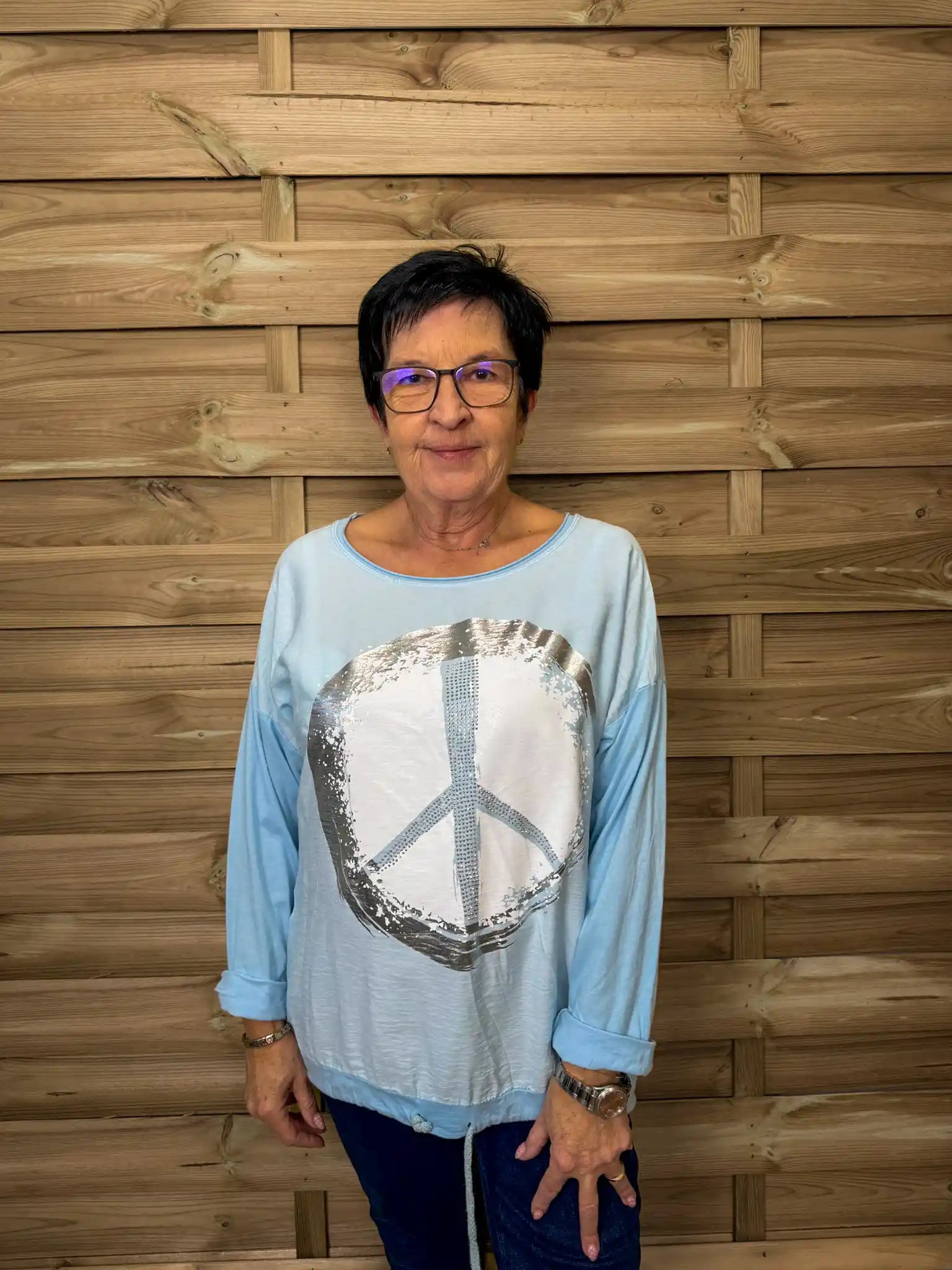 Dieses locker geschnittene Longsleeve überzeugt mit einem großen Peace-Zeichen auf der Vorderseite und sorgt für einen modernen, entspannten Style. Der weiche Fall und der bequeme Schnitt bieten angenehmen Tragekomfort. Dank des Tunnelzugs am Saum lässt sich die Weite individuell anpassen – perfekt zu Jeans oder lässigen Hosen kombinierbar.