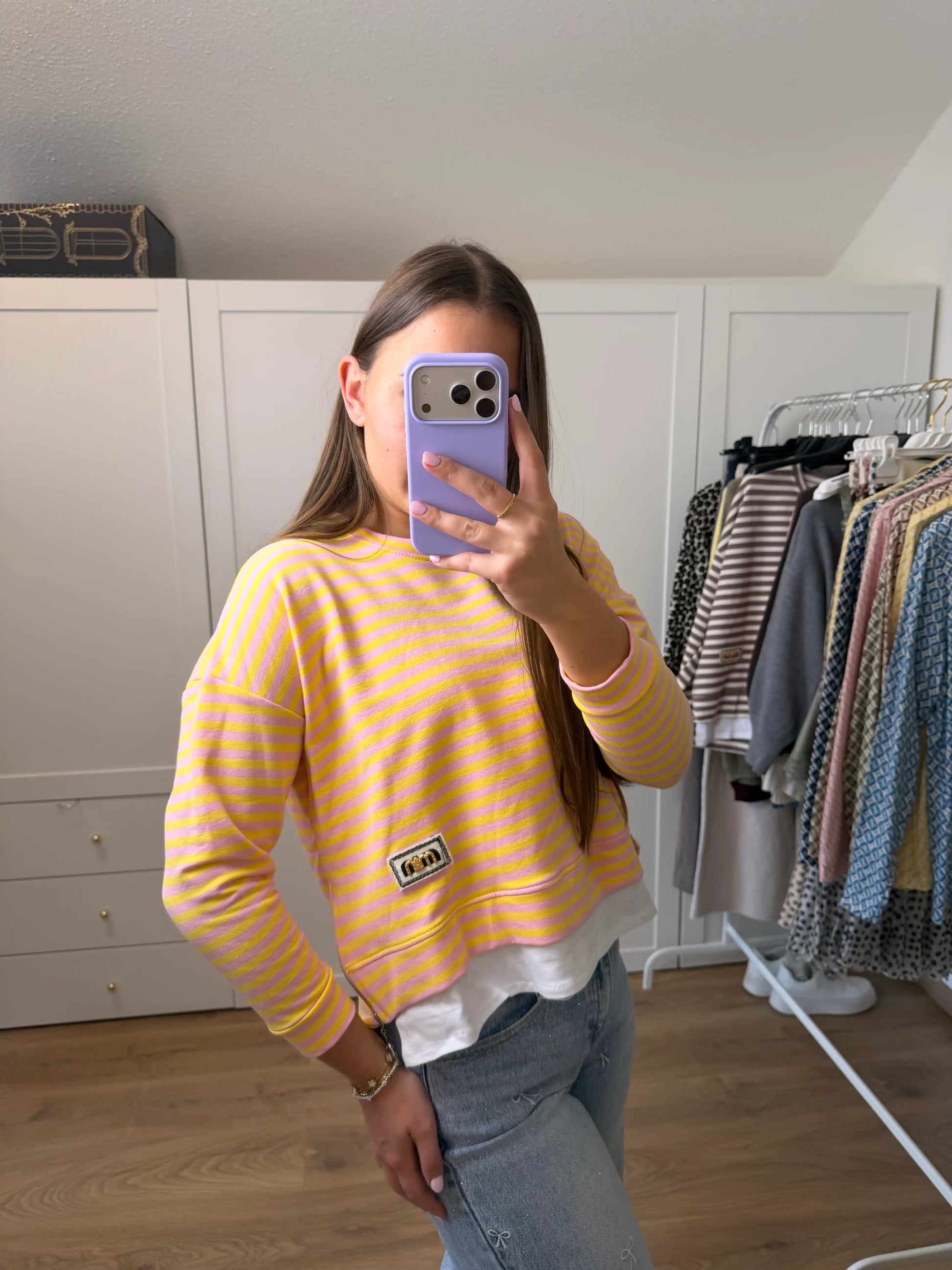 Leichter Feinstrick mit modernem Streifenlook und lockerer Passform. Der verkürzte Schnitt sorgt für eine lässige Silhouette, während das kleine Detail am Saum dem Design eine besondere Note verleiht.