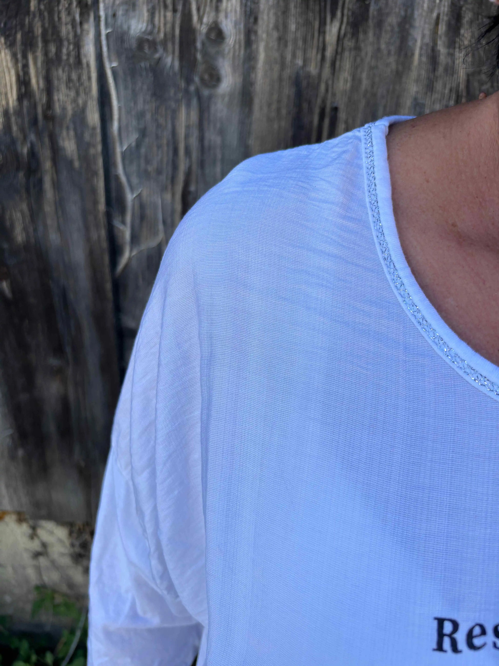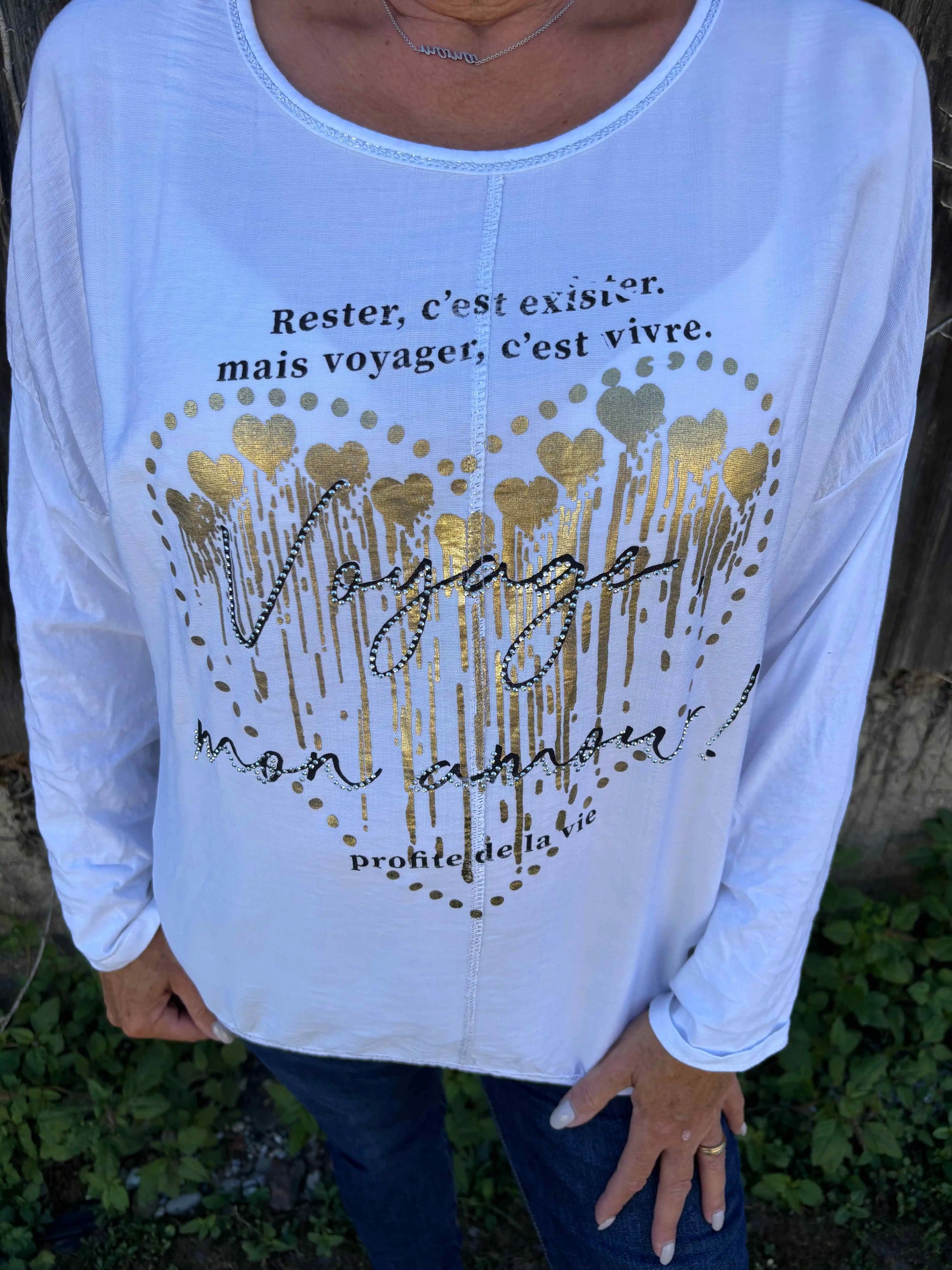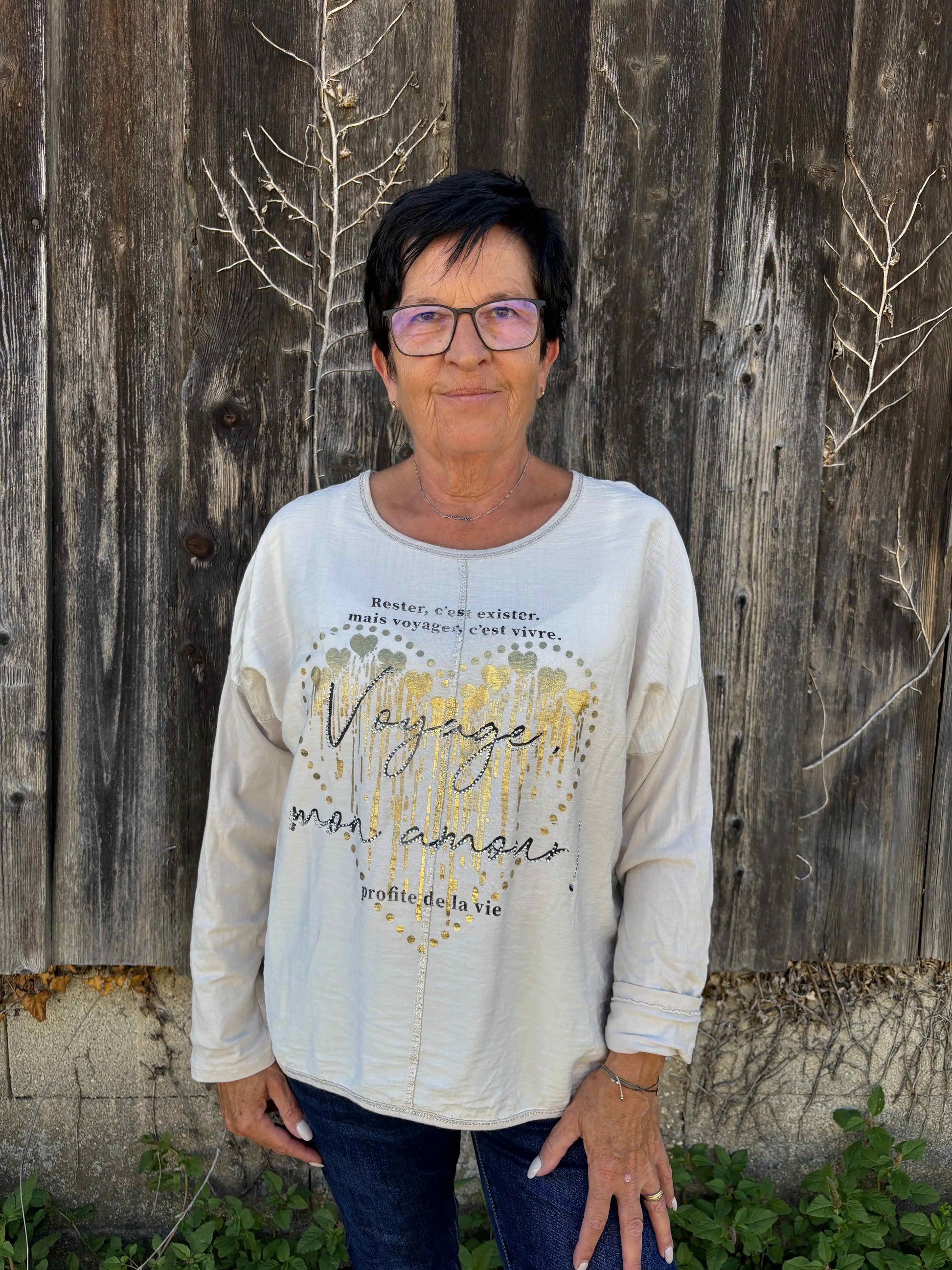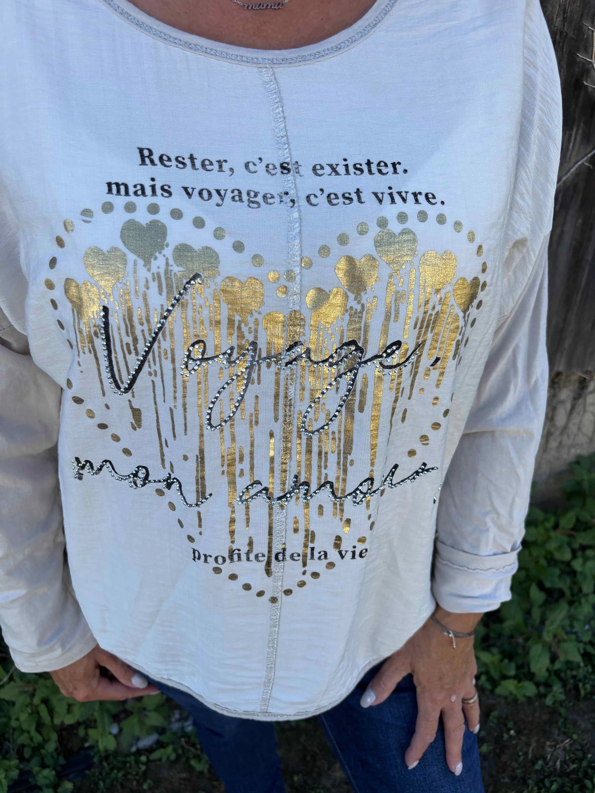 Ein lässiger Look mit einer Prise Fernweh! Dieses cremefarbene Shirt mit langen Ärmeln überzeugt mit einem lockeren Schnitt und einem detailverliebten Frontprint in Gold, Silber und Schwarz. Der Schriftzug „Voyage mon amour – profite de la vie“ macht sofort Lust auf Urlaub und Leichtigkeit. Ein angenehmer Alltagsbegleiter, der sich wunderbar zu Jeans oder Leinenhosen kombinieren lässt.