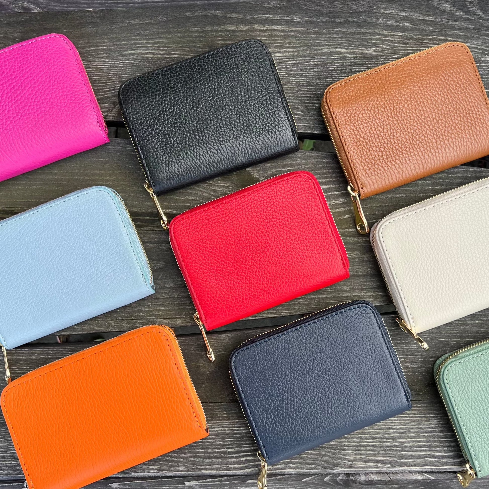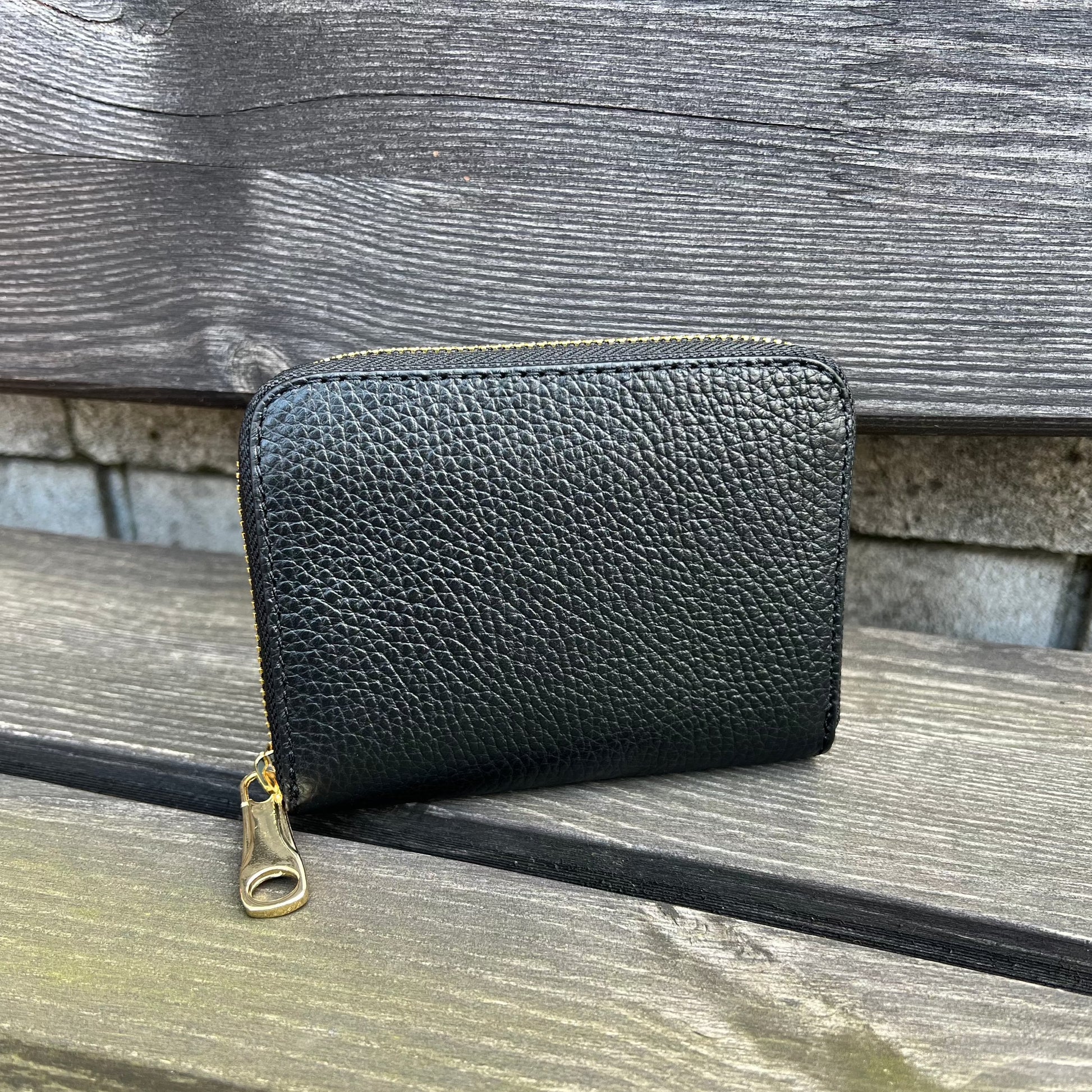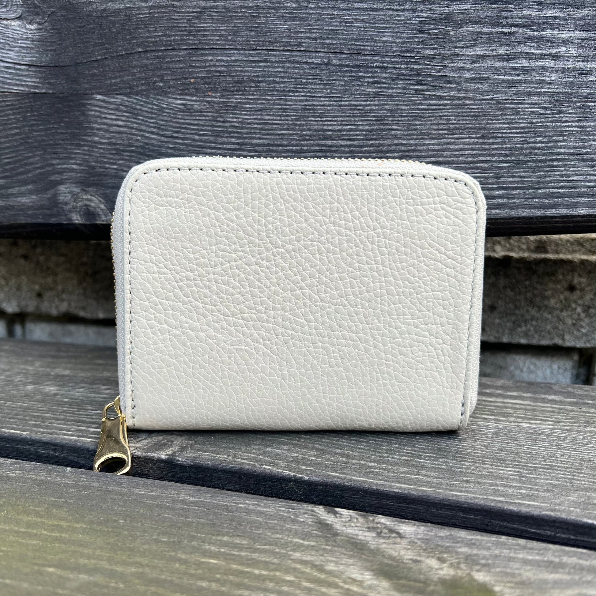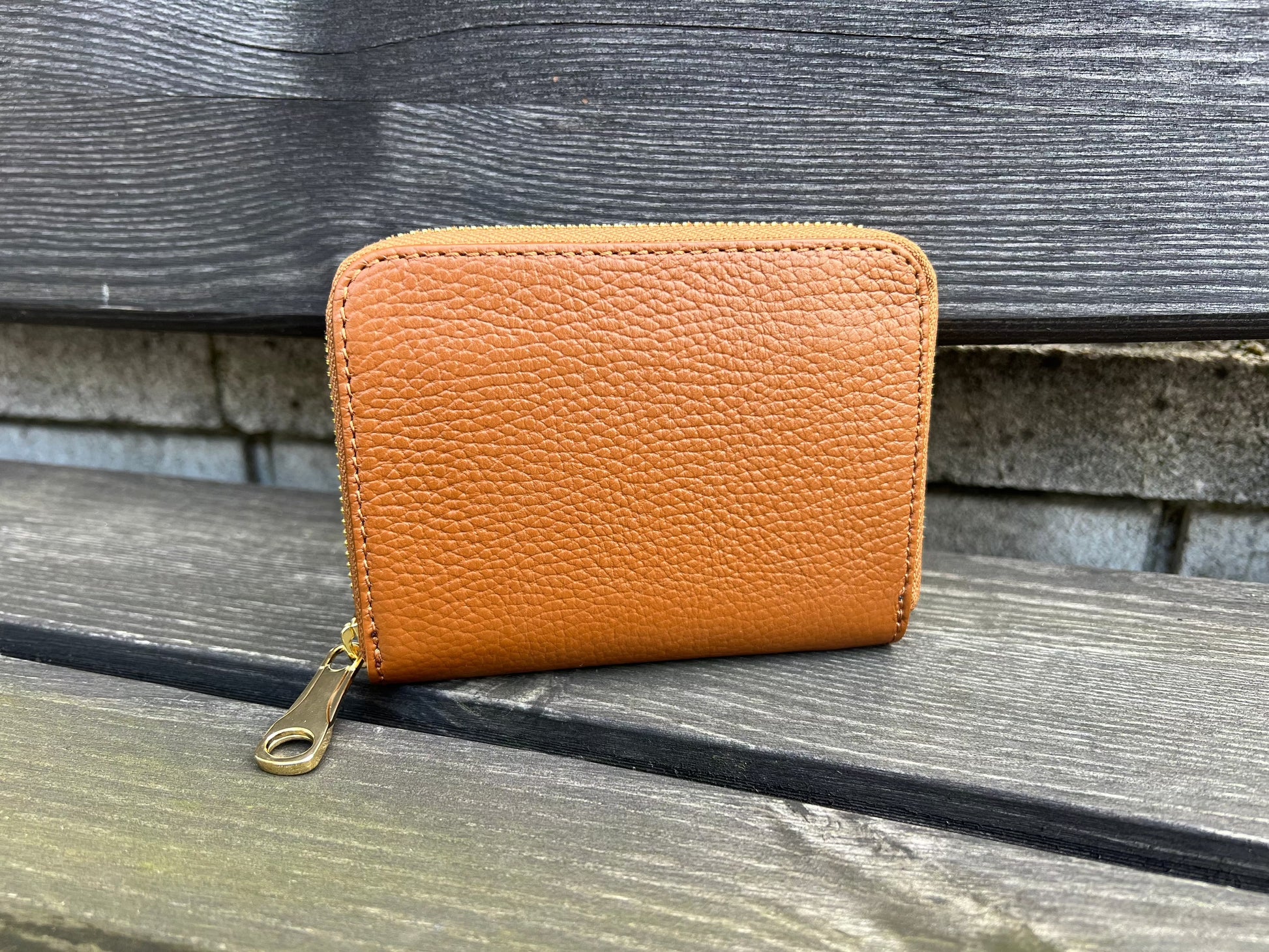 Im Lieferumfang enthalten ist eine Geldbörse aus Leder mit goldenem Zip.