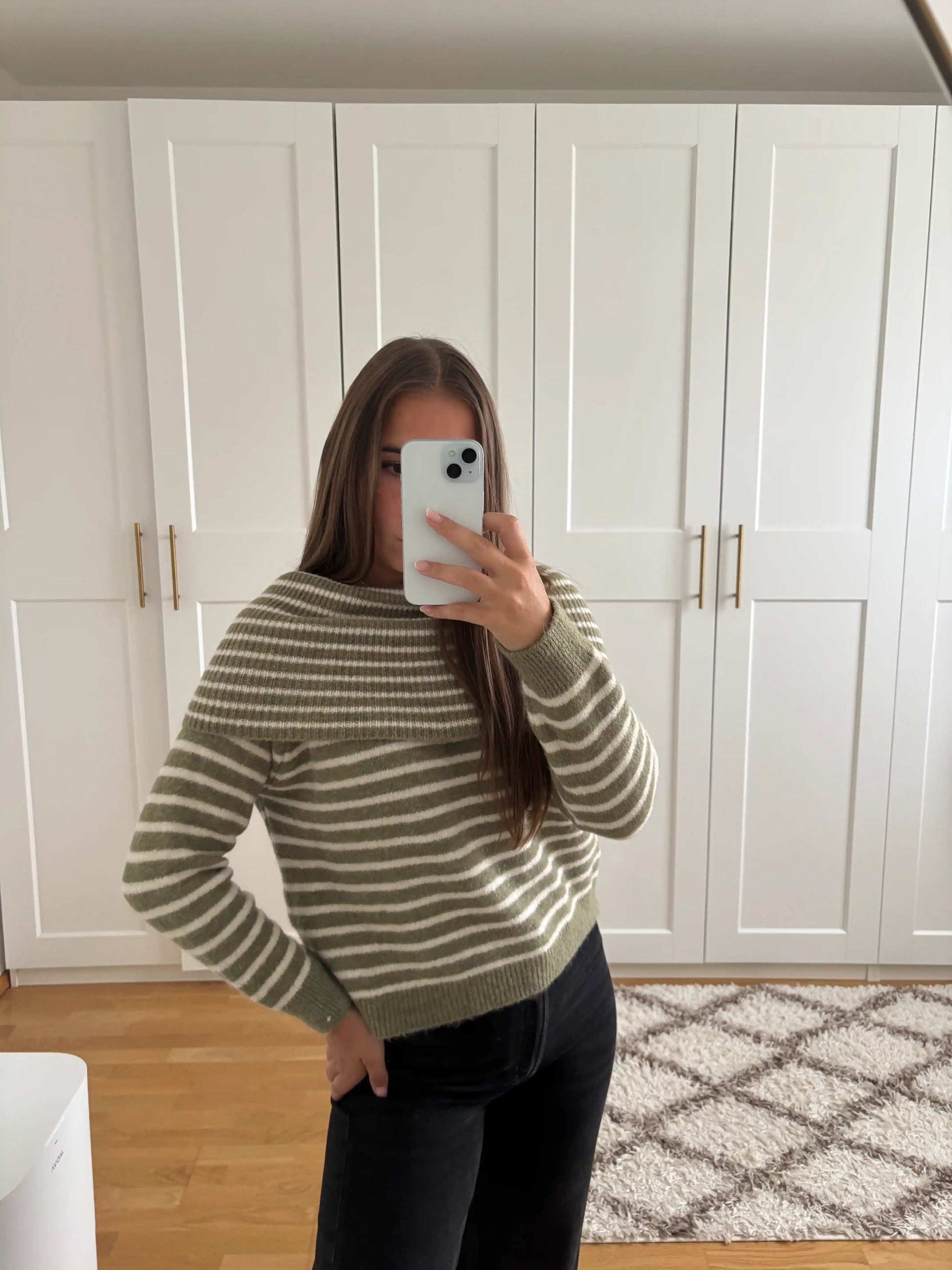 Gestreifter Strickpullover mit Rundhalsausschnitt und feinem Rippdetail am oberen Teil. Der lockere Schnitt kombiniert Gemütlichkeit mit einem modernen Look – perfekt für den Alltag.