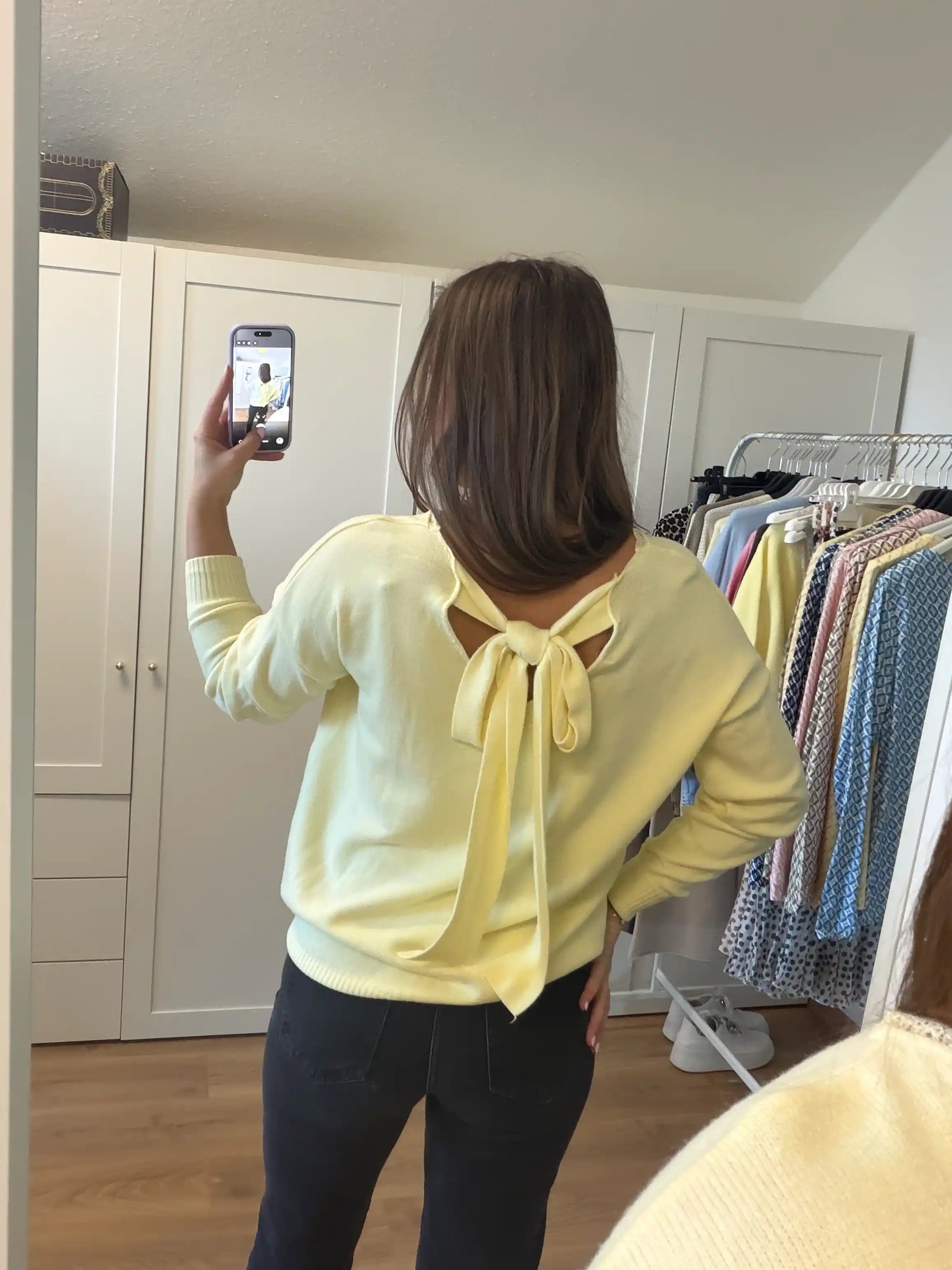 Femininer Feinstrickpullover mit besonderem Highlight: Vorne klassischer V-Ausschnitt mit zartem Spitzenabschluss, hinten ein dekorativer Rückenausschnitt mit Schleife.