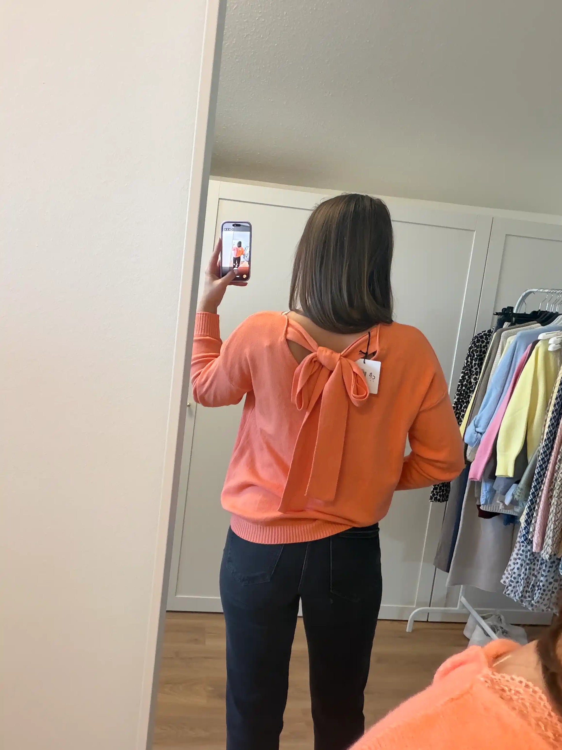 Femininer Feinstrickpullover mit besonderem Highlight: Vorne klassischer V-Ausschnitt mit zartem Spitzenabschluss, hinten ein dekorativer Rückenausschnitt mit Schleife.