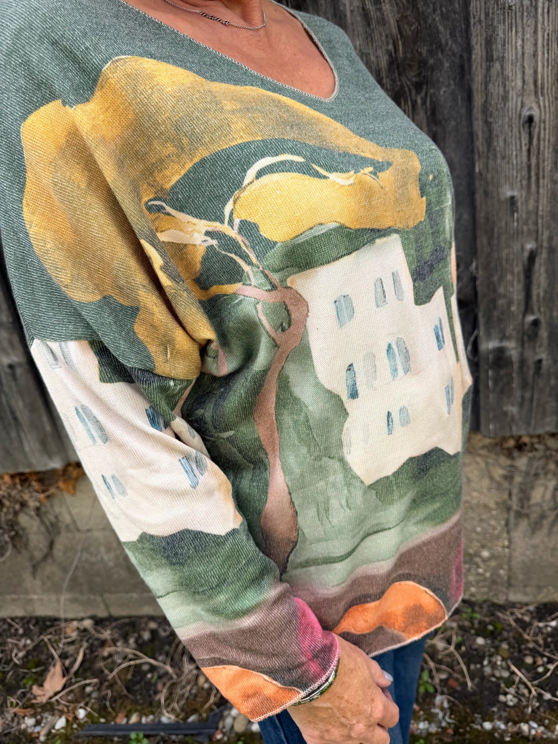 Der Pullover auf dem Bild hat einen lockeren, bequemen Schnitt mit langen Ärmeln und einem weiten, leicht abgerundeten Ausschnitt. Das auffällige Design zeigt ein malerisches Landschafts- oder Stadtmotiv, das sich über die gesamte Vorderseite und Ärmel erstreckt. Am unteren Saum und an den Ärmeln ist eine schmale Bordüre mit dekorativem Schriftzug zu sehen. Der Stoff wirkt weich und angenehm, ideal für einen künstlerisch-lässigen Stil.