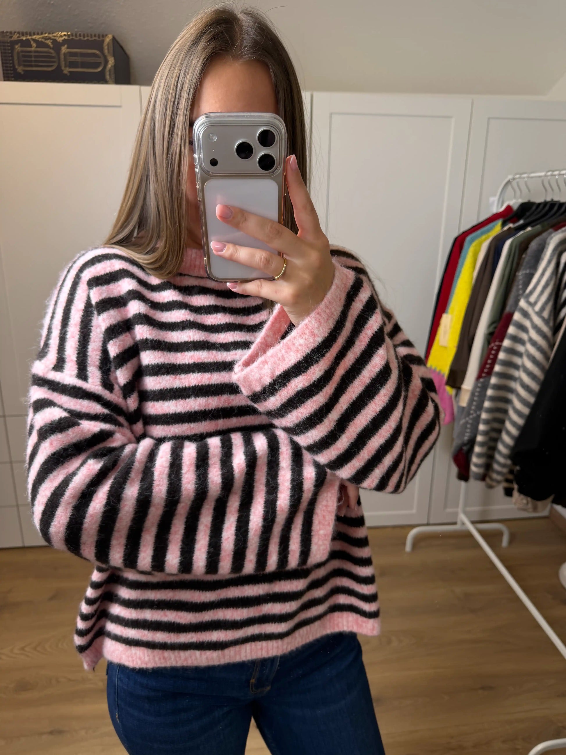 Kuscheliger Strickpullover mit weiten Ärmeln und klassischem Streifenmuster. Entspannter Fit für warme, stylische Alltagslooks.