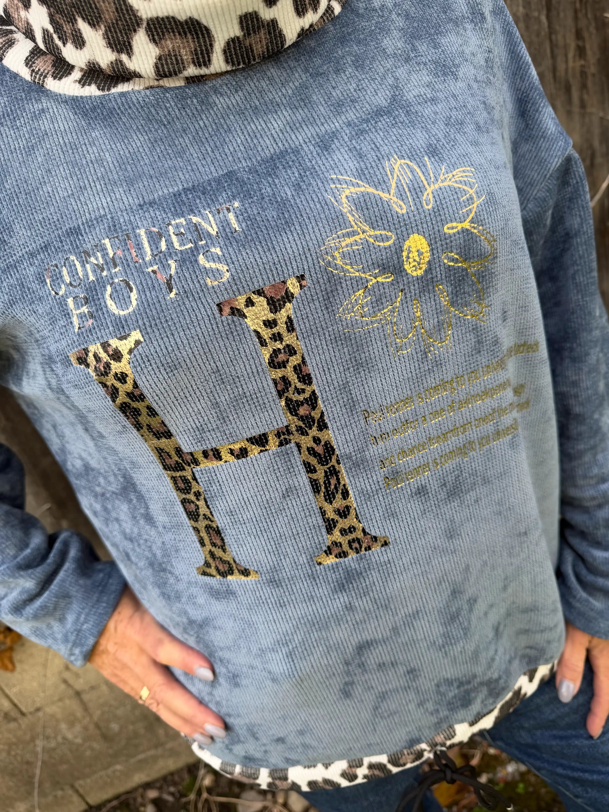 Der Pullover auf dem Bild hat einen lockeren, bequemen Schnitt mit langen Ärmeln und einem weiten, umgeschlagenen Kragen. Der Kragen sowie der Saum sind mit einem kontrastierenden Leopardenmuster versehen. Auf der Vorderseite befindet sich ein großes „H“ mit demselben Muster, daneben eine stilisierte Blume und einige dekorative Schriftzüge. Der Stoff wirkt weich und leicht strukturiert, ideal für einen gemütlichen, modischen Alltagslook.