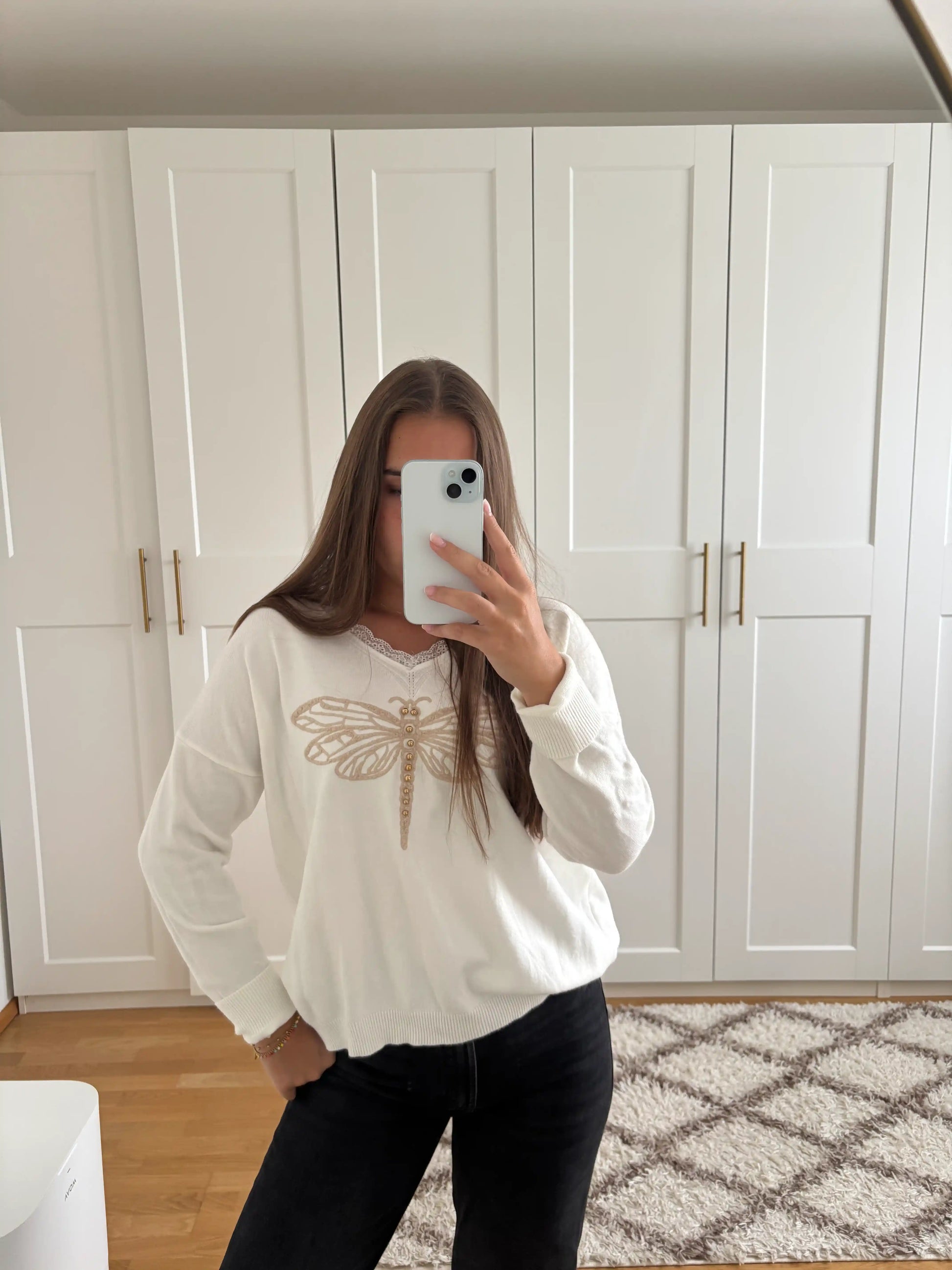 Leichter Strickpullover mit Rundhalsausschnitt und gerippten Abschlüssen. Das dekorative Frontmotiv (Libelle) verleiht dem Design einen edlen Akzent, während der lockere Schnitt für angenehmen Tragekomfort sorgt.