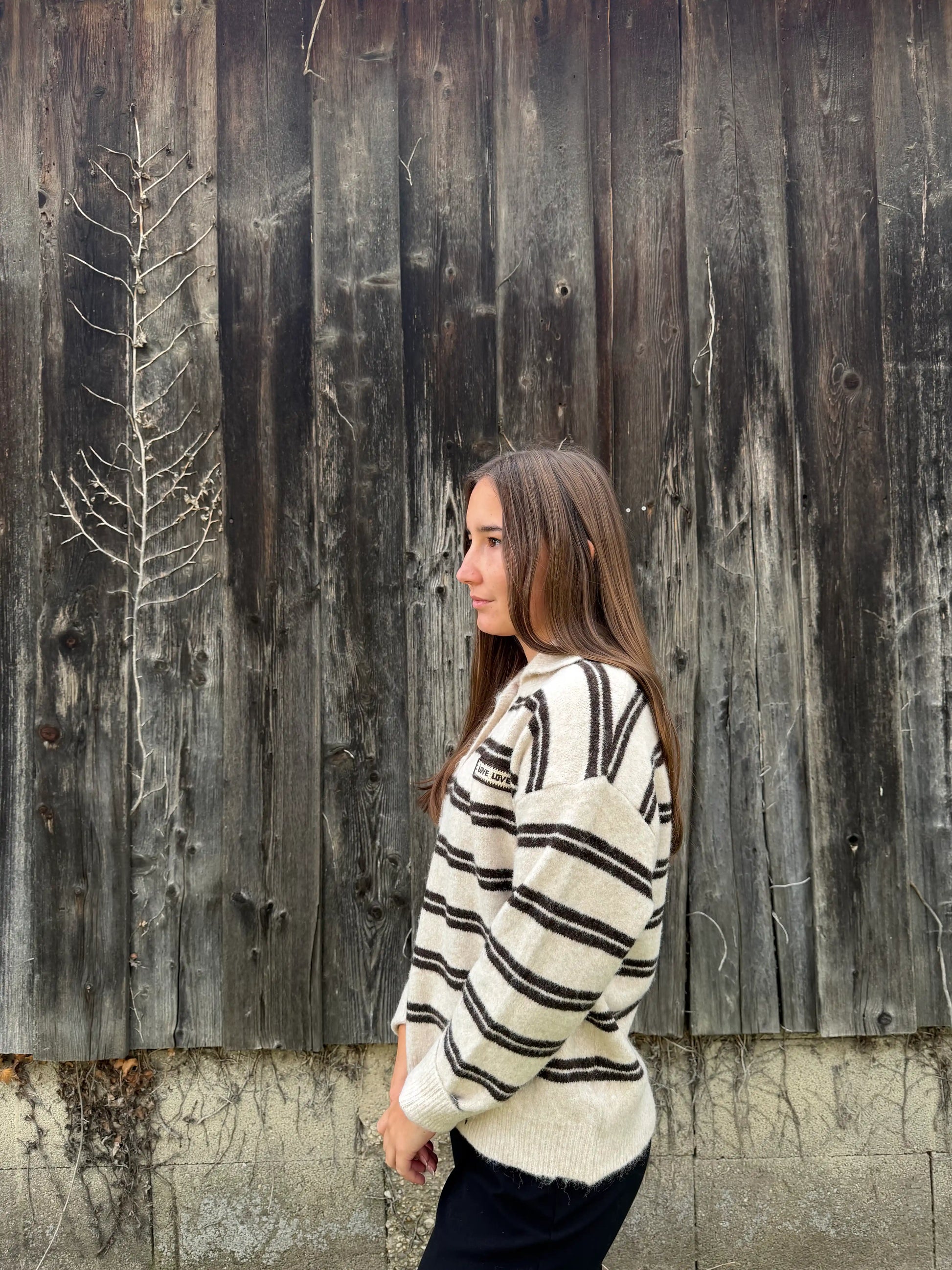 Gemütlicher Strickpullover im lässigen Streifenmuster. Das Modell kombiniert schokobraune Querstreifen mit feinen dunkelroten Akzenten. Ein klassischer Polokragen mit Knopfleiste sowie ein kleines Logo-Patch auf der Brust runden den sportlich-coolen Look ab.