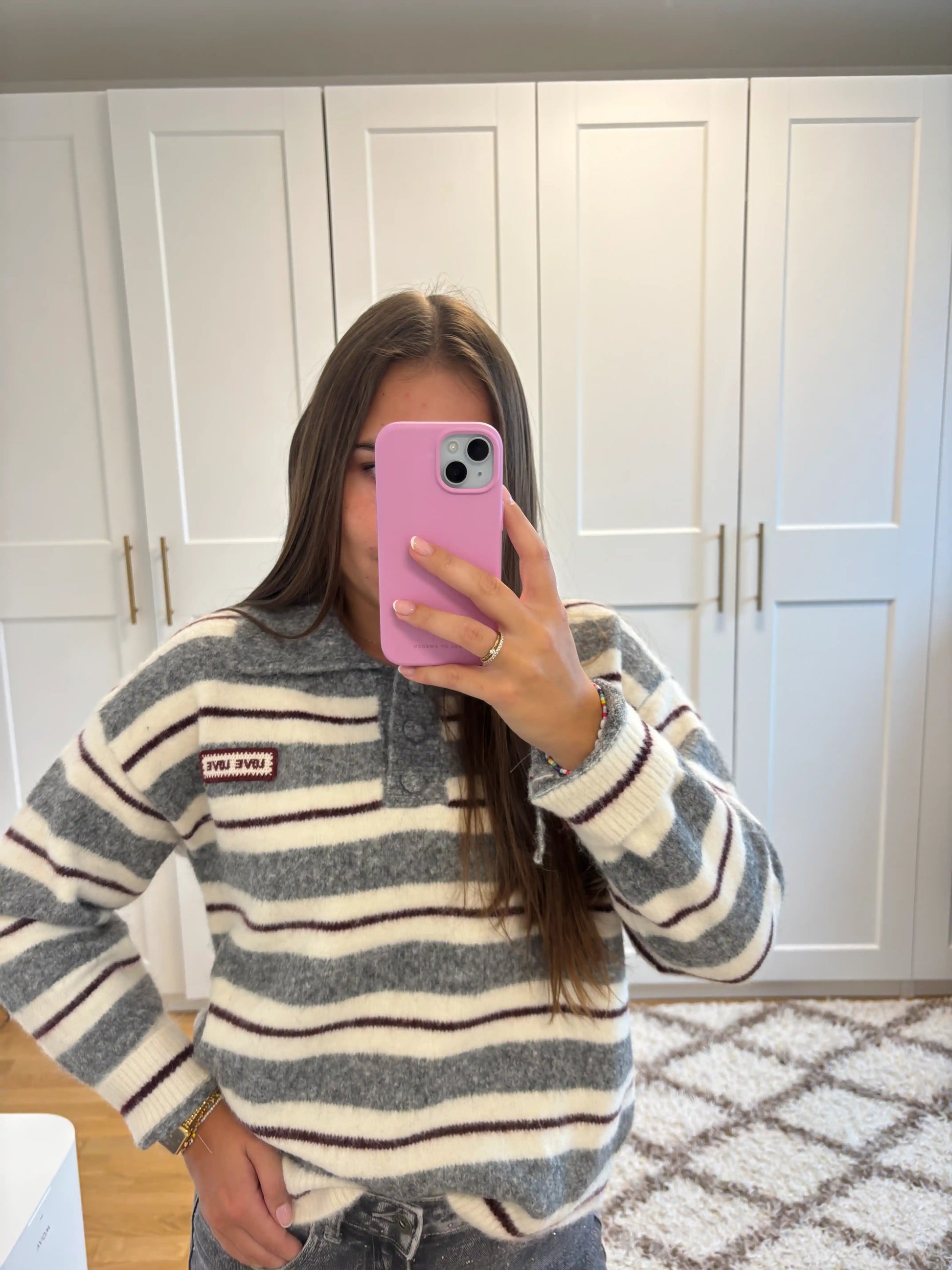 Gemütlicher Strickpullover im lässigen Streifenmuster. Das Modell kombiniert graue und cremefarbene Querstreifen mit feinen dunkelroten Akzenten. Ein klassischer Polokragen mit Knopfleiste sowie ein kleines Logo-Patch auf der Brust runden den sportlich-coolen Look ab.