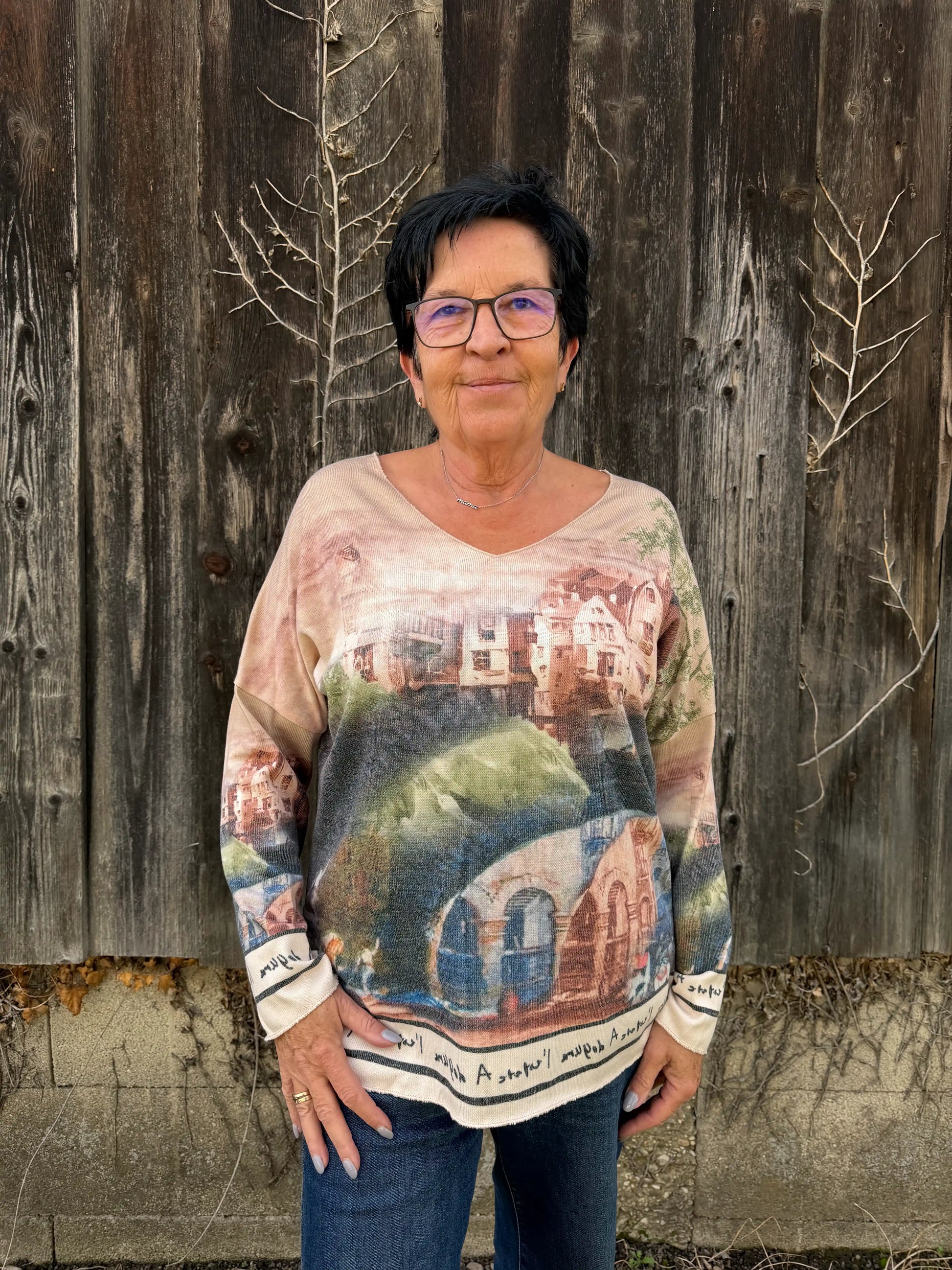 Der Pullover auf dem Bild hat einen lockeren, bequemen Schnitt mit langen Ärmeln und einem weiten, leicht abgerundeten Ausschnitt. Das auffällige Design zeigt ein malerisches Landschafts- oder Stadtmotiv, das sich über die gesamte Vorderseite und Ärmel erstreckt. Am unteren Saum und an den Ärmeln ist eine schmale Bordüre mit dekorativem Schriftzug zu sehen. Der Stoff wirkt weich und angenehm, ideal für einen künstlerisch-lässigen Stil.