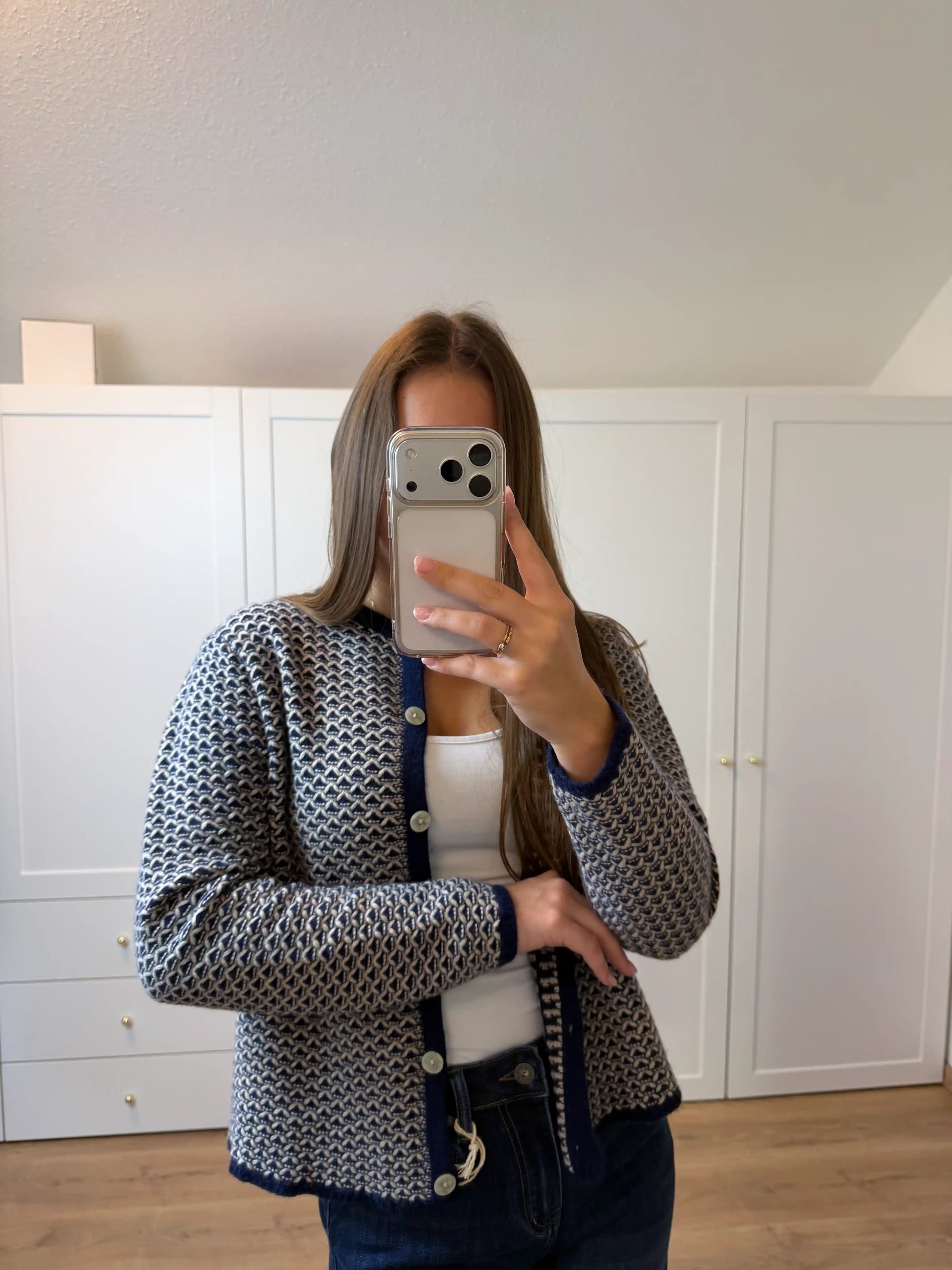 Elegante Strickjacke mit feinem Muster und kontrastierendem dunkelblauen Saum. Die Knöpfe verleihen dem klassischen Design eine edle Note. Perfekt kombinierbar mit Jeans oder Stoffhose für einen modernen, gepflegten Look.