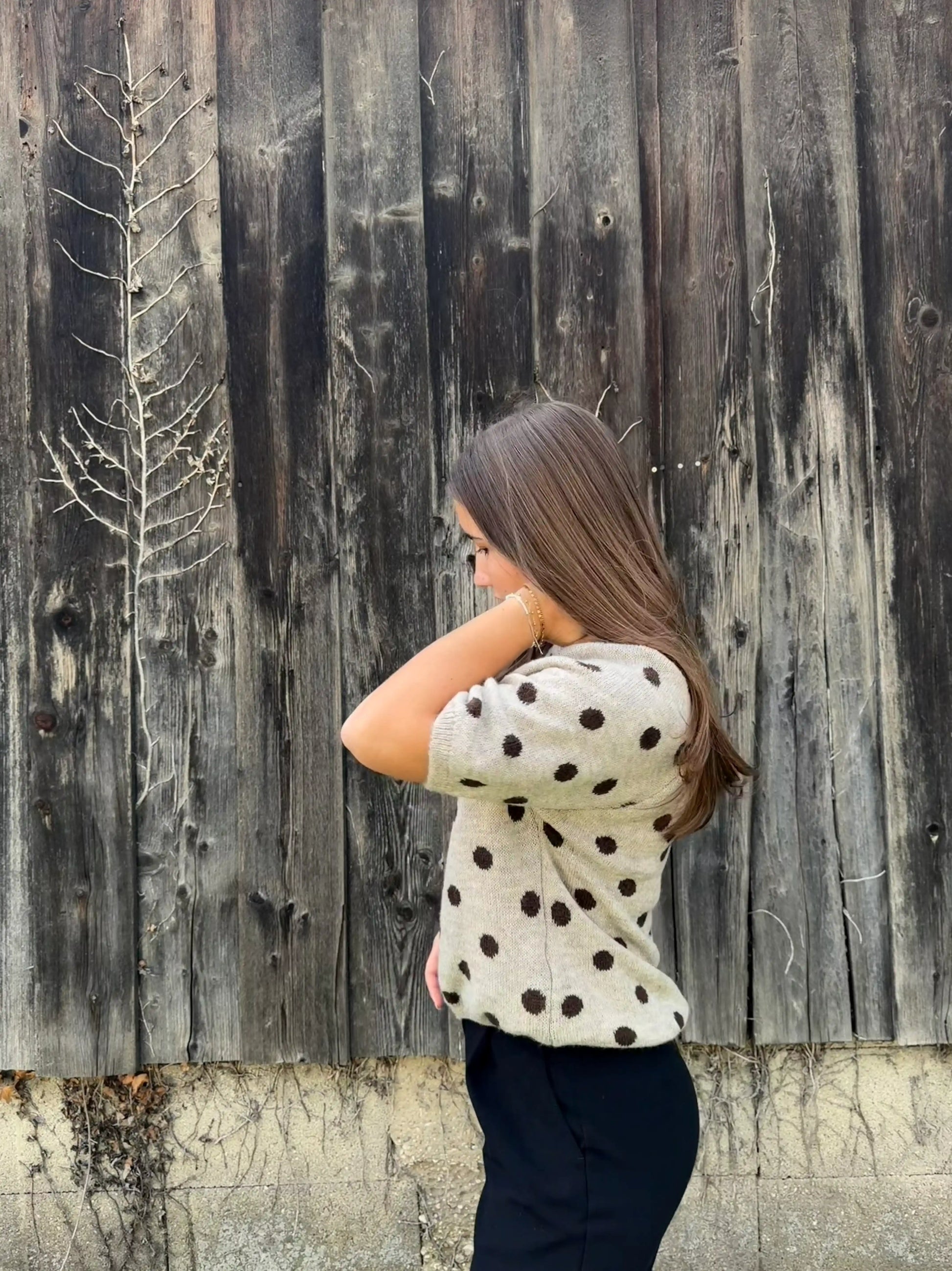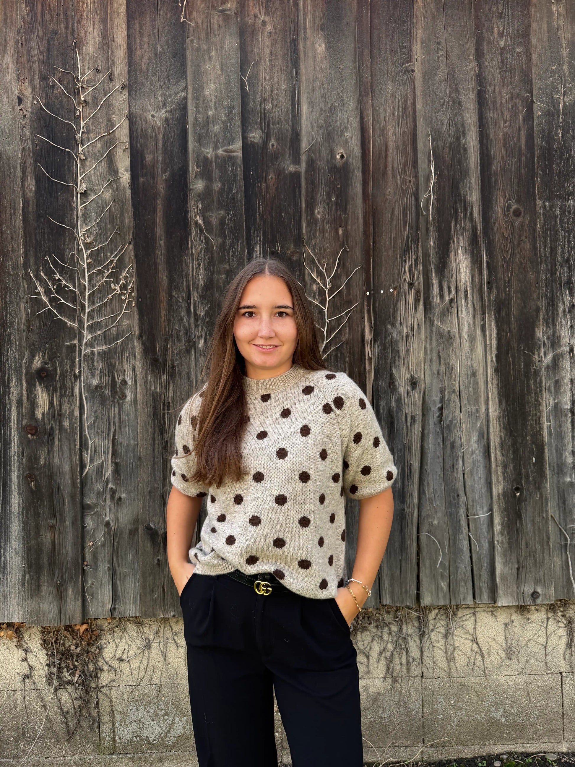 Der Pullover auf dem Bild ist kurzärmelig und hat einen lässig-bequemen Schnitt. Er ist mit einem auffälligen, gleichmäßig verteilten Punkte-Muster versehen, das ihm einen verspielten, aber dennoch eleganten Look verleiht. Der Rundhalsausschnitt sowie die Ärmel- und Saumabschlüsse sind fein gerippt. Das Material wirkt weich und kuschelig – ideal für die Übergangszeit oder als modisches Statement-Stück im Alltag.