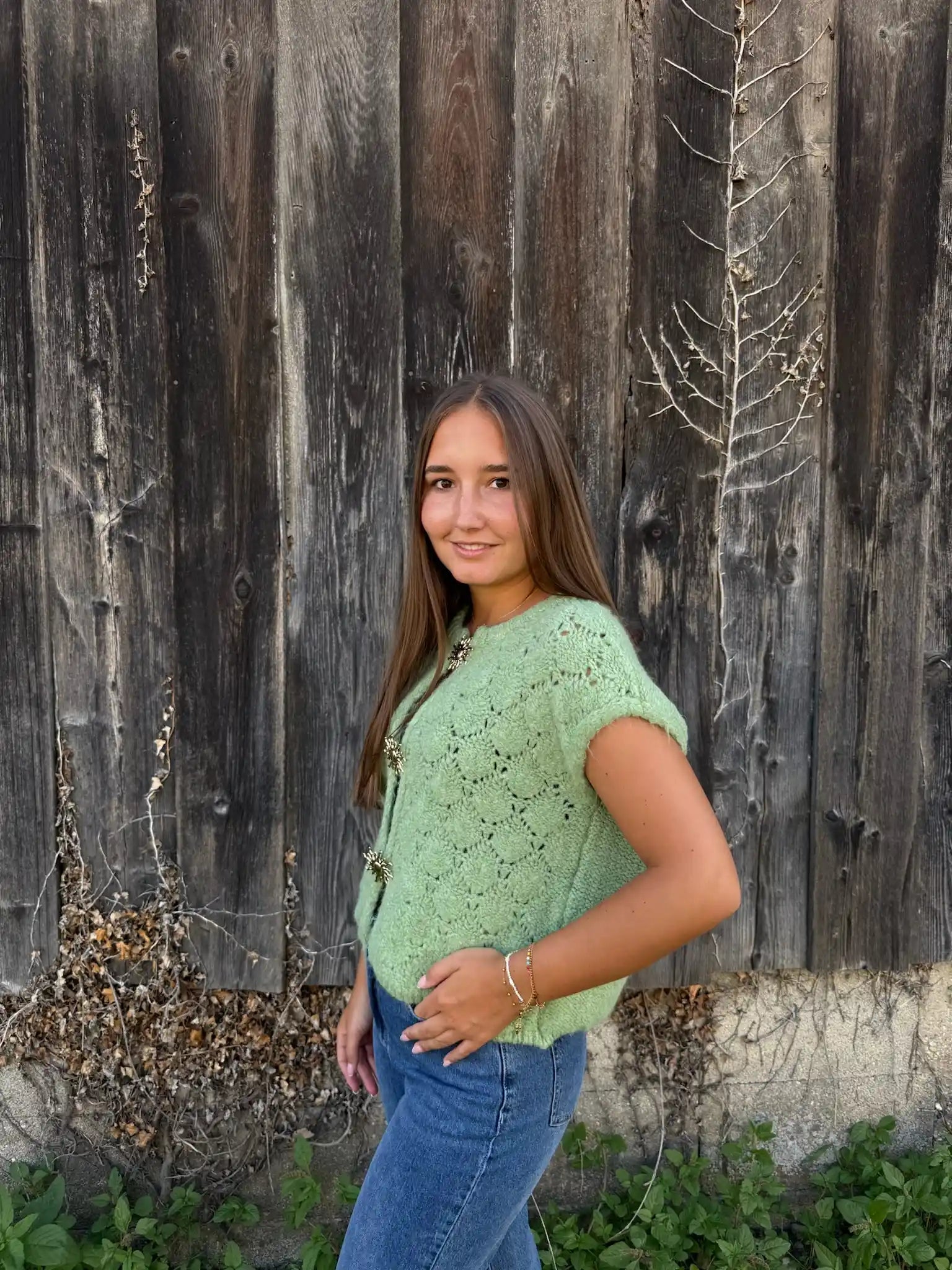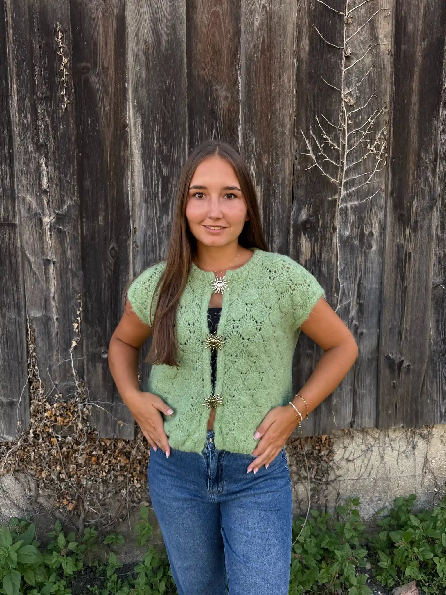 Dieser weiche Pullunder überzeugt mit schlichter Eleganz und einem süßen Highlight: ein goldener Stern ziert das tolle Oberteil mit Lochmuster.