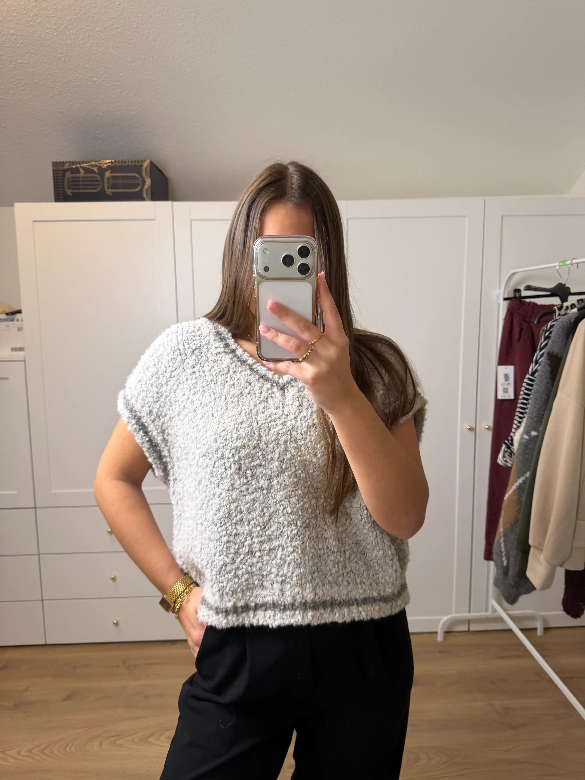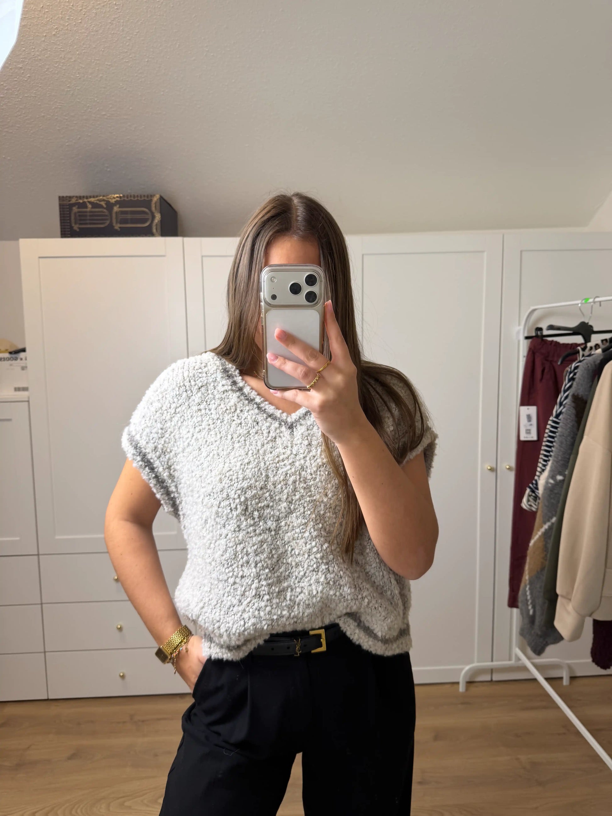 Der ärmellose Strickpullover im Oversize-Look überzeugt mit seinem modernen und zugleich gemütlichen Design. Das Modell ist in einem Grau gehalten und wird durch dezente dunkelgrauen Kontraststreifen am V-Ausschnitt sowie an den Saumkanten stilvoll abgerundet.