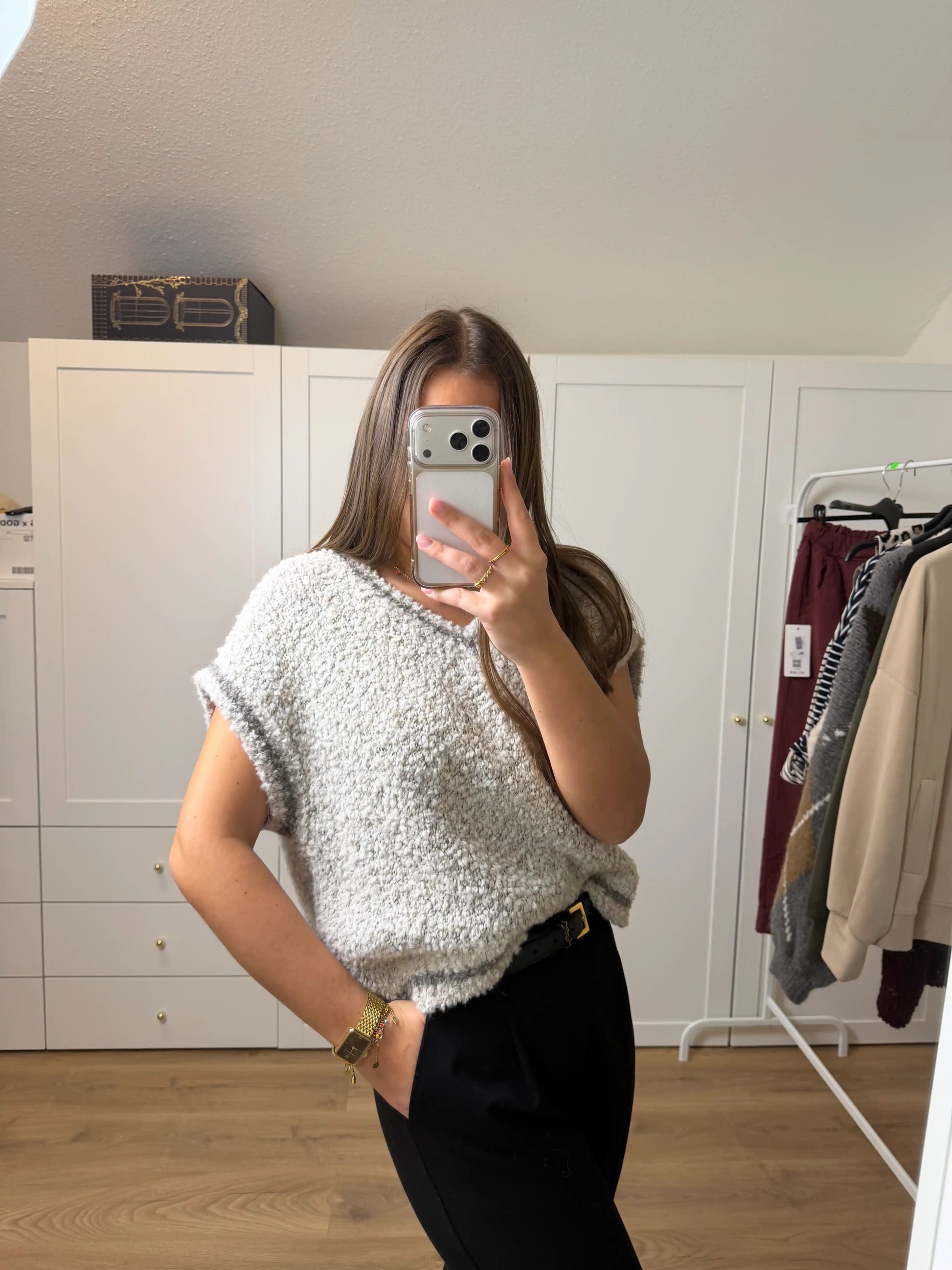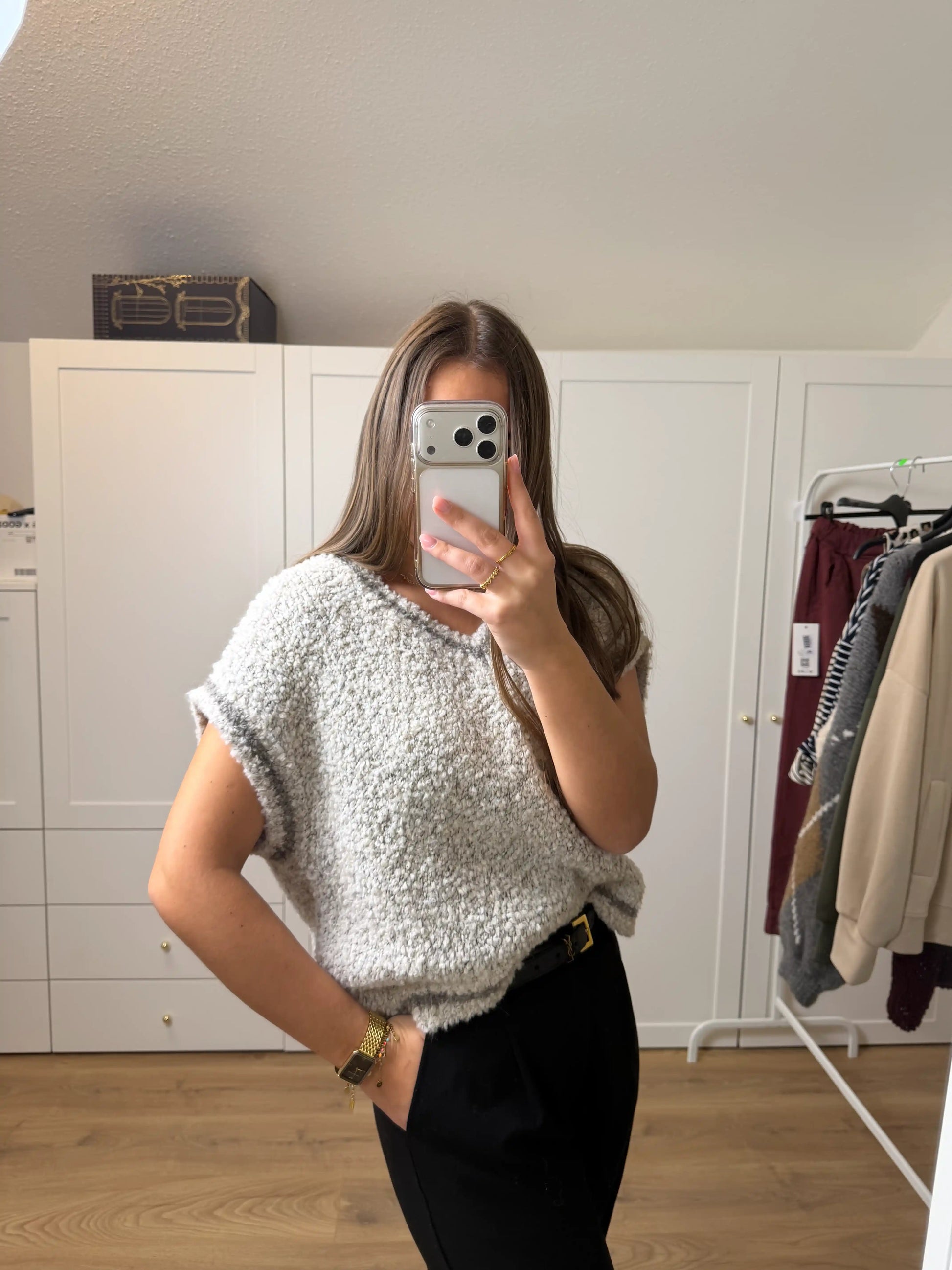 Gefertigt aus einer weichen, strukturierten Bouclé-Strickqualität, bietet der Pullover ein angenehmes Tragegefühl und eignet sich perfekt für den Lagen-Look. Durch die lockere Passform lässt er sich vielseitig kombinieren – ob über einem Langarmshirt, einer Bluse oder einem Kleid.