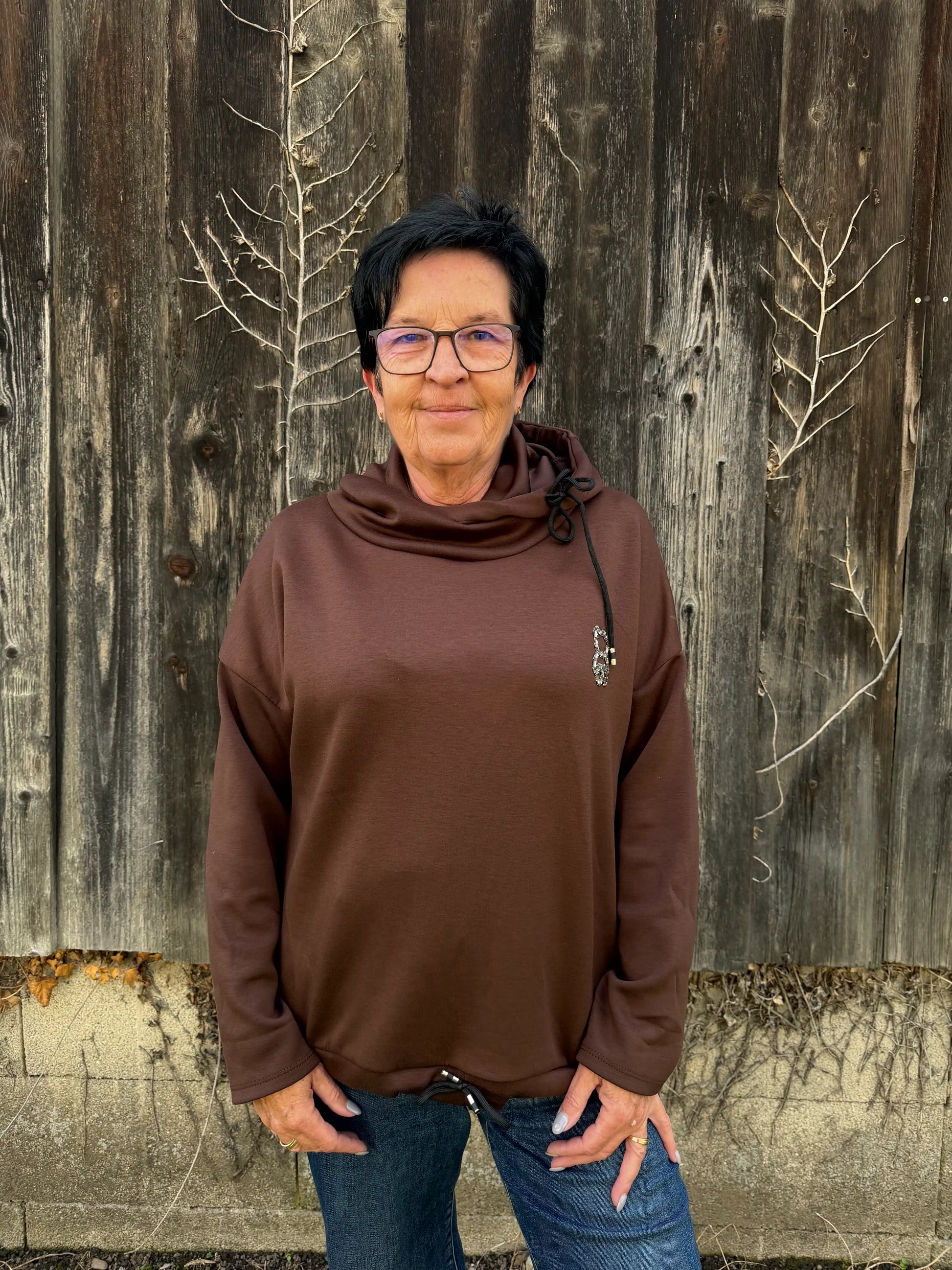 Der Pullover auf dem Bild hat einen lockeren, modernen Schnitt mit langen Ärmeln und einem hohen, weich fallenden Kragen, der mit einer Kordel verziert ist. Auch am Saum befindet sich eine Kordel mit Metallenden, um die Weite zu regulieren. Auf der linken Brustseite ist ein glitzernder Teddy-Applikation zu sehen, die dem schlichten Design einen verspielten und edlen Akzent verleiht. Der Stoff wirkt angenehm weich und leicht strukturiert – ideal für einen gemütlich-schicken Alltagslook.
