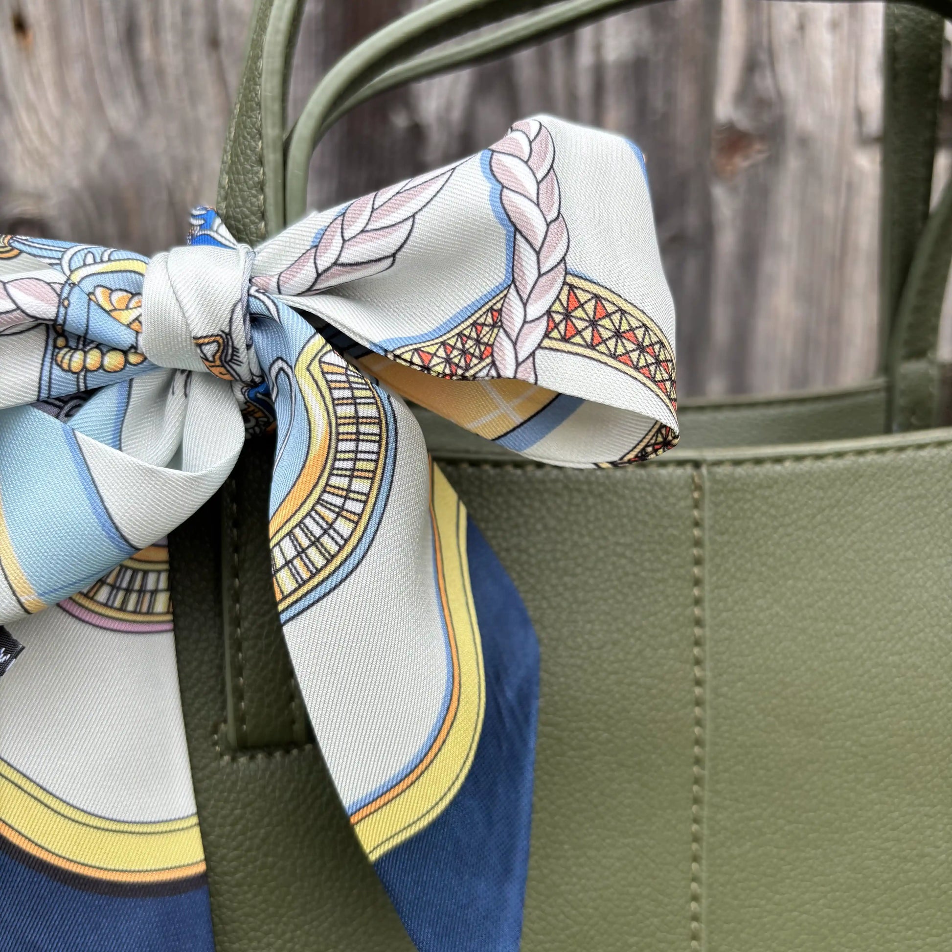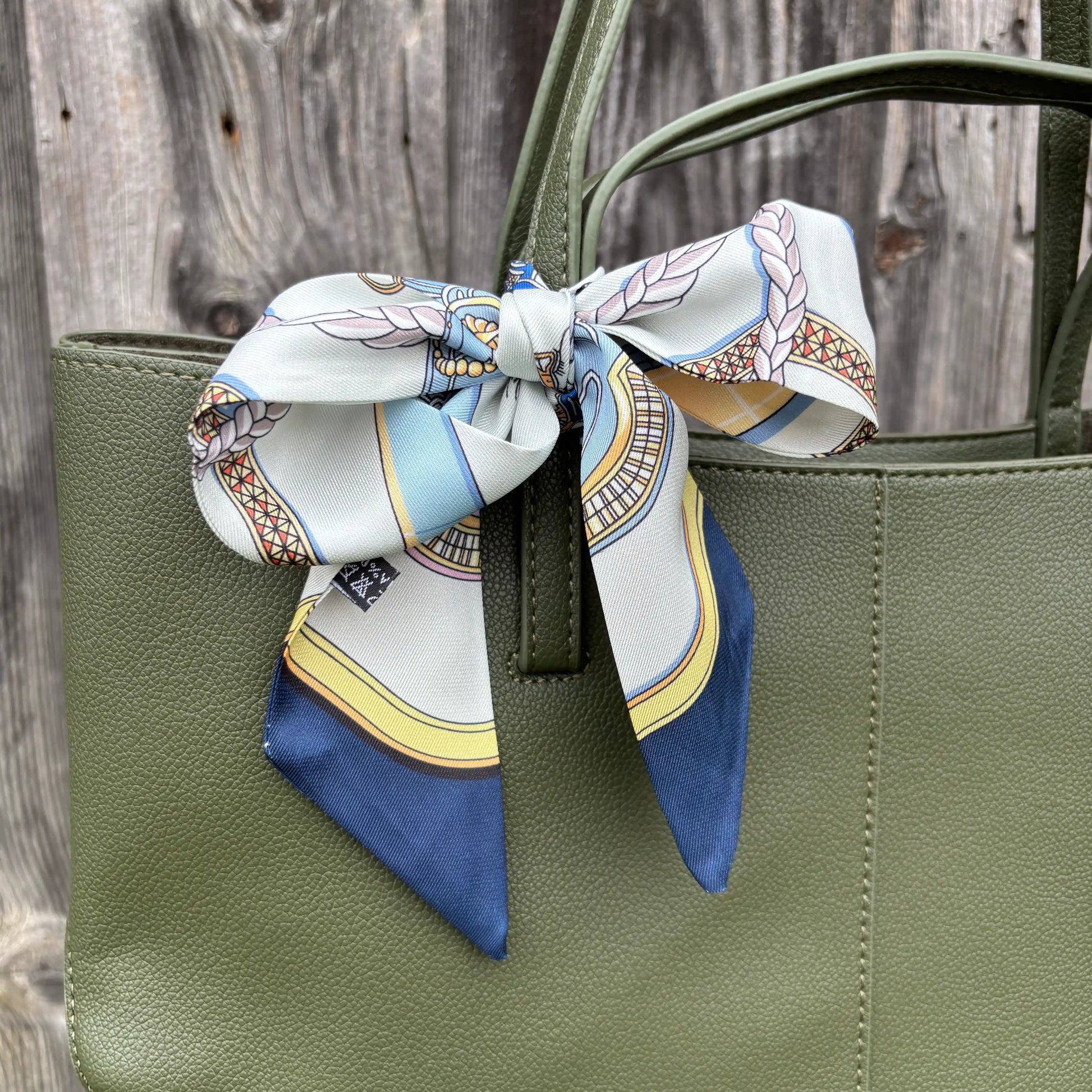 Verleihe deiner Handtasche das gewisse Etwas mit diesem farbenfrohen Taschentuchband. Der hochwertige, seidig glänzende Stoff mit buntem Streifen- und Kettenmuster in Pink, Blau, Gelb und Weiß setzt stilvolle Akzente. Einfach um den Henkel gebunden, wird deine Tasche im Handumdrehen zu einem echten Hingucker – perfekt für ein frisches, lebendiges Styling.