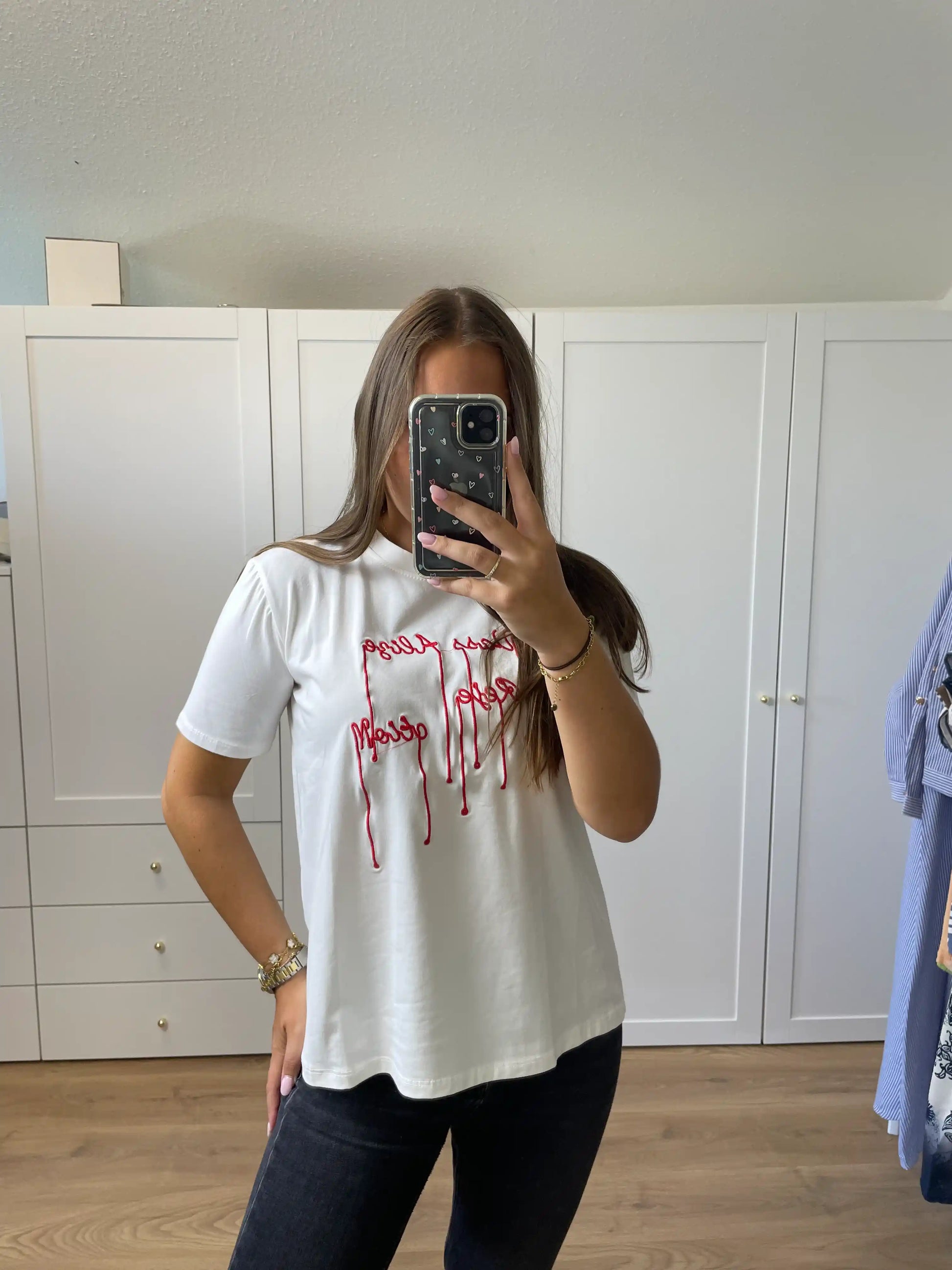 Stylisches Shirt mit auffälliger, aufgestickter Statement-Schrift im Frontbereich. Die Stickerei im Faden-Design sorgt für einen kreativen, leicht verspielten Look. Ein modisches Highlight für alle, die es lässig und individuell mögen. Ideal kombinierbar zu Jeans oder Röcken.