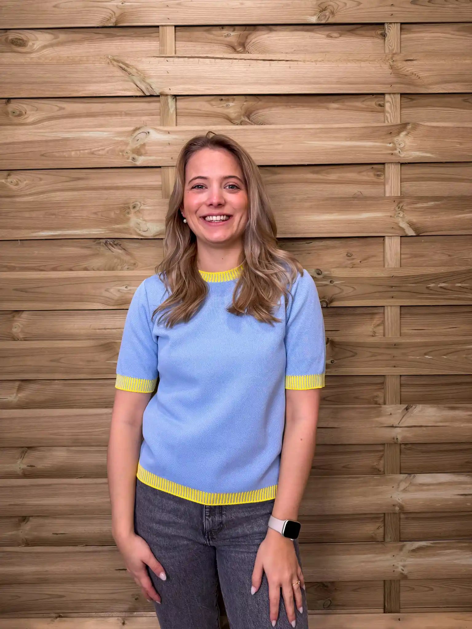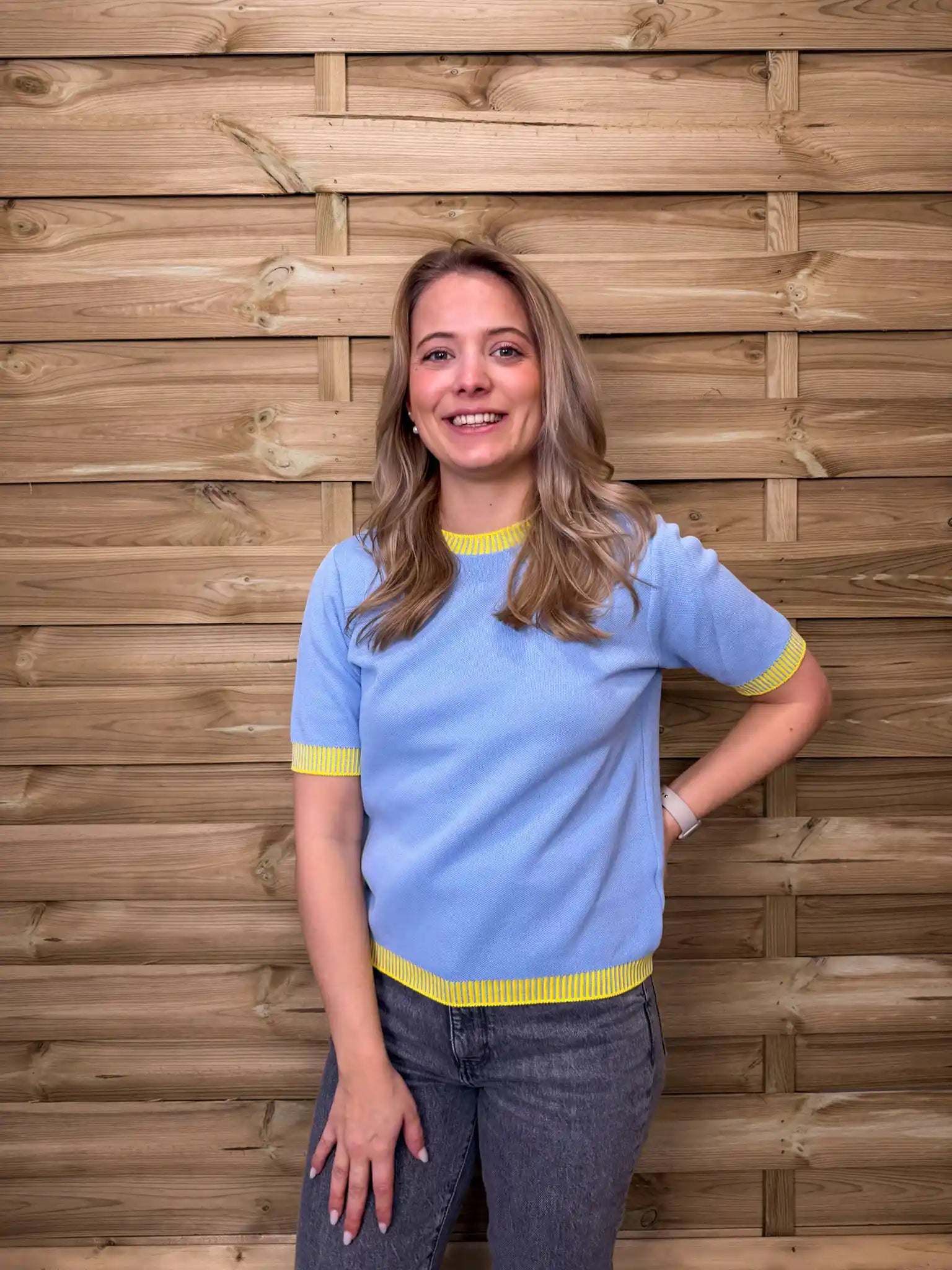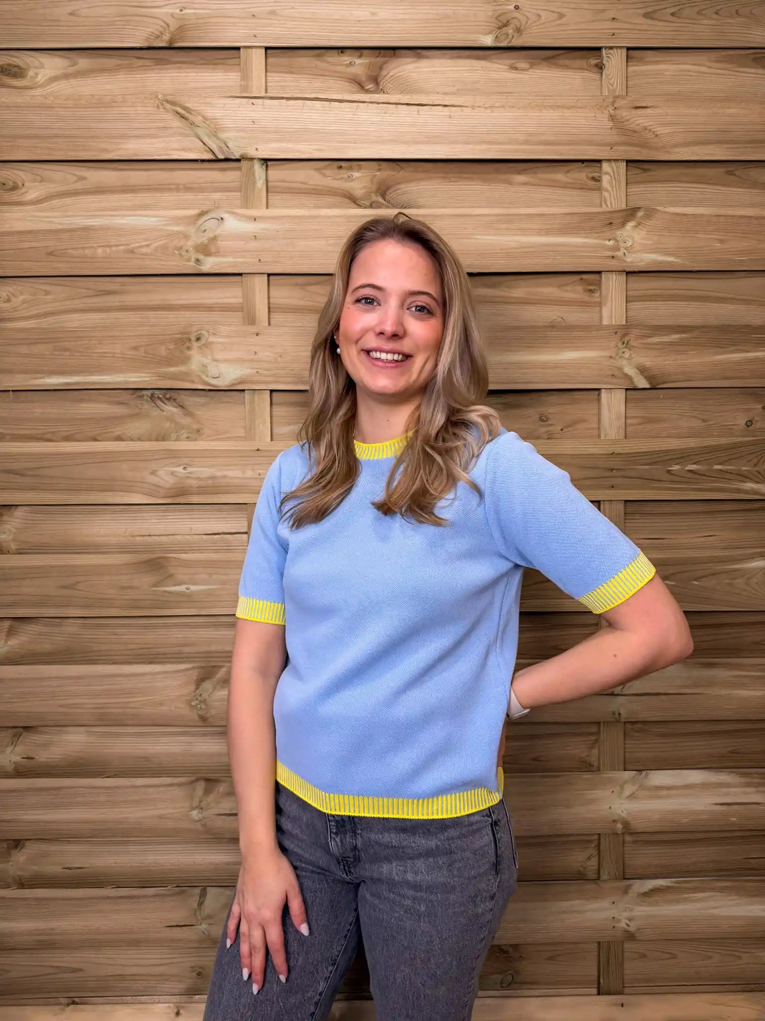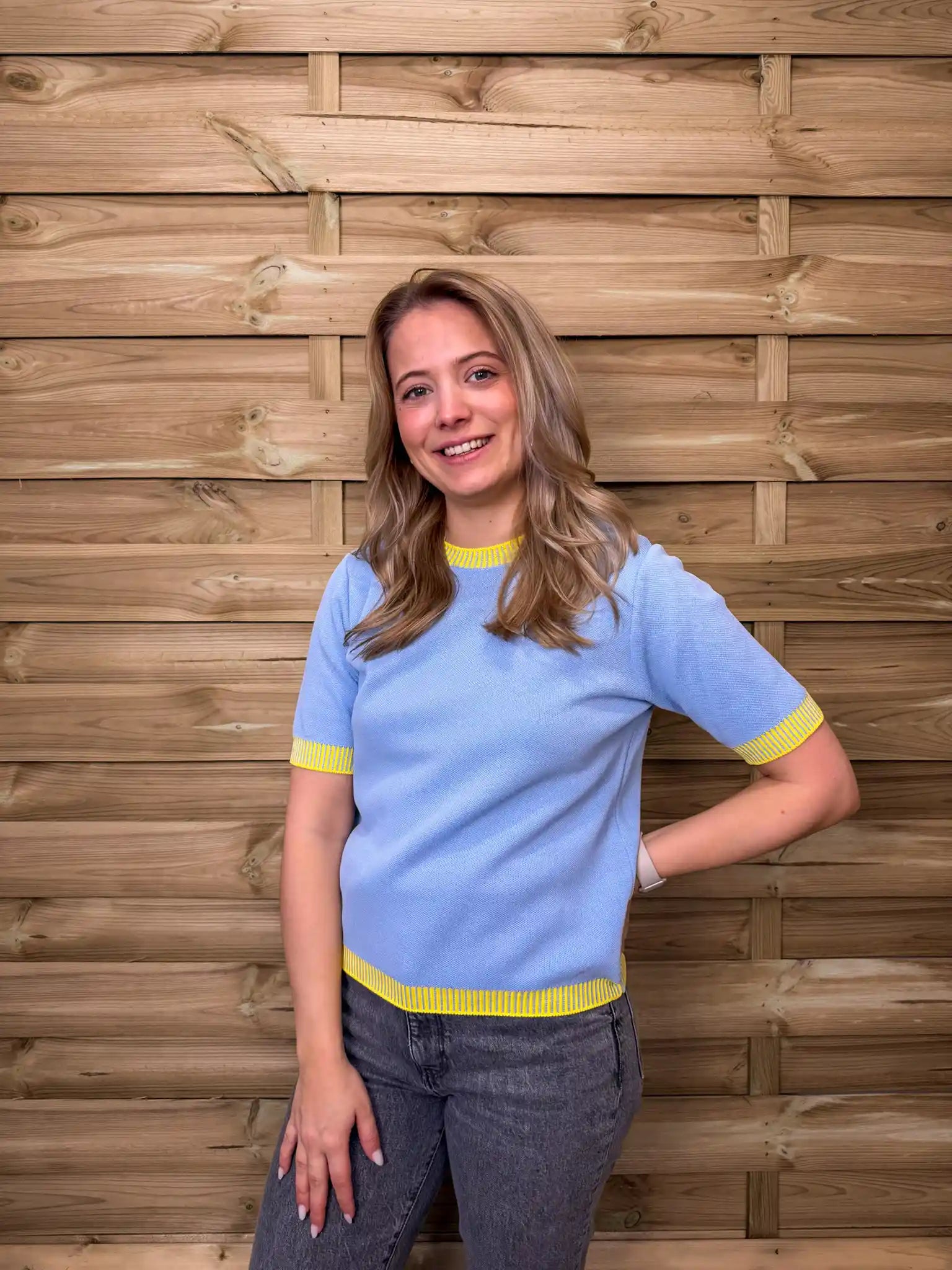 Strahlender Feinstrickpullover in leuchtendem Blau mit verspielten Gelben Kontrastabschlüssen an Kragen, Ärmeln und Saum. Der kurze Arm und der weiche Strick sorgen für einen frischen, sommerlichen Look mit besonderem Farbakzent.