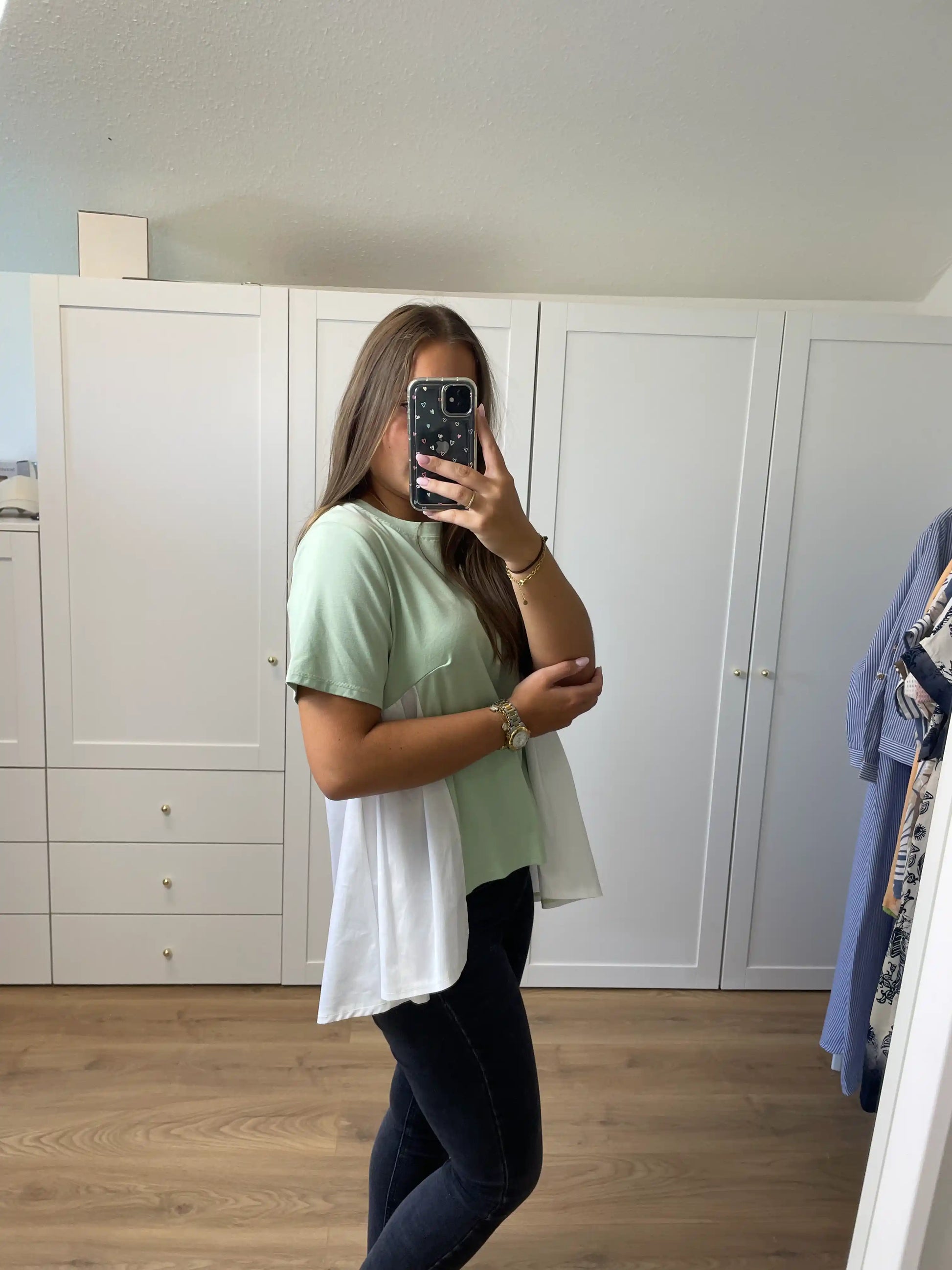 Dieses Shirt überzeugt mit einem lässigen Schnitt und raffiniertem Design: Seitlich eingesetzte Kontraststoffe sorgen für eine luftige Silhouette und modernen Look. Der fließende Fall macht es besonders angenehm zu tragen – ideal für warme Tage und entspannte Outfits mit modischem Twist.