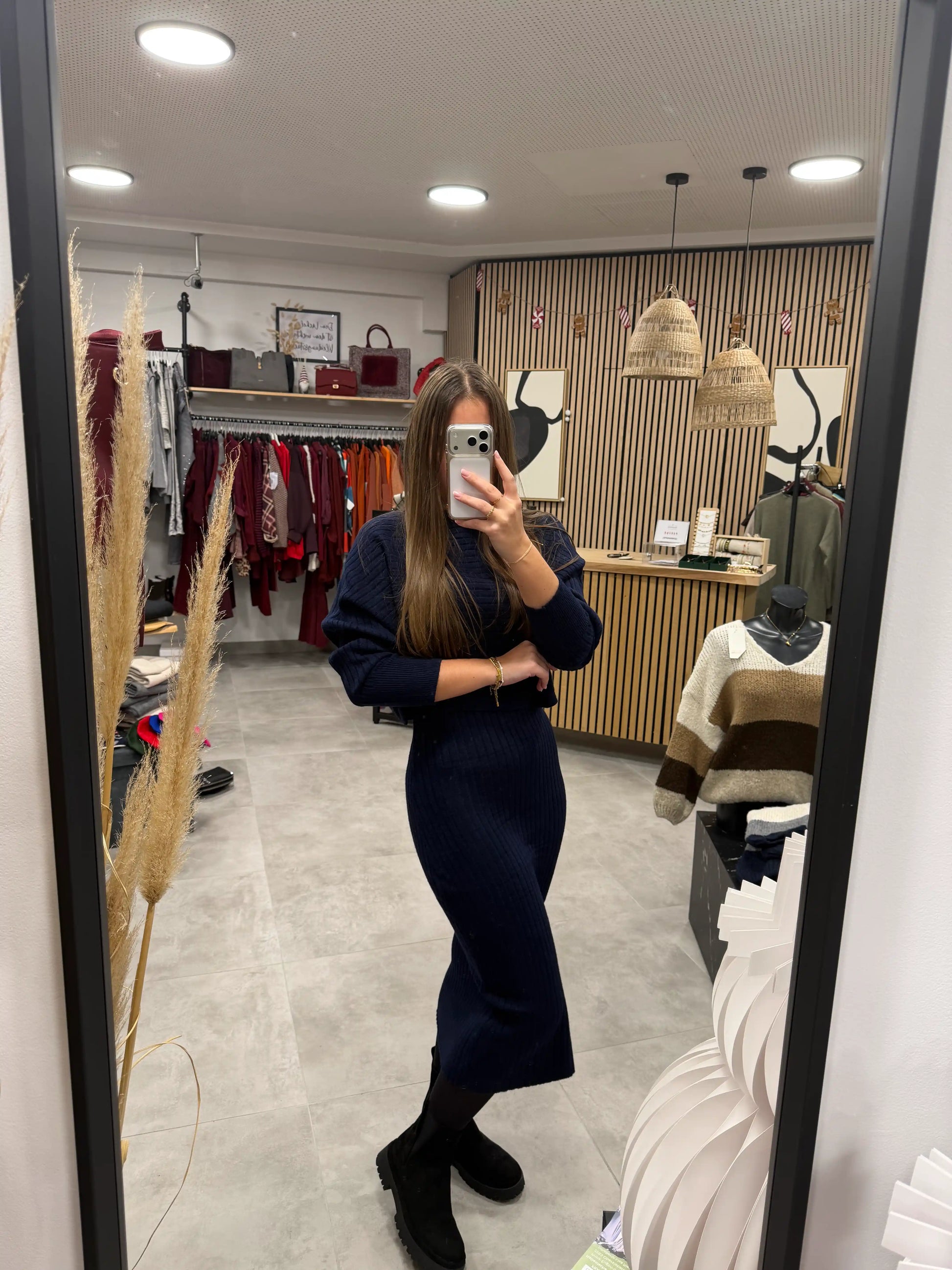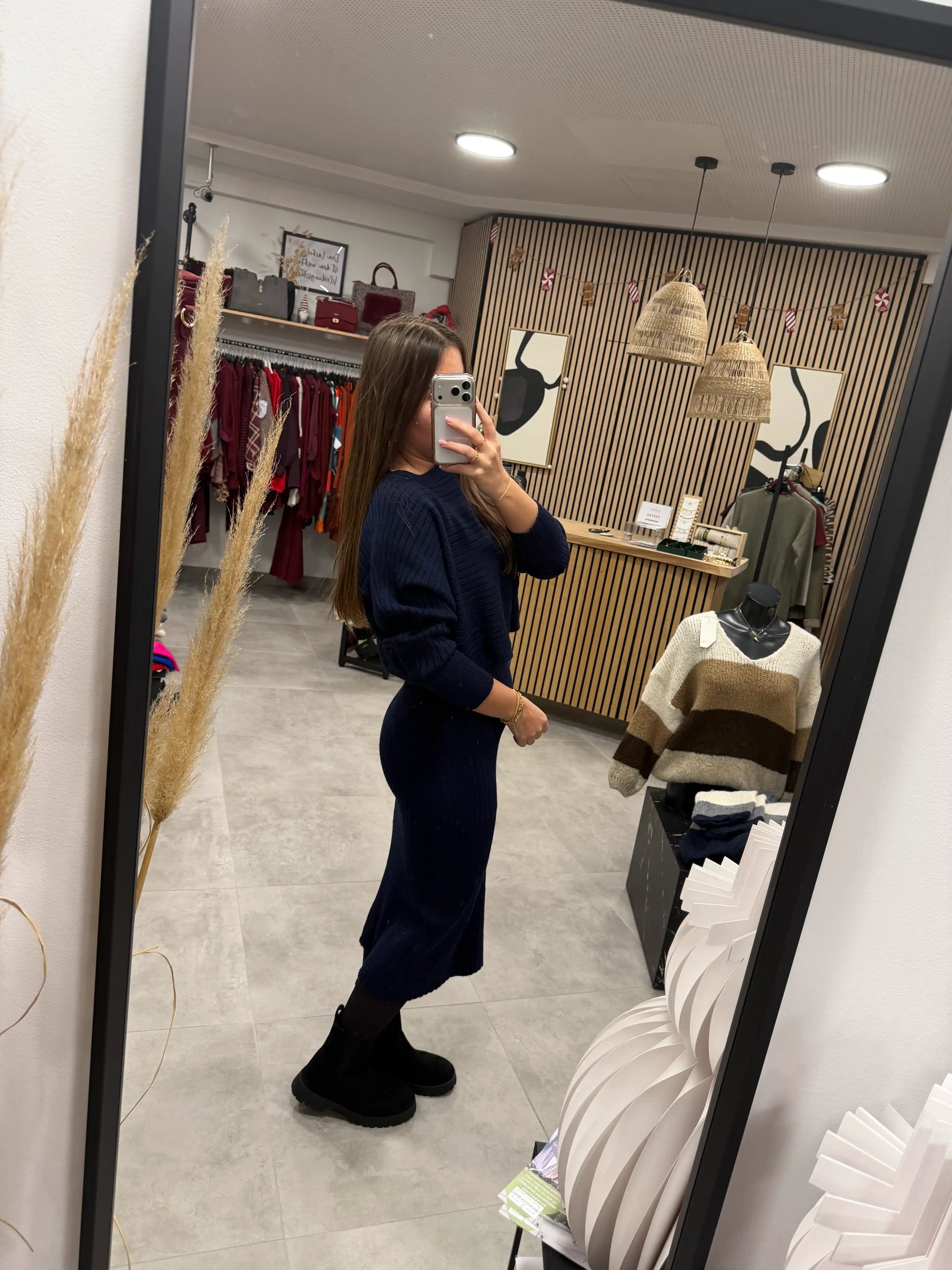 Zweiteiliges Strick-Set bestehend aus einem figurbetonten, gerippten Kleid und einem locker geschnittenen Pullover, der lässig darüber getragen wird. Das Zusammenspiel aus körpernaher Basis und entspanntem Überwurf sorgt für eine moderne Layering-Optik mit hohem Tragekomfort. Vielseitig kombinierbar und perfekt für einen stilvollen, unkomplizierten Look.