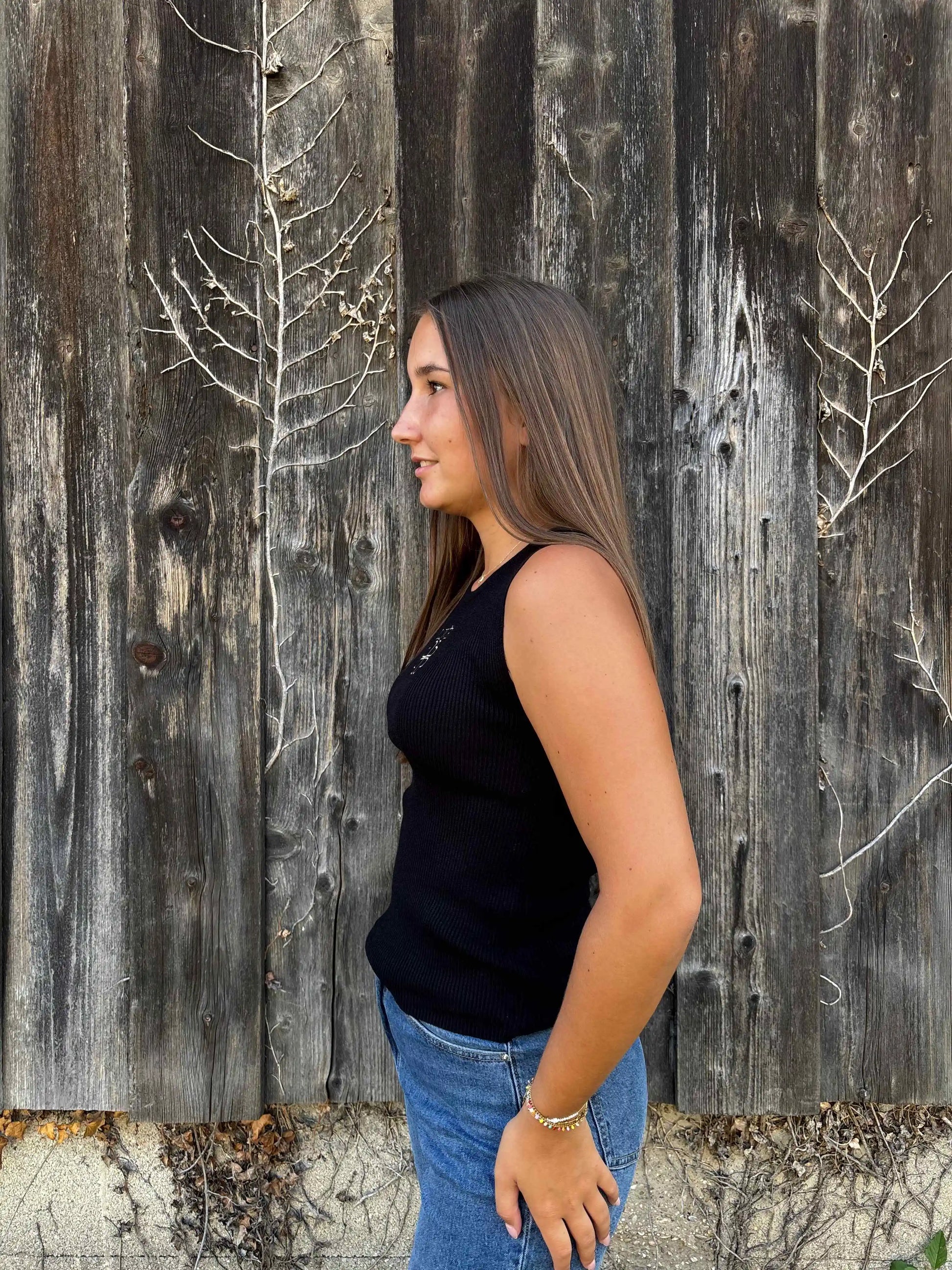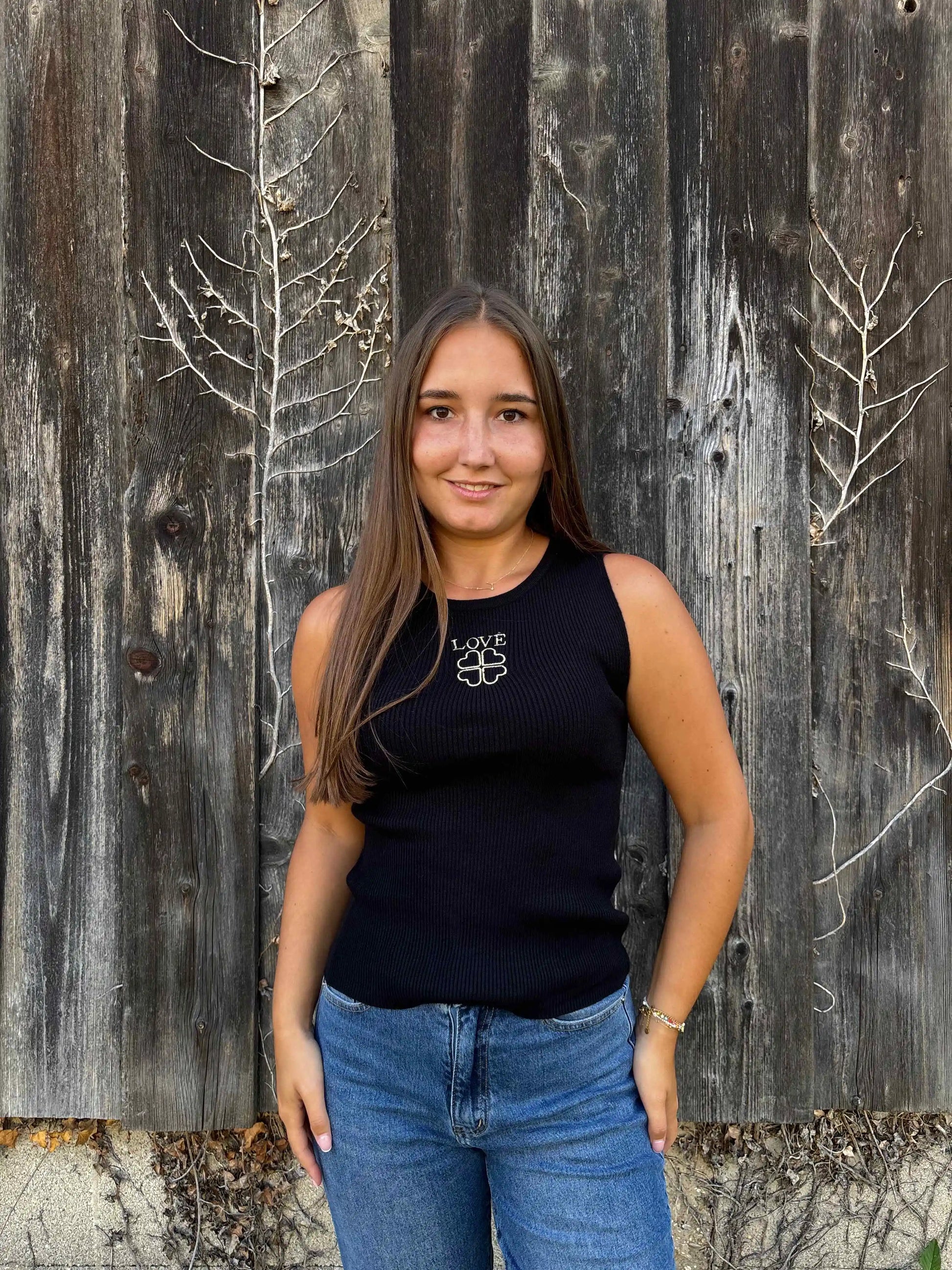 Mit klarer Linie und feinem Rippenstrick bringt dieses ärmellose Top Eleganz und Lässigkeit in Einklang. Der zentrierte Schriftzug „LOVE“ samt stilisiertem Kleeblatt setzt ein dezentes, aber ausdrucksstarkes Detail. Die körpernahe Passform schmeichelt der Figur und macht das Oberteil zum idealen Essential für vielseitige Looks – ob solo getragen oder als Basic unter Jacke oder Blazer. Ein echtes Must-have mit Botschaft.