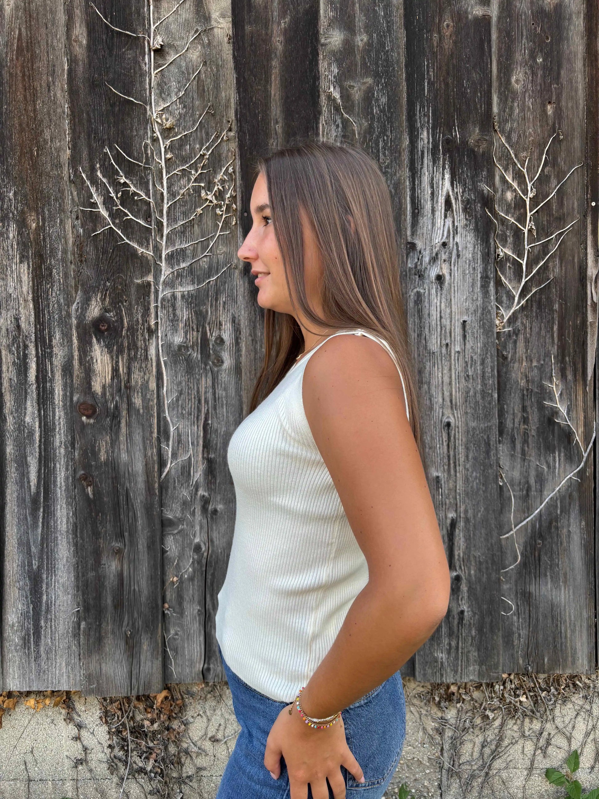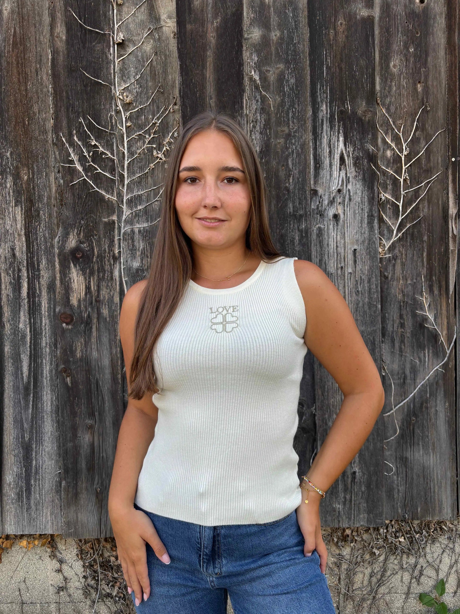 Mit klarer Linie und feinem Rippenstrick bringt dieses ärmellose Top Eleganz und Lässigkeit in Einklang. Der zentrierte Schriftzug „LOVE“ samt stilisiertem Kleeblatt setzt ein dezentes, aber ausdrucksstarkes Detail. Die körpernahe Passform schmeichelt der Figur und macht das Oberteil zum idealen Essential für vielseitige Looks – ob solo getragen oder als Basic unter Jacke oder Blazer. Ein echtes Must-have mit Botschaft.