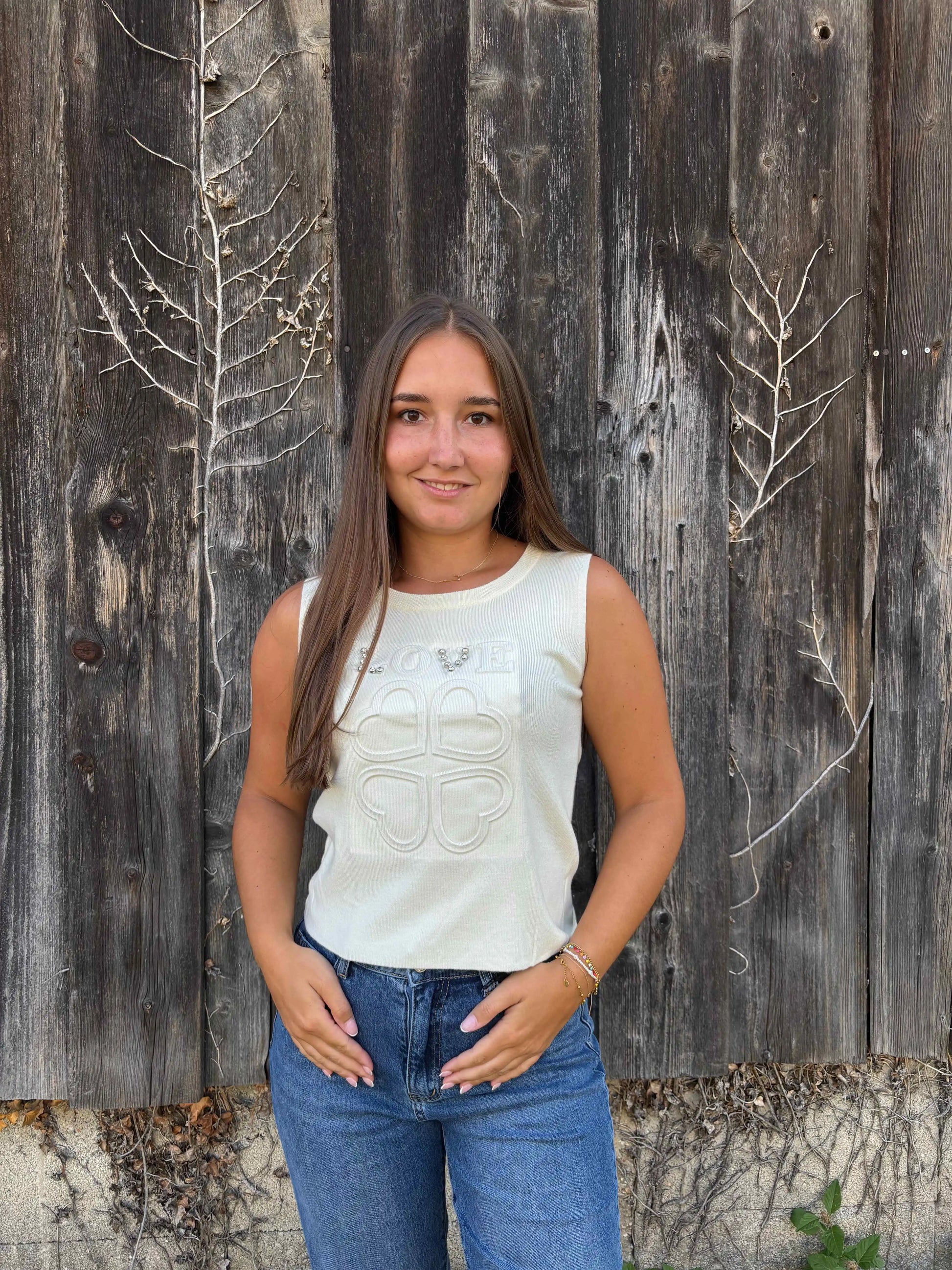 Dieses ärmellose Top setzt ein dezentes Statement mit einem stilvoll eingearbeiteten 3D-Relief-Print in Form eines stilisierten Kleeblatts und dem Schriftzug "LOVE". Die klare Silhouette und das anschmiegsame Material machen es zu einem vielseitigen Begleiter – ob casual zur Jeans oder elegant unter einem Blazer.
