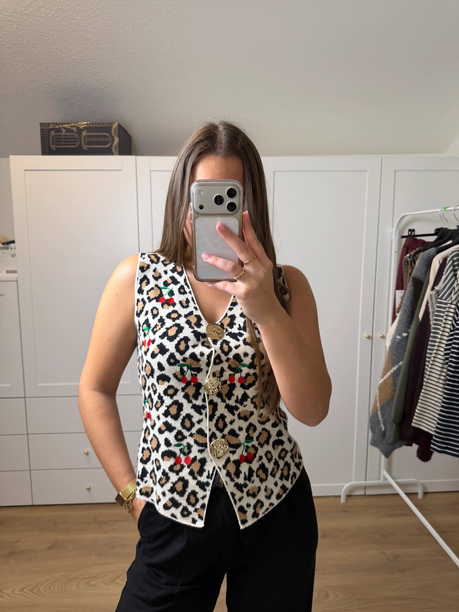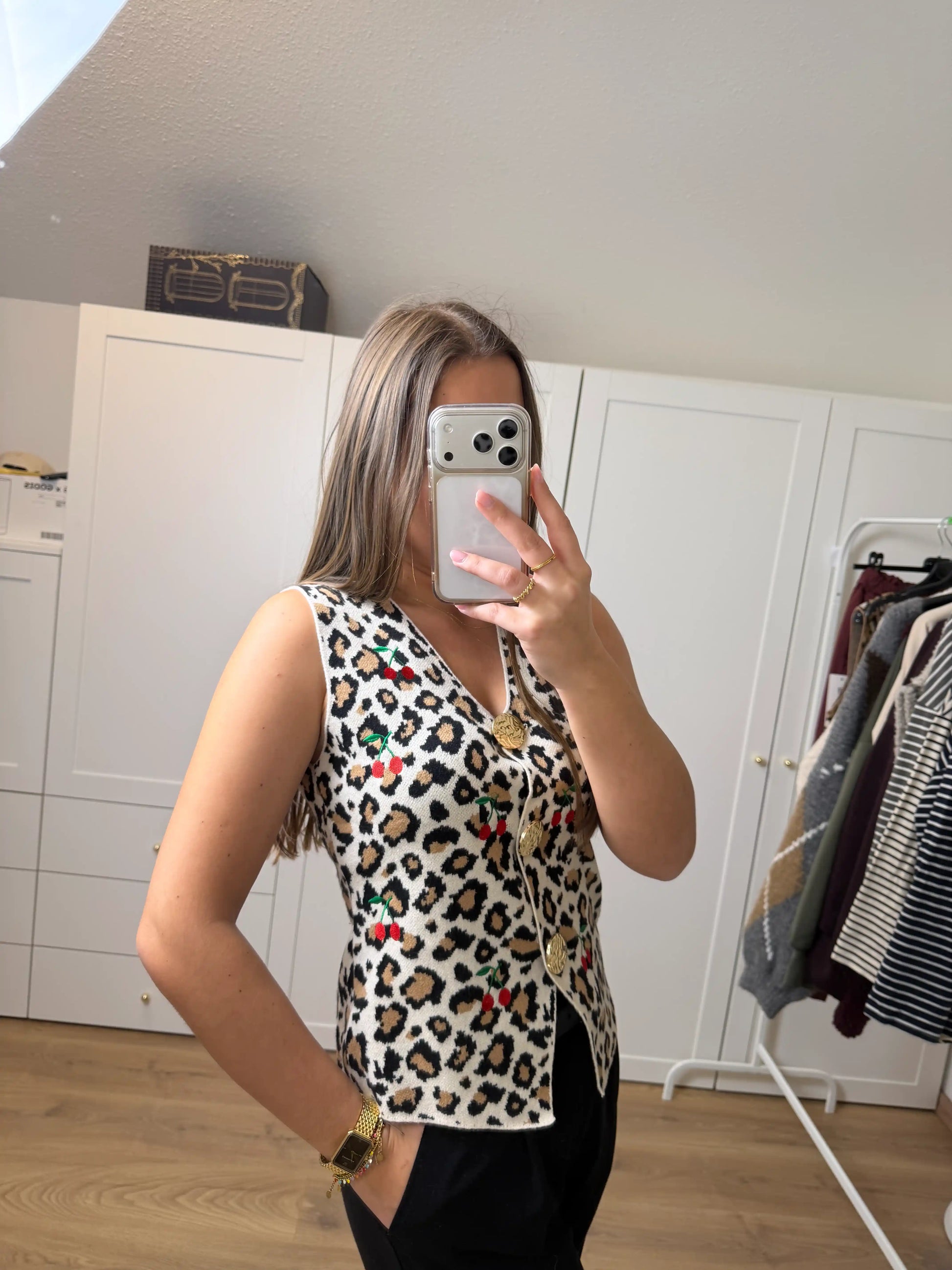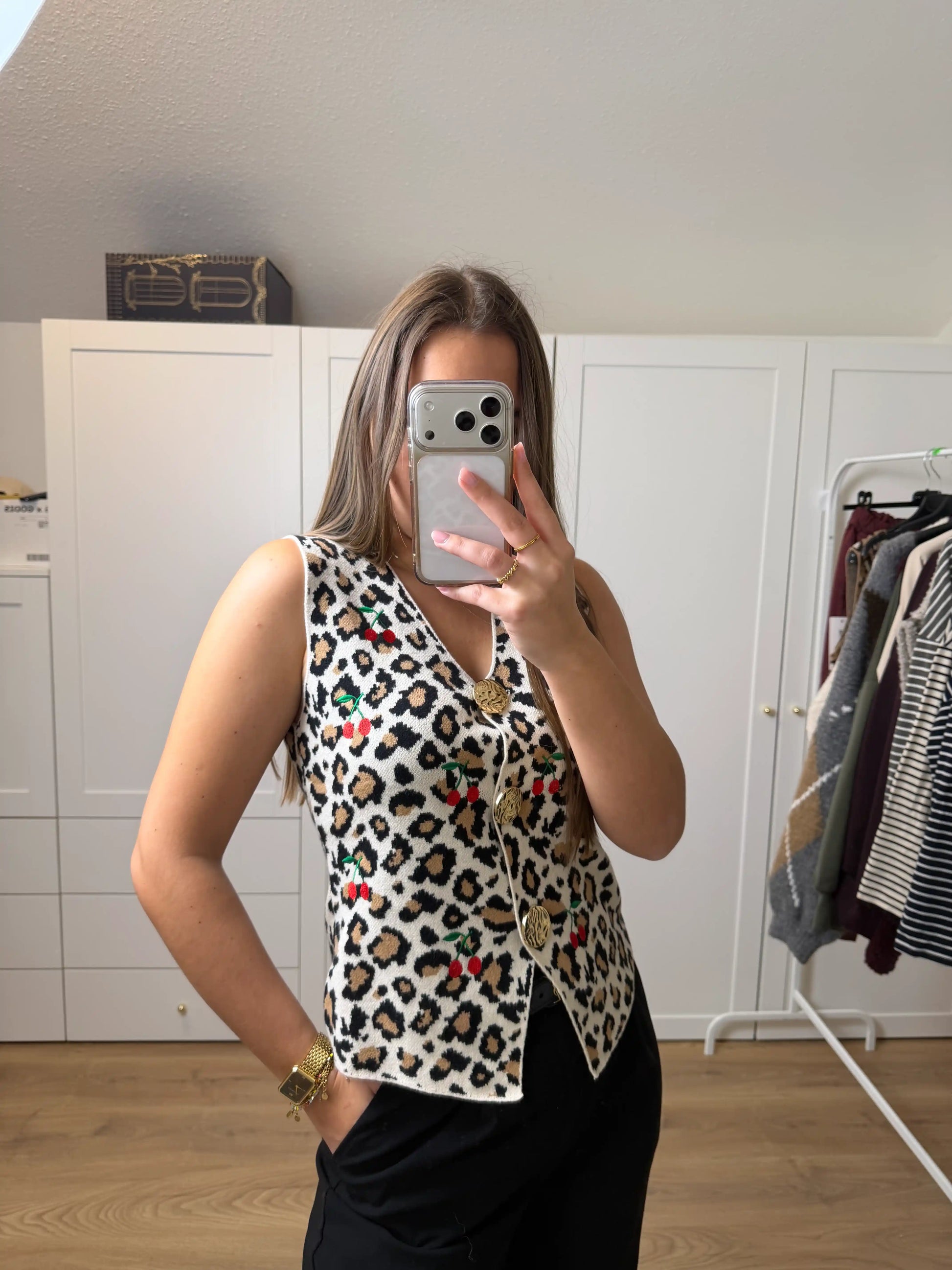 Auffällige Strickweste mit angesagtem Leo-Muster, kombiniert mit verspielten Kirschstickereien. Goldene Knöpfe setzen einen eleganten Akzent und machen die Weste zu einem echten Statement-Piece – perfekt zum Aufwerten schlichter Outfits.