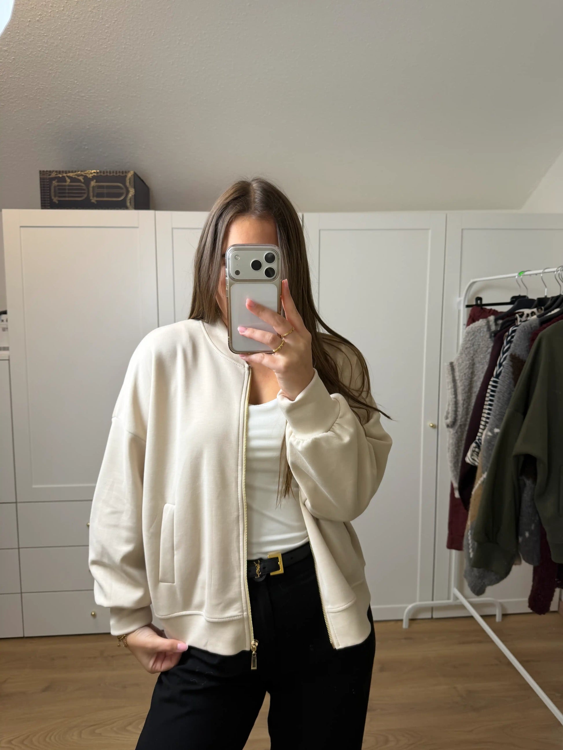 Leichte Zip-Jacke in trendigem Olivgrün mit goldenen Zipper-Details. Der lockere Schnitt und die sanft puffigen Ärmel verleihen ihr einen modernen, sportlich-eleganten Look. Perfekt für Alltagsoutfits und als vielseitiges Layering-Piece.