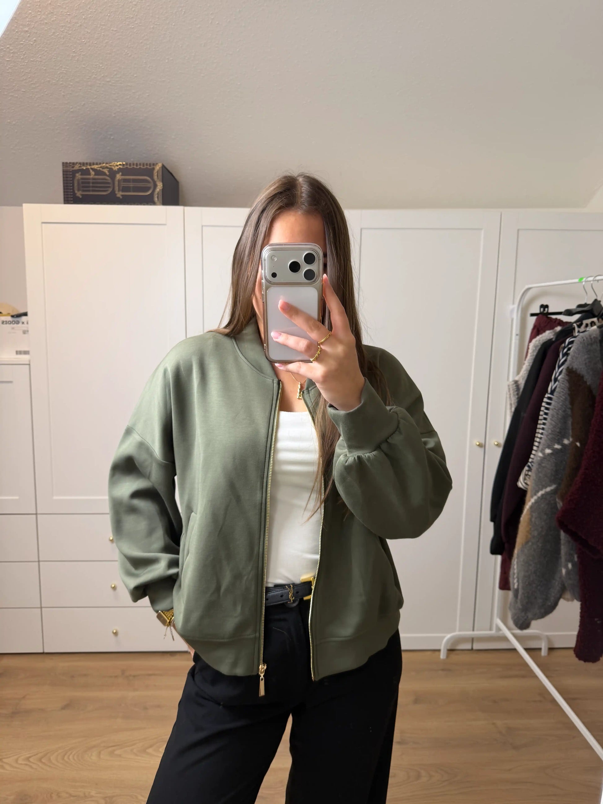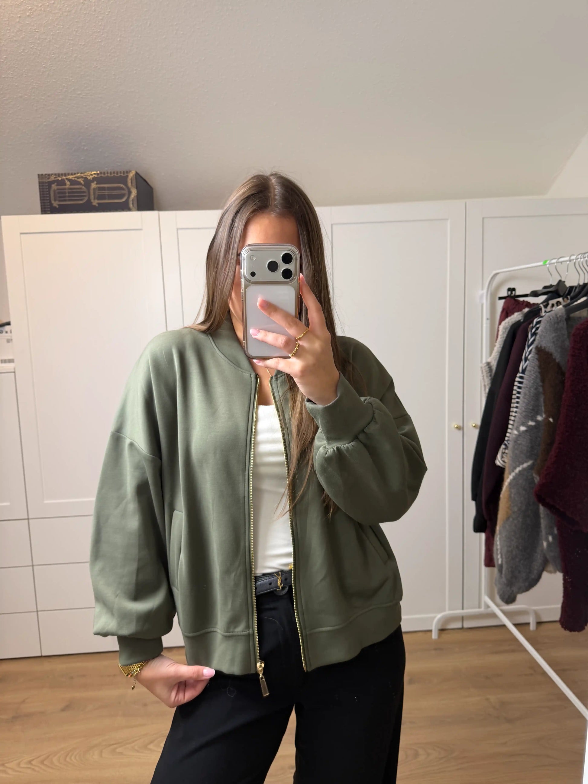 Leichte Zip-Jacke in trendigem Olivgrün mit goldenen Zipper-Details. Der lockere Schnitt und die sanft puffigen Ärmel verleihen ihr einen modernen, sportlich-eleganten Look. Perfekt für Alltagsoutfits und als vielseitiges Layering-Piece.